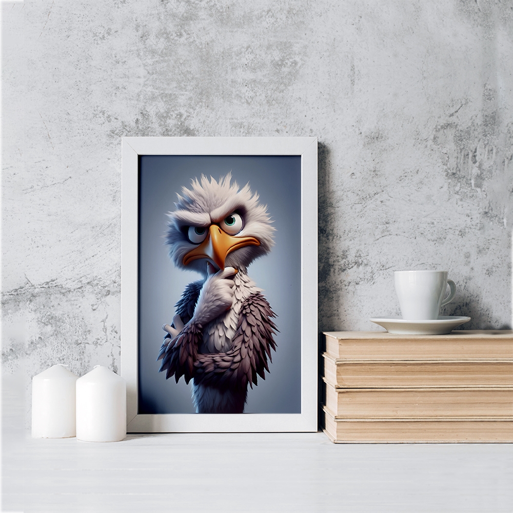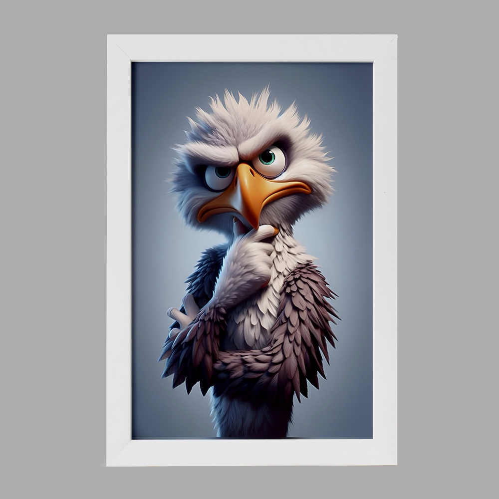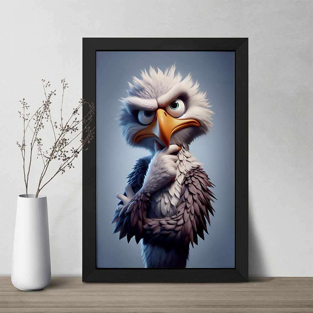 تابلو یا قاب عکس عقاب متفکر خندالو در ابعاد مختلف با استفاده از بهترین برند پروفیل پی وی سی دو سانتی متری بسیار مرغوب، تولید شده اند و در مونتاژ و نصب آنها نهایت دقت در قرارگیری هر چه دقیق تر لبه ها به یکدیگر صورت گرفته است. همچنین در پشت قاب ها گیره ای برای اتصال راحت به دیوار تعبیه شده است. چاپ طرح تابلوی عقاب متفکر با بالاترین کیفیت بوسیله چاپگرهای دیجیتال شش رنگ و کاغذ با کیفیت عکاسی انجام شده و بر روی آن شیشه ای با کیفیت و شفاف در سطح قاب قرار گرفته که از کاغذ عکس محافظت میکند. بسته بندی تابلوها جعبه های مقاوم و محکمی بوده که علاوه بر محافظتی که از بدنه قاب می کند، ظاهر جذابی دارد و تابلوی عقاب متفکر را بدل به محصولی مناسب هدیه کرده است. تابلوهای خندالو با تنوع طرحی بسیار بالا شامل تابلو های دکوراتیو قابل استفاده در اتاق کودک، محل کار و منازل می باشد که سلیقه هر مخاطبی را پوشش می دهد، ضمن اینکه امکان تعویض عکس موجود در قاب وجود داشته و می توان عکس های خانوادگی و … را نیز در آن قرار داد.