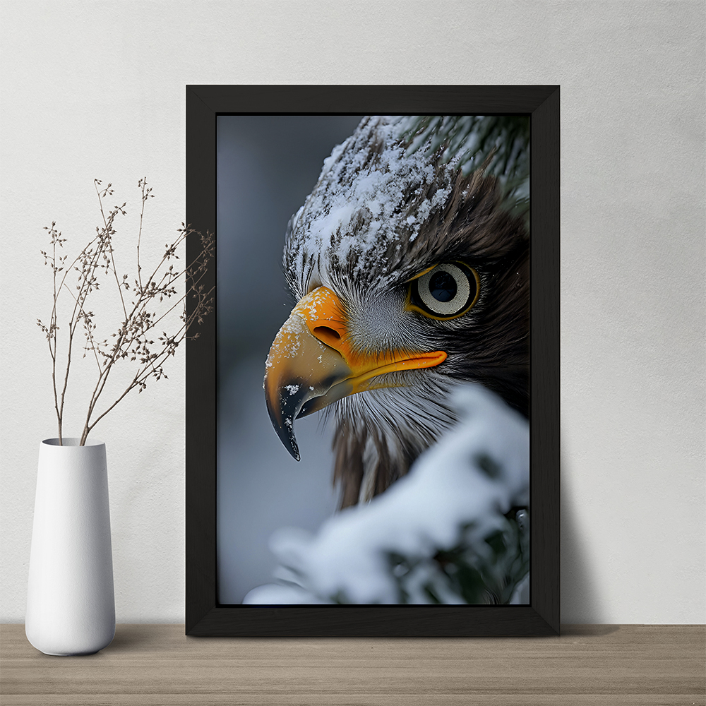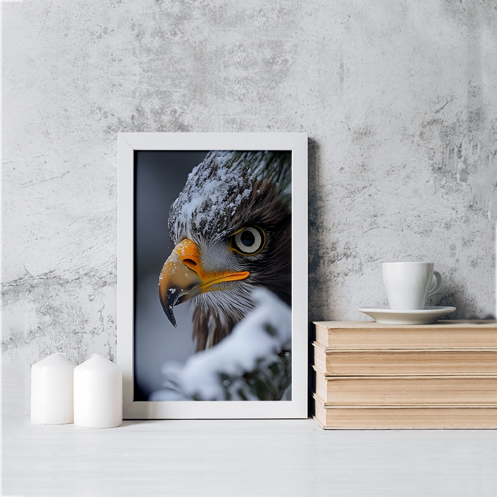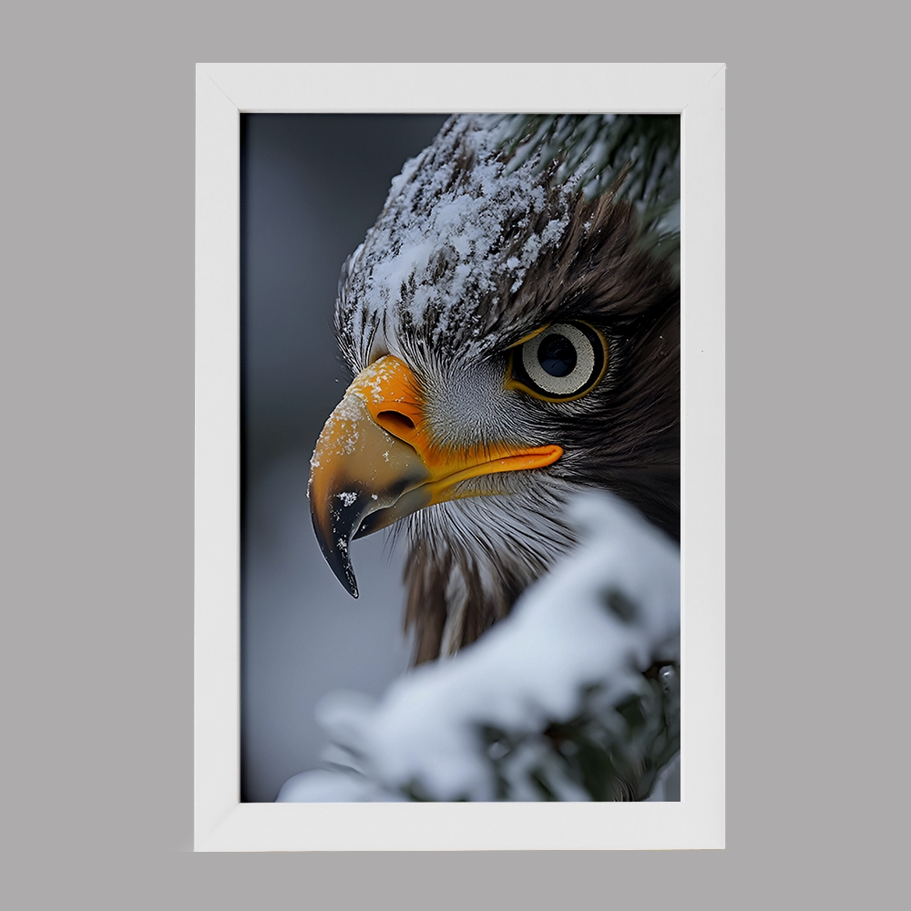 تابلو یا قاب عکس عقاب خندالو در ابعاد مختلف با استفاده از بهترین برند پروفیل پی وی سی دو سانتی متری بسیار مرغوب، تولید شده اند و در مونتاژ و نصب آنها نهایت دقت در قرارگیری هر چه دقیق تر لبه ها به یکدیگر صورت گرفته است. همچنین در پشت قاب ها گیره ای برای اتصال راحت به دیوار تعبیه شده است.