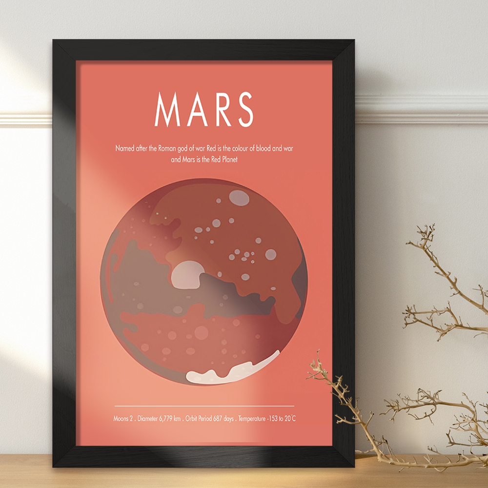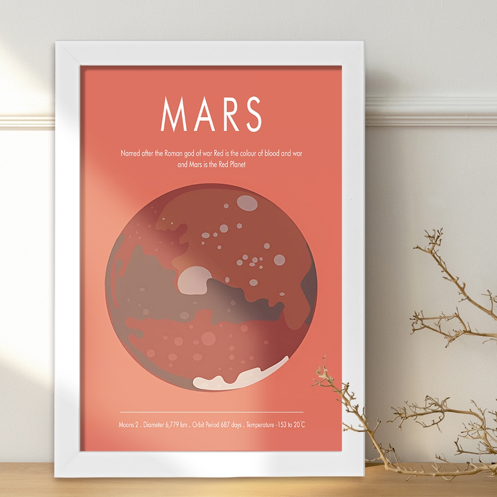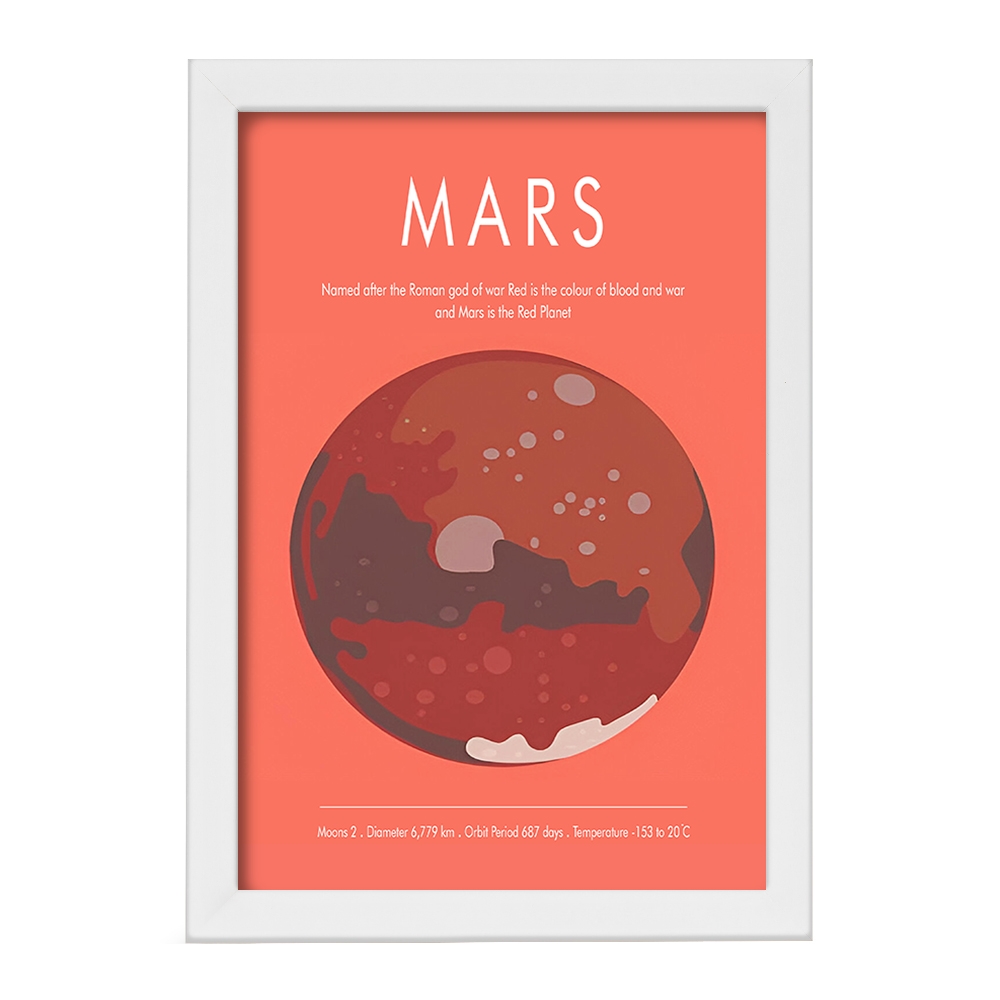 تابلو یا قاب عکس مریخ (Mars) خندالو در ابعاد مختلف با استفاده از بهترین برند پروفیل پی وی سی دو سانتی متری بسیار مرغوب، تولید شده اند و در مونتاژ و نصب آنها نهایت دقت در قرارگیری هر چه دقیق تر لبه ها به یکدیگر صورت گرفته است. همچنین در پشت قاب ها گیره ای برای اتصال راحت به دیوار تعبیه شده است. چاپ طرح تابلوی مریخ (Mars) با بالاترین کیفیت بوسیله چاپگرهای دیجیتال شش رنگ و کاغذ با کیفیت عکاسی انجام شده و بر روی آن شیشه ای با کیفیت و شفاف در سطح قاب قرار گرفته که از کاغذ عکس محافظت میکند. بسته بندی تابلوها جعبه های مقاوم و محکمی بوده که علاوه بر محافظتی که از بدنه قاب می کند، ظاهر جذابی دارد و تابلوی مریخ (Mars) را بدل به محصولی مناسب هدیه کرده است. تابلوهای خندالو با تنوع طرحی بسیار بالا شامل تابلو های دکوراتیو قابل استفاده در اتاق کودک، محل کار و منازل می باشد که سلیقه هر مخاطبی را پوشش می دهد، ضمن اینکه امکان تعویض عکس موجود در قاب وجود داشته و می توان عکس های خانوادگی و … را نیز در آن قرار داد.
