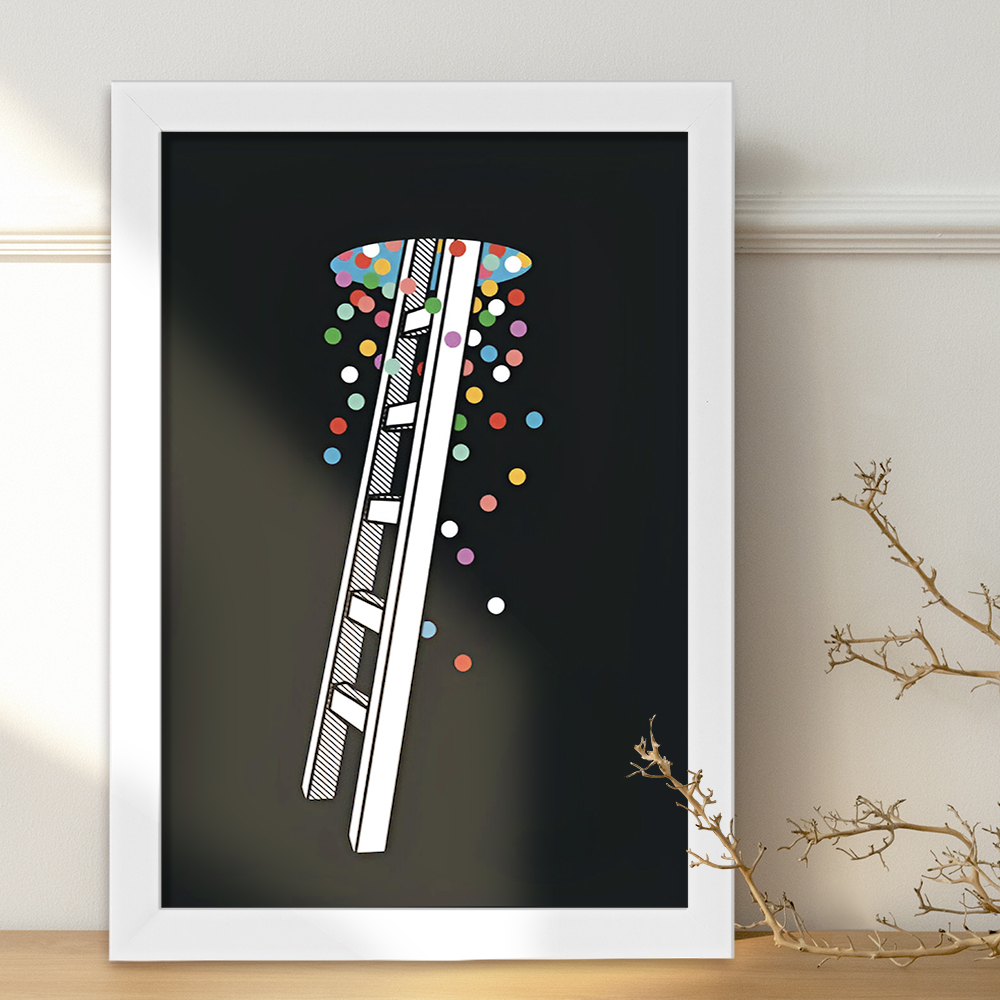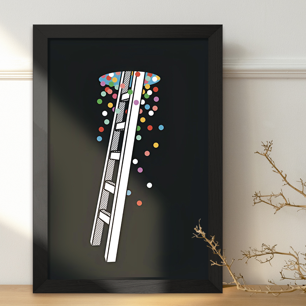 تابلو یا قاب عکس نردبان خندالو در ابعاد مختلف با استفاده از بهترین برند پروفیل پی وی سی دو سانتی متری بسیار مرغوب، تولید شده اند و در مونتاژ و نصب آنها نهایت دقت در قرارگیری هر چه دقیق تر لبه ها به یکدیگر صورت گرفته است. همچنین در پشت قاب ها گیره ای برای اتصال راحت به دیوار تعبیه شده است. چاپ طرح تابلوی نردبان با بالاترین کیفیت بوسیله چاپگرهای دیجیتال شش رنگ و کاغذ با کیفیت عکاسی انجام شده و بر روی آن شیشه ای با کیفیت و شفاف در سطح قاب قرار گرفته که از کاغذ عکس محافظت میکند. بسته بندی تابلوها جعبه های مقاوم و محکمی بوده که علاوه بر محافظتی که از بدنه قاب می کند، ظاهر جذابی دارد و تابلوی نردبان را بدل به محصولی مناسب هدیه کرده است. تابلوهای خندالو با تنوع طرحی بسیار بالا شامل تابلو های دکوراتیو قابل استفاده در اتاق کودک، محل کار و منازل می باشد که سلیقه هر مخاطبی را پوشش می دهد، ضمن اینکه امکان تعویض عکس موجود در قاب وجود داشته و می توان عکس های خانوادگی و … را نیز در آن قرار داد.