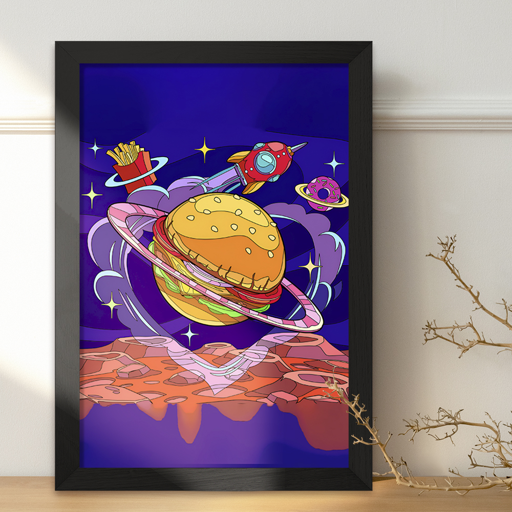 تابلو یا قاب عکس همبرگر فضایی خندالو در ابعاد مختلف با استفاده از بهترین برند پروفیل پی وی سی دو سانتی متری بسیار مرغوب، تولید شده اند و در مونتاژ و نصب آنها نهایت دقت در قرارگیری هر چه دقیق تر لبه ها به یکدیگر صورت گرفته است. همچنین در پشت قاب ها گیره ای برای اتصال راحت به دیوار تعبیه شده است. چاپ طرح تابلوی همبرگر فضایی با بالاترین کیفیت بوسیله چاپگرهای دیجیتال شش رنگ و کاغذ با کیفیت عکاسی انجام شده و بر روی آن شیشه ای با کیفیت و شفاف در سطح قاب قرار گرفته که از کاغذ عکس محافظت میکند. بسته بندی تابلوها جعبه های مقاوم و محکمی بوده که علاوه بر محافظتی که از بدنه قاب می کند، ظاهر جذابی دارد و تابلوی همبرگر فضایی را بدل به محصولی مناسب هدیه کرده است. تابلوهای خندالو با تنوع طرحی بسیار بالا شامل تابلو های دکوراتیو قابل استفاده در اتاق کودک، محل کار و منازل می باشد که سلیقه هر مخاطبی را پوشش می دهد، ضمن اینکه امکان تعویض عکس موجود در قاب وجود داشته و می توان عکس های خانوادگی و … را نیز در آن قرار داد.