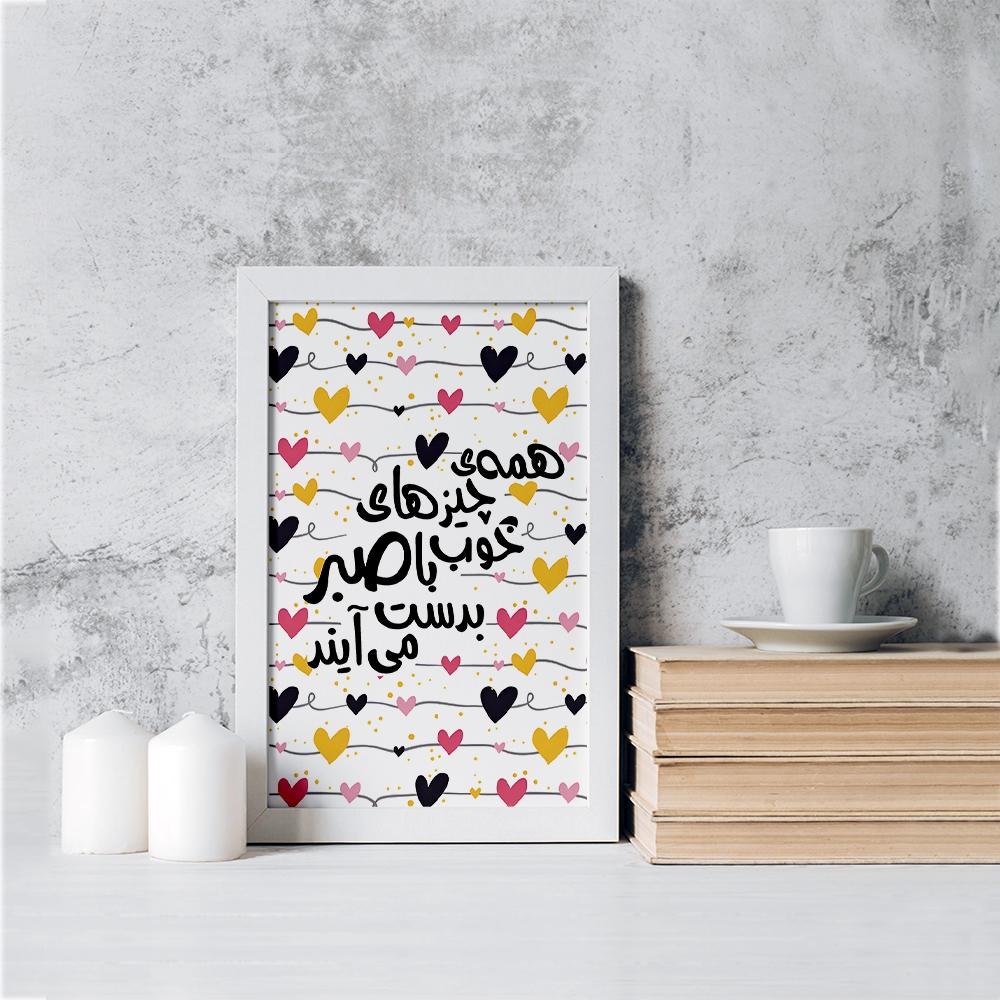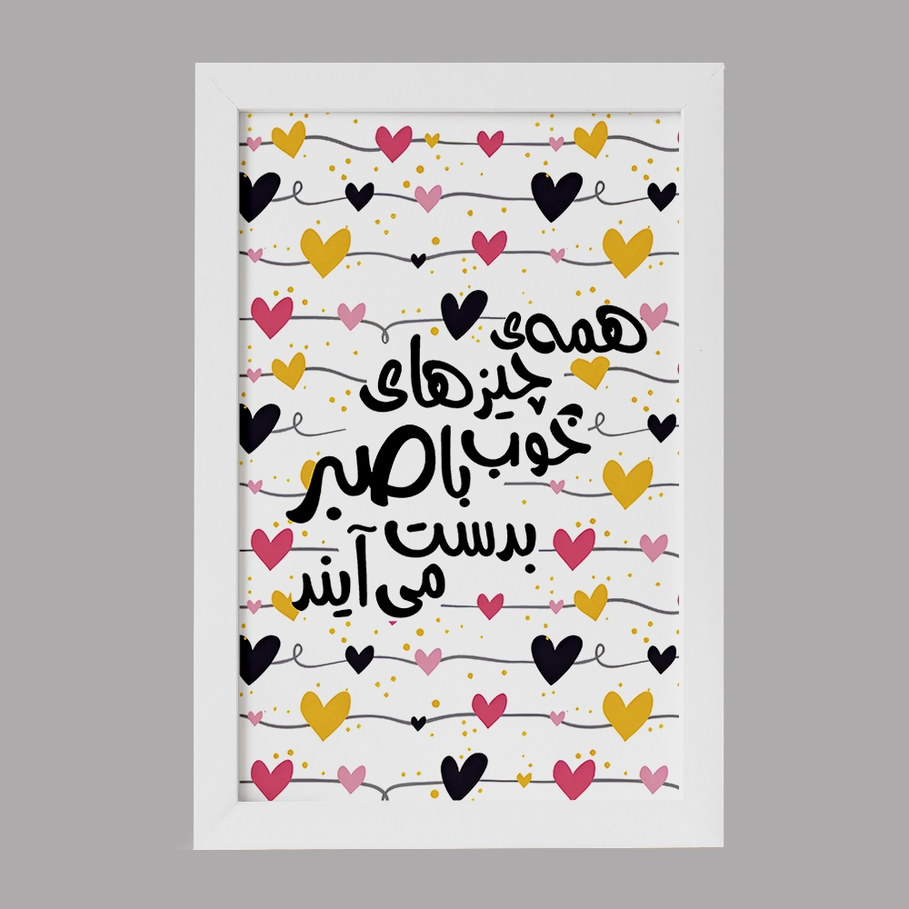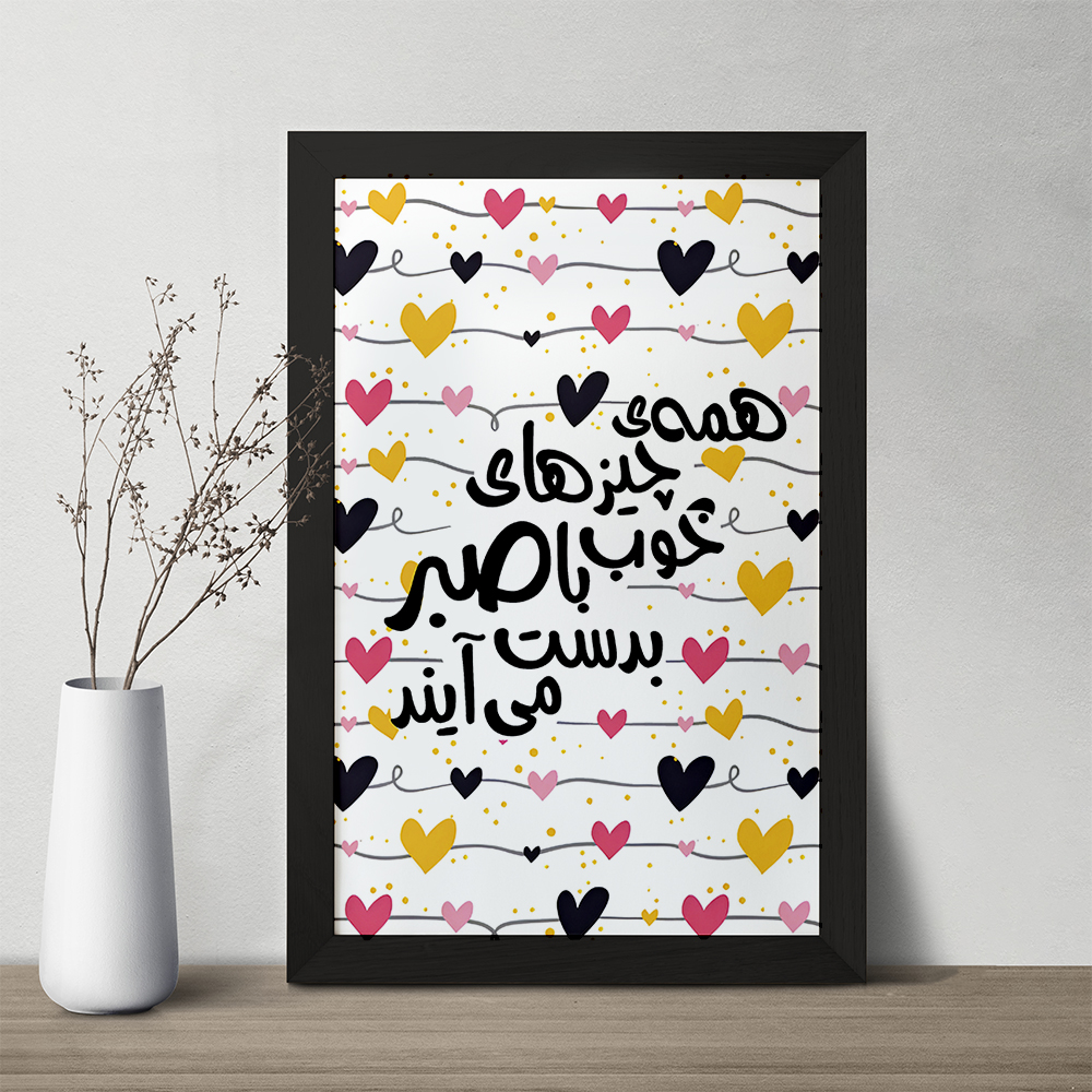 تابلو یا قاب عکس همه ی چیزهای خوب با صبر به دست می آیند خندالو در ابعاد مختلف با استفاده از بهترین برند پروفیل پی وی سی دو سانتی متری بسیار مرغوب، تولید شده اند و در مونتاژ و نصب آنها نهایت دقت در قرارگیری هر چه دقیق تر لبه ها به یکدیگر صورت گرفته است. همچنین در پشت قاب ها گیره ای برای اتصال راحت به دیوار تعبیه شده است. چاپ طرح تابلوی همه ی چیزهای خوب با صبر به دست می آیند با بالاترین کیفیت بوسیله چاپگرهای دیجیتال شش رنگ و کاغذ با کیفیت عکاسی انجام شده و بر روی آن شیشه ای با کیفیت و شفاف در سطح قاب قرار گرفته که از کاغذ عکس محافظت میکند. بسته بندی تابلوها جعبه های مقاوم و محکمی بوده که علاوه بر محافظتی که از بدنه قاب می کند، ظاهر جذابی دارد و تابلوی همه ی چیزهای خوب با صبر به دست می آیند را بدل به محصولی مناسب هدیه کرده است. تابلوهای خندالو با تنوع طرحی بسیار بالا شامل تابلو های دکوراتیو قابل استفاده در اتاق کودک، محل کار و منازل می باشد که سلیقه هر مخاطبی را پوشش می دهد، ضمن اینکه امکان تعویض عکس موجود در قاب وجود داشته و می توان عکس های خانوادگی و … را نیز در آن قرار داد.