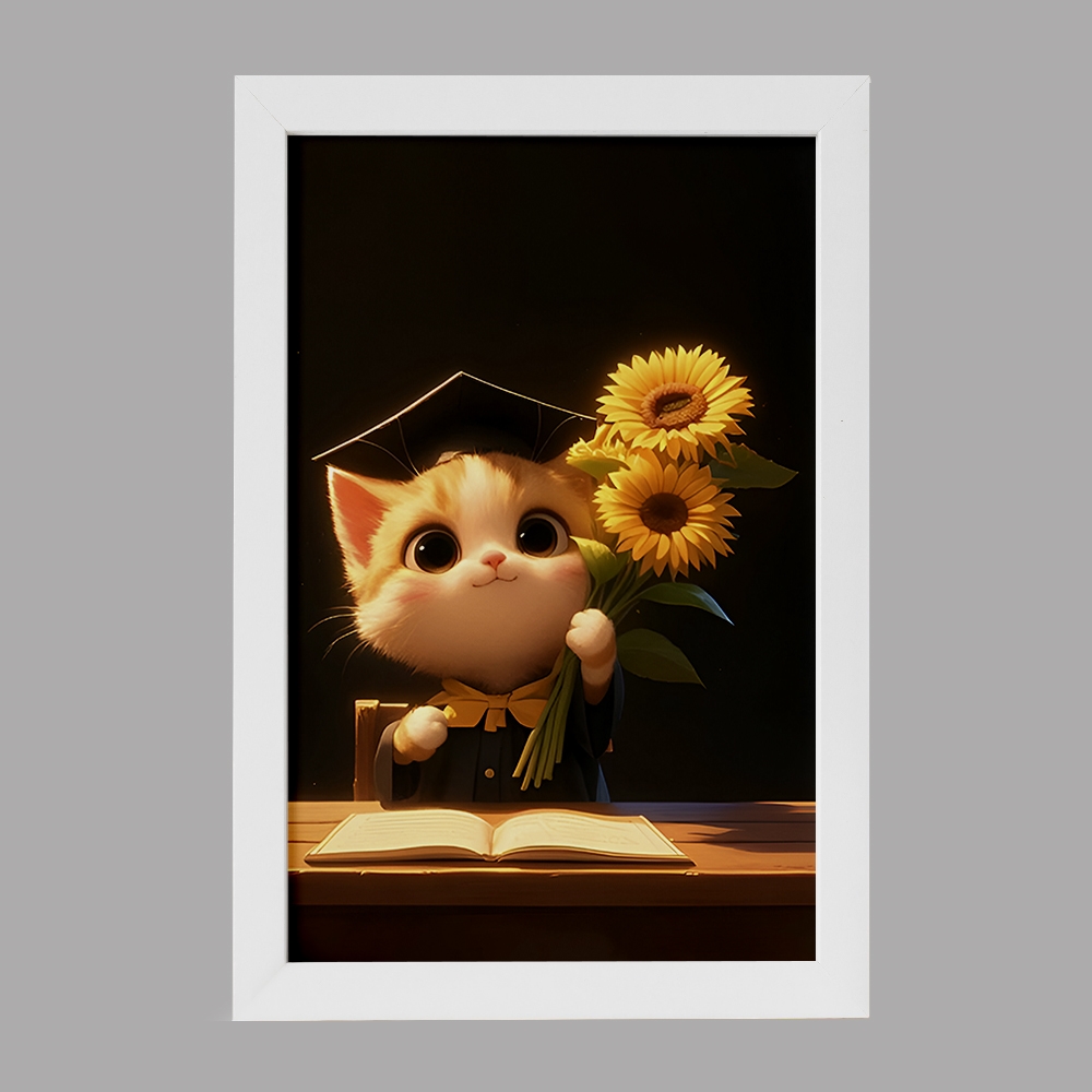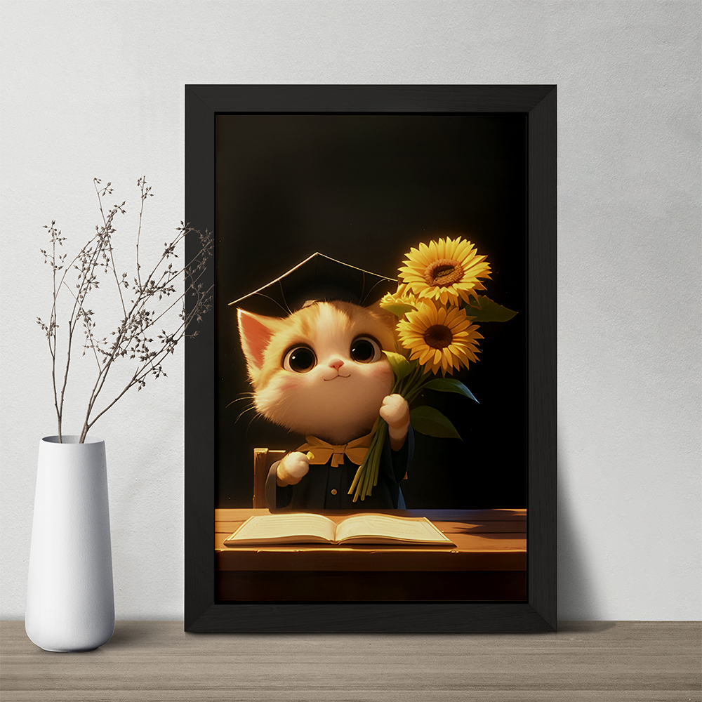 تابلو یا قاب عکس گربه فارغ التحصیل خندالو در ابعاد مختلف با استفاده از بهترین برند پروفیل پی وی سی دو سانتی متری بسیار مرغوب، تولید شده اند و در مونتاژ و نصب آنها نهایت دقت در قرارگیری هر چه دقیق تر لبه ها به یکدیگر صورت گرفته است. همچنین در پشت قاب ها گیره ای برای اتصال راحت به دیوار تعبیه شده است. چاپ طرح تابلوی گربه فارغ التحصیل با بالاترین کیفیت بوسیله چاپگرهای دیجیتال شش رنگ و کاغذ با کیفیت عکاسی انجام شده و بر روی آن شیشه ای با کیفیت و شفاف در سطح قاب قرار گرفته که از کاغذ عکس محافظت میکند. بسته بندی تابلوها جعبه های مقاوم و محکمی بوده که علاوه بر محافظتی که از بدنه قاب می کند، ظاهر جذابی دارد و تابلوی گربه فارغ التحصیل را بدل به محصولی مناسب هدیه کرده است. تابلوهای خندالو با تنوع طرحی بسیار بالا شامل تابلو های دکوراتیو قابل استفاده در اتاق کودک، محل کار و منازل می باشد که سلیقه هر مخاطبی را پوشش می دهد، ضمن اینکه امکان تعویض عکس موجود در قاب وجود داشته و می توان عکس های خانوادگی و … را نیز در آن قرار داد.