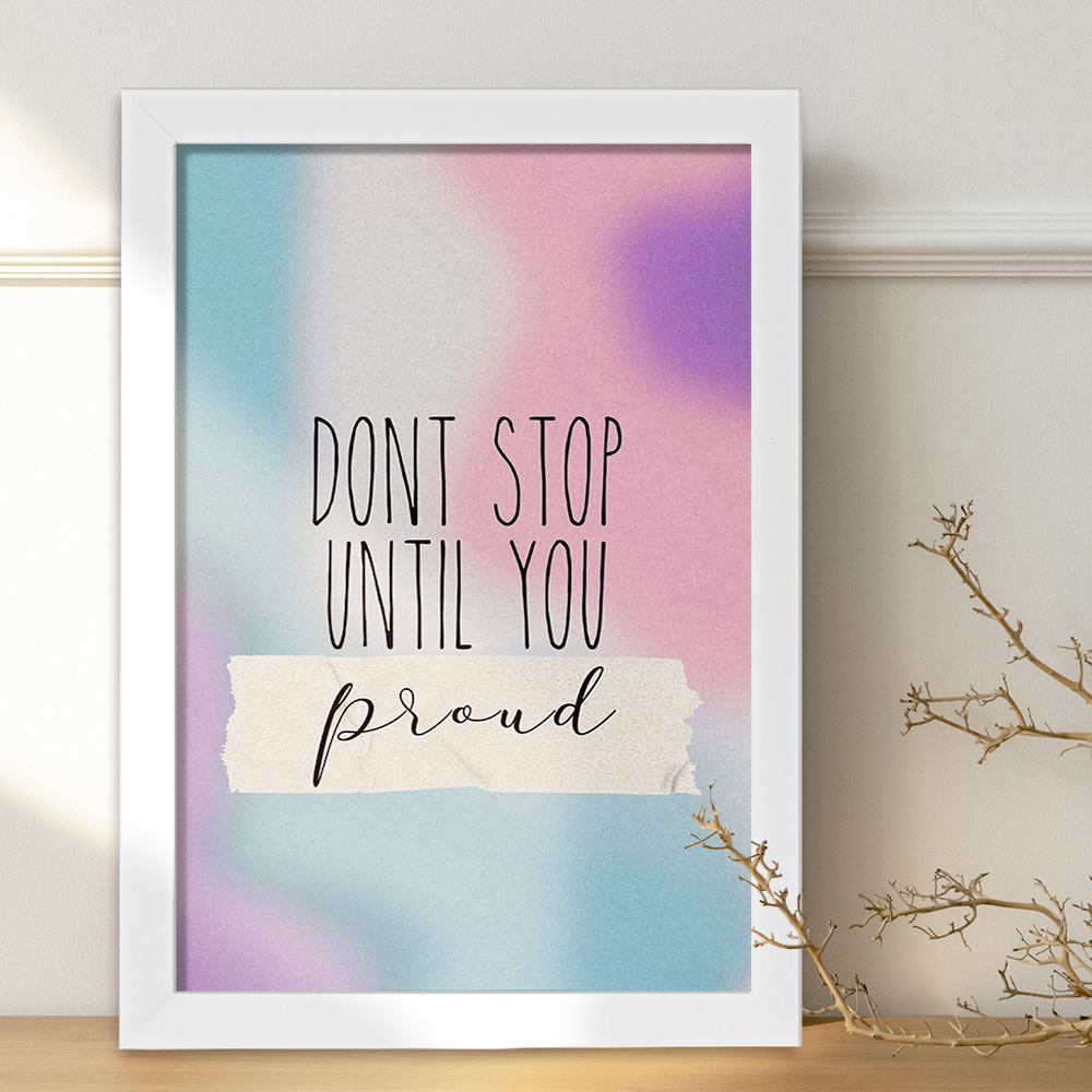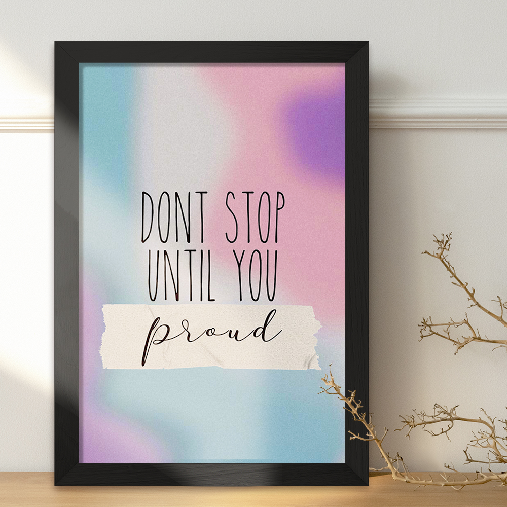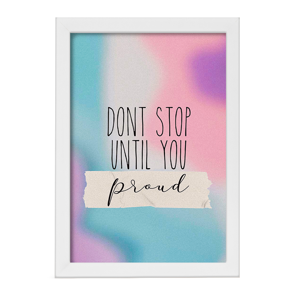تابلو یا قاب عکس Don’t Stop Until You Psoud خندالو در ابعاد مختلف با استفاده از بهترین برند پروفیل پی وی سی دو سانتی متری بسیار مرغوب، تولید شده اند و در مونتاژ و نصب آنها نهایت دقت در قرارگیری هر چه دقیق تر لبه ها به یکدیگر صورت گرفته است. همچنین در پشت قاب ها گیره ای برای اتصال راحت به دیوار تعبیه شده است. چاپ طرح تابلوی Don’t Stop Until You Psoud با بالاترین کیفیت بوسیله چاپگرهای دیجیتال شش رنگ و کاغذ با کیفیت عکاسی انجام شده و بر روی آن شیشه ای با کیفیت و شفاف در سطح قاب قرار گرفته که از کاغذ عکس محافظت میکند. بسته بندی تابلوها جعبه های مقاوم و محکمی بوده که علاوه بر محافظتی که از بدنه قاب می کند، ظاهر جذابی دارد و تابلوی Don’t Stop Until You Psoud را بدل به محصولی مناسب هدیه کرده است. تابلوهای خندالو با تنوع طرحی بسیار بالا شامل تابلو های دکوراتیو قابل استفاده در اتاق کودک، محل کار و منازل می باشد که سلیقه هر مخاطبی را پوشش می دهد، ضمن اینکه امکان تعویض عکس موجود در قاب وجود داشته و می توان عکس های خانوادگی و … را نیز در آن قرار داد.