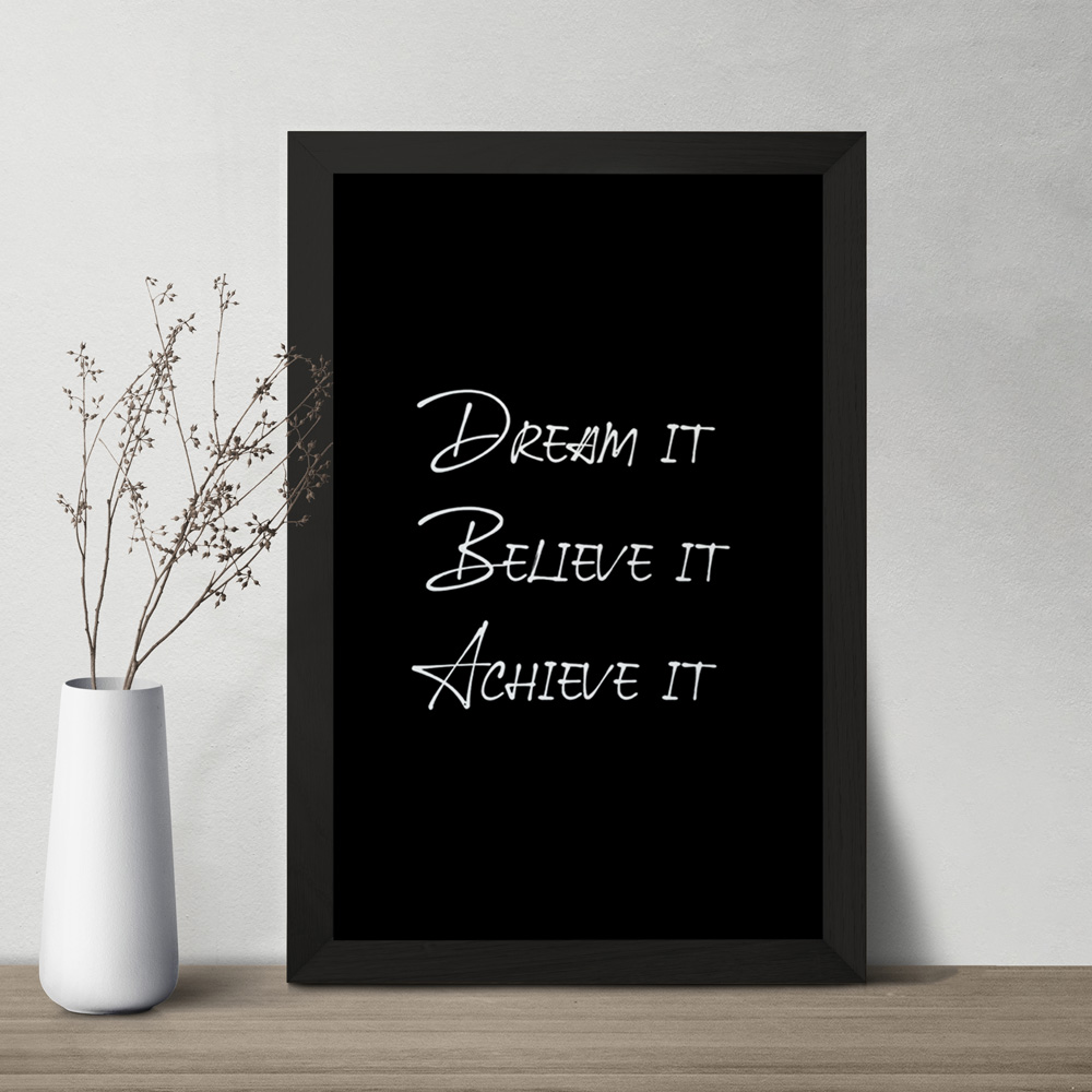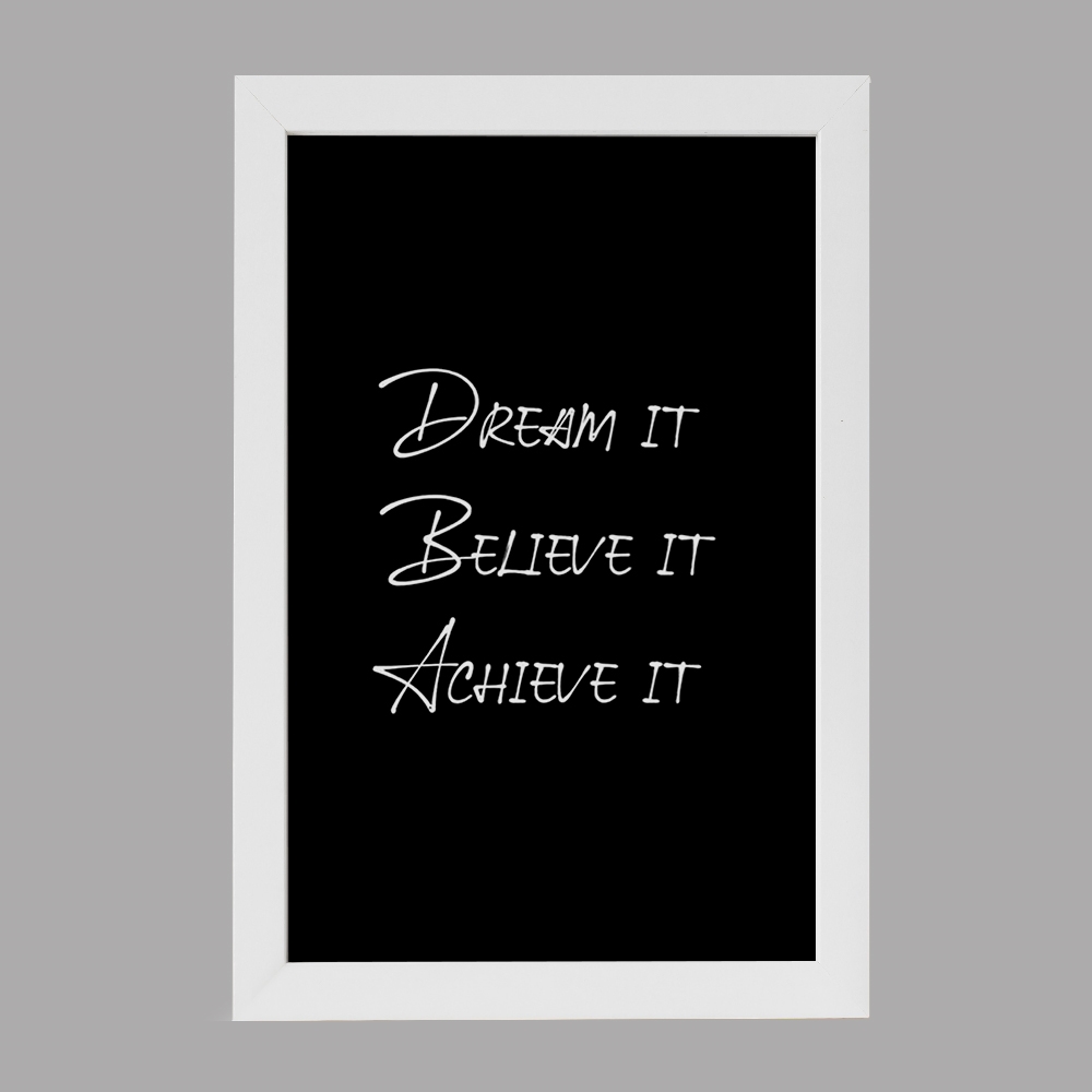 تابلو یا قاب عکس Dream It Believe It Achieve It خندالو در ابعاد مختلف با استفاده از بهترین برند پروفیل پی وی سی دو سانتی متری بسیار مرغوب، تولید شده اند و در مونتاژ و نصب آنها نهایت دقت در قرارگیری هر چه دقیق تر لبه ها به یکدیگر صورت گرفته است. همچنین در پشت قاب ها گیره ای برای اتصال راحت به دیوار تعبیه شده است. چاپ طرح تابلوی Dream It Believe It Achieve It با بالاترین کیفیت بوسیله چاپگرهای دیجیتال شش رنگ و کاغذ با کیفیت عکاسی انجام شده و بر روی آن شیشه ای با کیفیت و شفاف در سطح قاب قرار گرفته که از کاغذ عکس محافظت میکند. بسته بندی تابلوها جعبه های مقاوم و محکمی بوده که علاوه بر محافظتی که از بدنه قاب می کند، ظاهر جذابی دارد و تابلوی Dream It Believe It Achieve It را بدل به محصولی مناسب هدیه کرده است. تابلوهای خندالو با تنوع طرحی بسیار بالا شامل تابلو های دکوراتیو قابل استفاده در اتاق کودک، محل کار و منازل می باشد که سلیقه هر مخاطبی را پوشش می دهد، ضمن اینکه امکان تعویض عکس موجود در قاب وجود داشته و می توان عکس های خانوادگی و … را نیز در آن قرار داد.