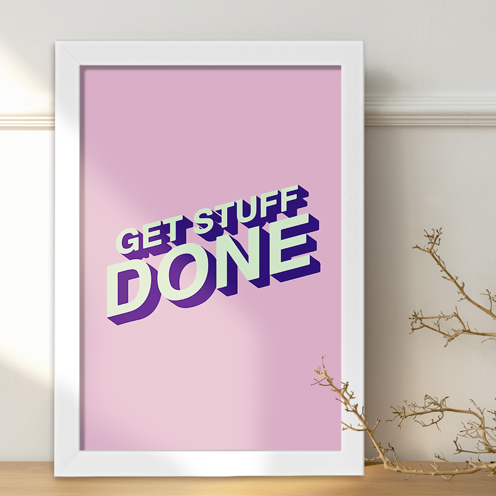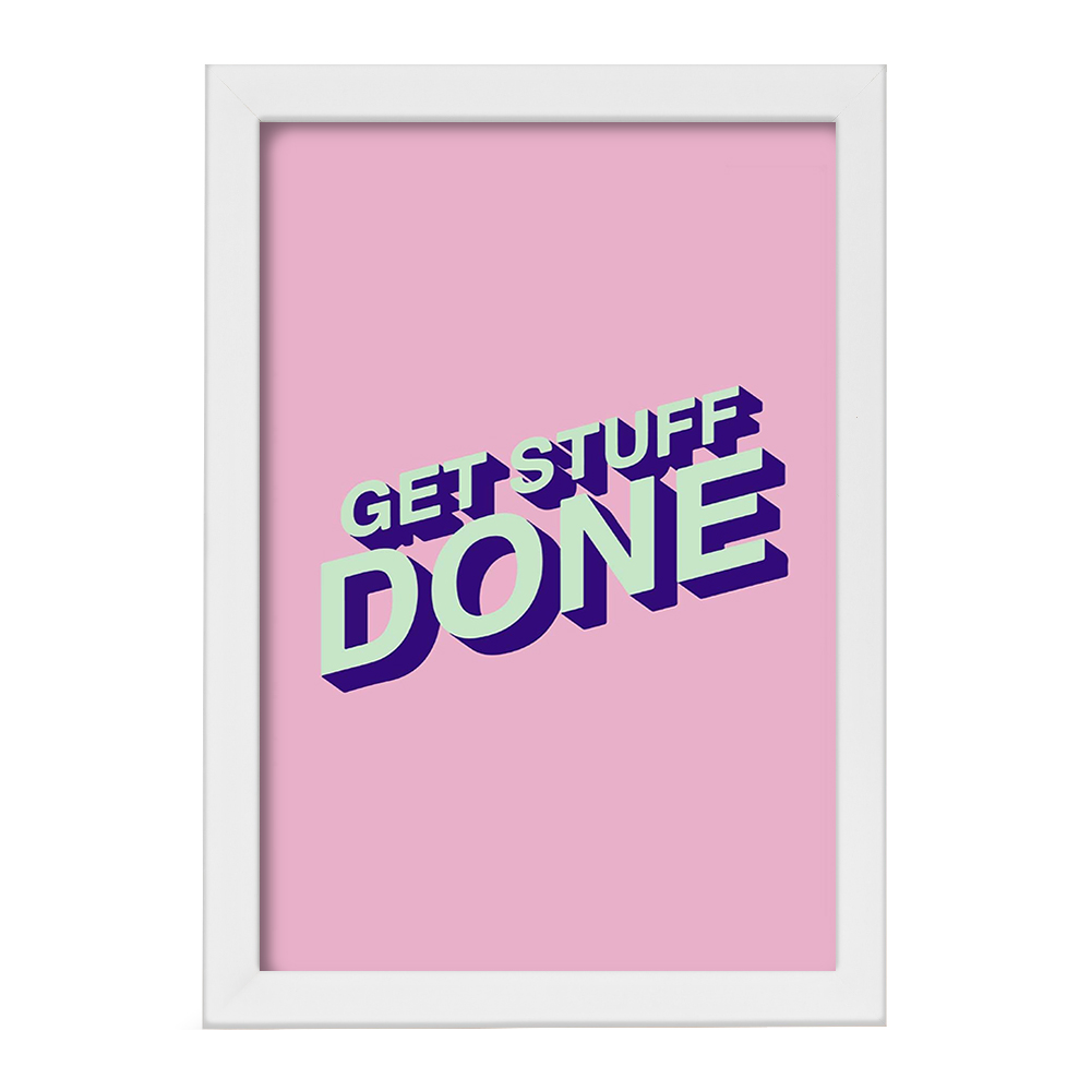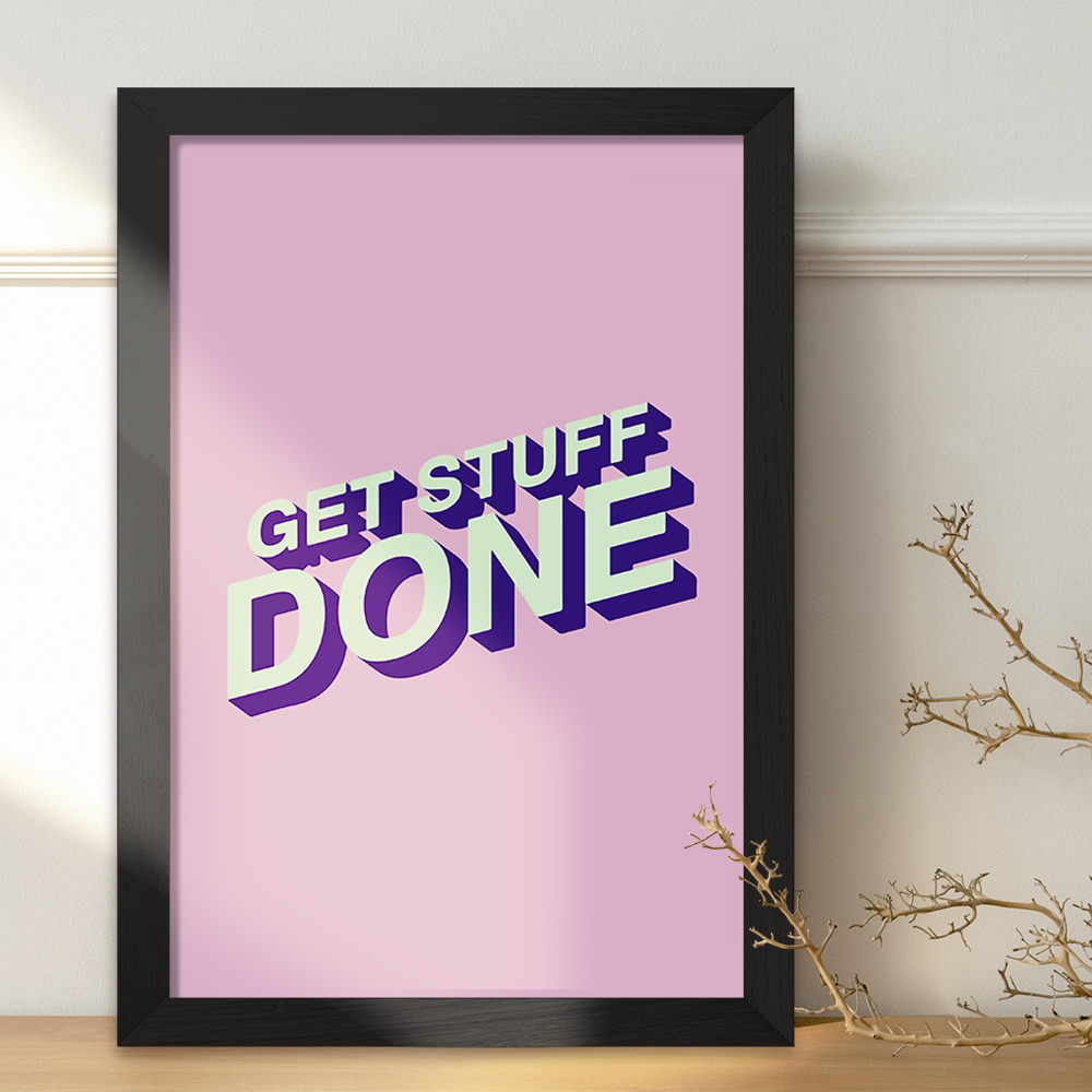 تابلو یا قاب عکس Get Stuff Done خندالو در ابعاد مختلف با استفاده از بهترین برند پروفیل پی وی سی دو سانتی متری بسیار مرغوب، تولید شده اند و در مونتاژ و نصب آنها نهایت دقت در قرارگیری هر چه دقیق تر لبه ها به یکدیگر صورت گرفته است. همچنین در پشت قاب ها گیره ای برای اتصال راحت به دیوار تعبیه شده است. چاپ طرح تابلوی Get Stuff Done با بالاترین کیفیت بوسیله چاپگرهای دیجیتال شش رنگ و کاغذ با کیفیت عکاسی انجام شده و بر روی آن شیشه ای با کیفیت و شفاف در سطح قاب قرار گرفته که از کاغذ عکس محافظت میکند. بسته بندی تابلوها جعبه های مقاوم و محکمی بوده که علاوه بر محافظتی که از بدنه قاب می کند، ظاهر جذابی دارد و تابلوی Get Stuff Done را بدل به محصولی مناسب هدیه کرده است. تابلوهای خندالو با تنوع طرحی بسیار بالا شامل تابلو های دکوراتیو قابل استفاده در اتاق کودک، محل کار و منازل می باشد که سلیقه هر مخاطبی را پوشش می دهد، ضمن اینکه امکان تعویض عکس موجود در قاب وجود داشته و می توان عکس های خانوادگی و … را نیز در آن قرار داد.