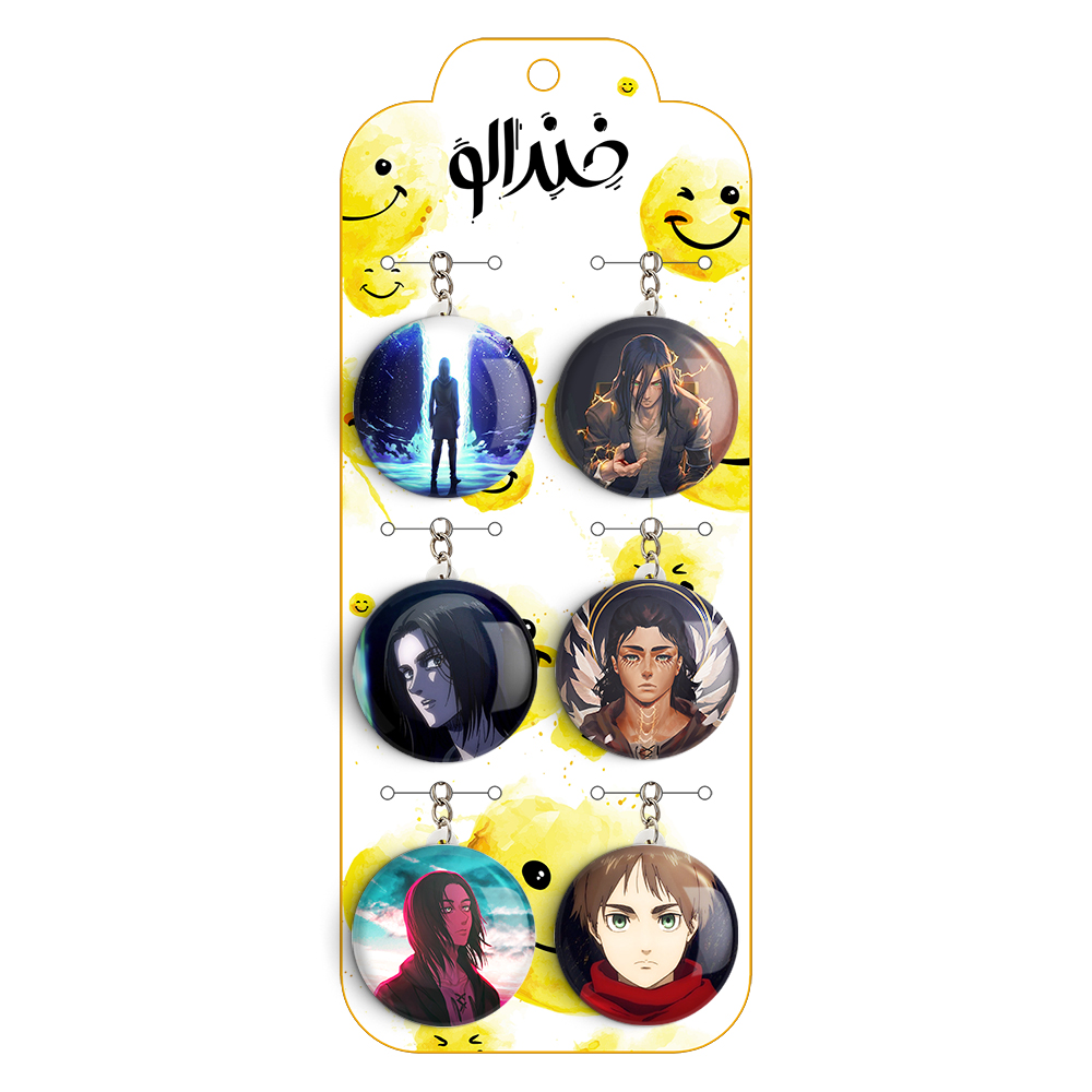 پک 6 عددی جاکلیدی خندالو طرح ارن یگر انیمه اتک آن تایتان با استفاده از روکش سلفون حرارتی مات ضدخش تولید شده که خاصیت ضدخش بودن آن عمر مفید استفاده از جاکلیدی ها را افزایش میدهد. چاپ جاکلیدی ها با دستگاه های استاندارد و با بهترین سطح کیفیت صورت گرفته و طرح با شفافیتی مثال زدنی و با سلفون چسبی تولید شده است که باعث شده محصول نهایی بدون شکست نور دیده شود. همچنین بسته بندی جذاب و مینیمال جاکلیدی ها، آنها را محصولی مناسب هدیه کرده است. زنجیر و حلقه بکار برده شده در جاکلیدی خندالو از نوع حلقه درجه یک و ضخیم و محکم بوده و حین استفاده آسیب نمی بیند. قطعی پشتی جاکلیدی از جنس ABS شفاف سفید رنگ تولید شده که در مقابل خط و خش مقاوم بوده و به هیچ عنوان دچار شکستگی نخواهد شد.