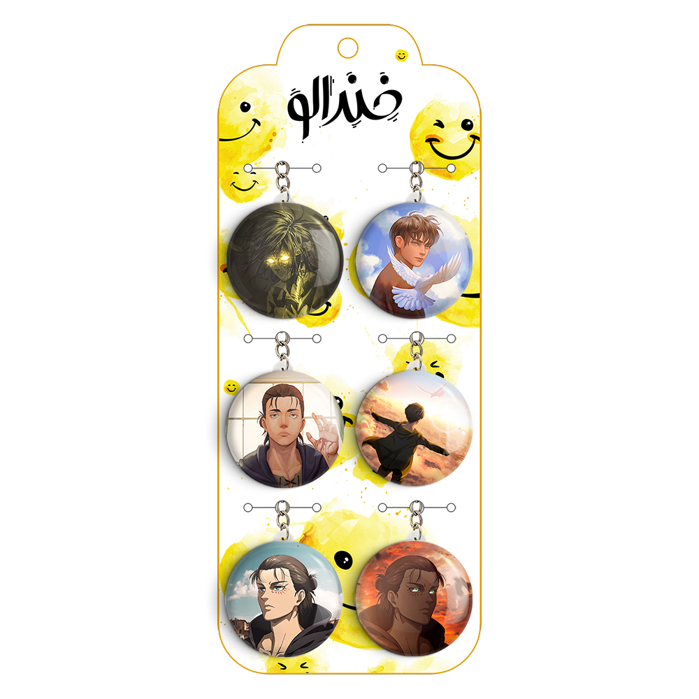 پک 6 عددی جاکلیدی خندالو طرح ارن یگر انیمه اتک آن تایتان با استفاده از روکش سلفون حرارتی مات ضدخش تولید شده که خاصیت ضدخش بودن آن عمر مفید استفاده از جاکلیدی ها را افزایش میدهد. چاپ جاکلیدی ها با دستگاه های استاندارد و با بهترین سطح کیفیت صورت گرفته و طرح با شفافیتی مثال زدنی و با سلفون چسبی تولید شده است که باعث شده محصول نهایی بدون شکست نور دیده شود. همچنین بسته بندی جذاب و مینیمال جاکلیدی ها، آنها را محصولی مناسب هدیه کرده است. زنجیر و حلقه بکار برده شده در جاکلیدی خندالو از نوع حلقه درجه یک و ضخیم و محکم بوده و حین استفاده آسیب نمی بیند. قطعی پشتی جاکلیدی از جنس ABS شفاف سفید رنگ تولید شده که در مقابل خط و خش مقاوم بوده و به هیچ عنوان دچار شکستگی نخواهد شد.