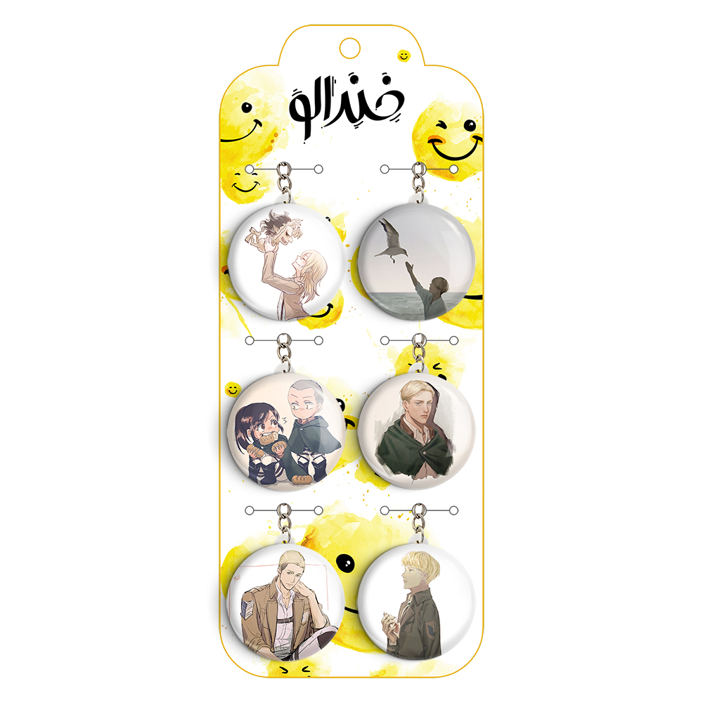 پک 6 عددی جاکلیدی خندالو طرح انیمه اتک آن تایتان (Attack on Titan) با استفاده از روکش سلفون حرارتی مات ضدخش تولید شده که خاصیت ضدخش بودن آن عمر مفید استفاده از جاکلیدی ها را افزایش میدهد. چاپ جاکلیدی ها با دستگاه های استاندارد و با بهترین سطح کیفیت صورت گرفته و طرح با شفافیتی مثال زدنی و با سلفون چسبی تولید شده است که باعث شده محصول نهایی بدون شکست نور دیده شود.