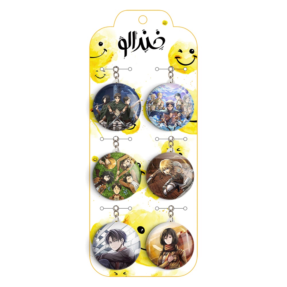 پک 6 عددی جاکلیدی خندالو طرح انیمه اتک آن تایتان (Attack on Titan) با استفاده از روکش سلفون حرارتی مات ضدخش تولید شده که خاصیت ضدخش بودن آن عمر مفید استفاده از جاکلیدی ها را افزایش میدهد. چاپ جاکلیدی ها با دستگاه های استاندارد و با بهترین سطح کیفیت صورت گرفته و طرح با شفافیتی مثال زدنی و با سلفون چسبی تولید شده است که باعث شده محصول نهایی بدون شکست نور دیده شود.
