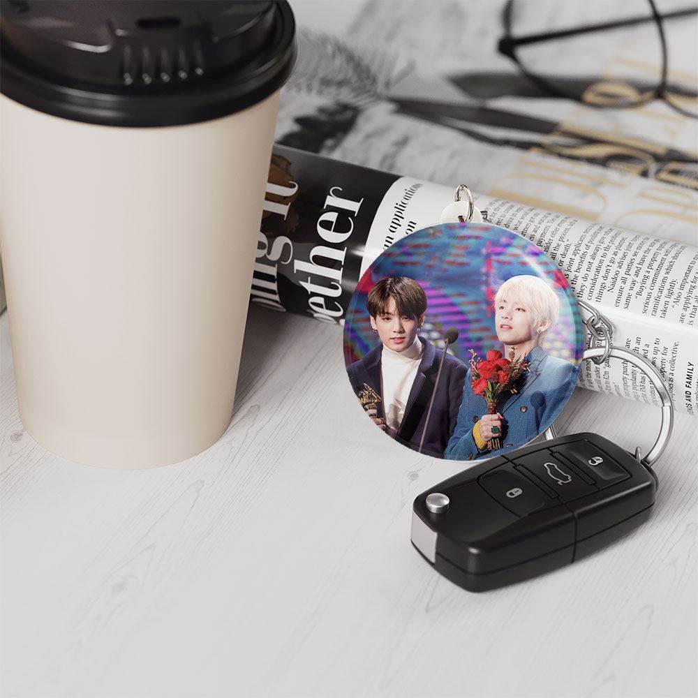 خندالو جاکلیدی تهیونگ و جونگ کوک ویکوک گروه بی تی اس BTS را با استفاده از روکش سلفون حرارتی مات مخملی ضدخش تولید می کند که خاصیت ضدخش بودن آن، کمک میکند تا عمر مفید استفاده از جاکلیدی ها افزایش پیدا کند و با یک خراش ساده مثل برخورد سطح ناخن با محصول، دچار و خط و خش نشود.