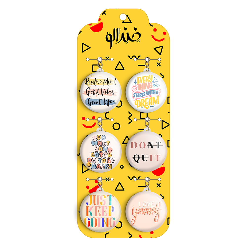 پک 6 عددی جاکلیدی خندالو طرح جملات انگیزشی با استفاده از روکش سلفون حرارتی مات ضدخش تولید شده که خاصیت ضدخش بودن آن عمر مفید استفاده از جاکلیدی ها را افزایش میدهد. چاپ جاکلیدی ها با دستگاه های استاندارد و با بهترین سطح کیفیت صورت گرفته و طرح با شفافیتی مثال زدنی و با سلفون چسبی تولید شده است که باعث شده محصول نهایی بدون شکست نور دیده شود. همچنین بسته بندی جذاب و مینیمال جاکلیدی ها، آنها را محصولی مناسب هدیه کرده است. زنجیر و حلقه بکار برده شده در جاکلیدی خندالو از نوع حلقه درجه یک و ضخیم و محکم بوده و حین استفاده آسیب نمی بیند. قطعی پشتی جاکلیدی از جنس ABS شفاف سفید رنگ تولید شده که در مقابل خط و خش مقاوم بوده و به هیچ عنوان دچار شکستگی نخواهد شد.