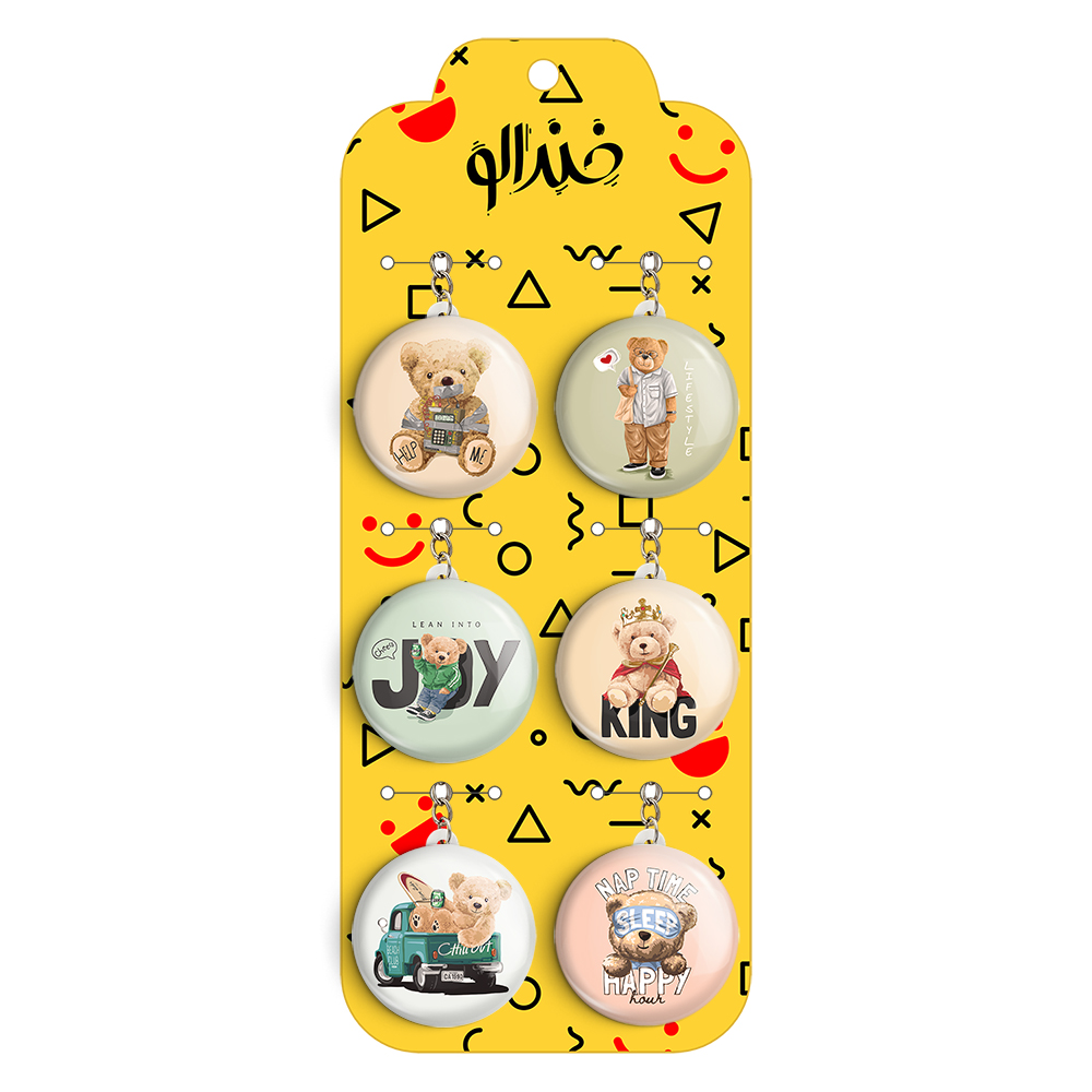 پک 6 عددی جاکلیدی خندالو طرح خرس تدی با استفاده از روکش سلفون حرارتی مات ضدخش تولید شده که خاصیت ضدخش بودن آن عمر مفید استفاده از جاکلیدی ها را افزایش میدهد. چاپ جاکلیدی ها با دستگاه های استاندارد و با بهترین سطح کیفیت صورت گرفته و طرح با شفافیتی مثال زدنی و با سلفون چسبی تولید شده است که باعث شده محصول نهایی بدون شکست نور دیده شود.