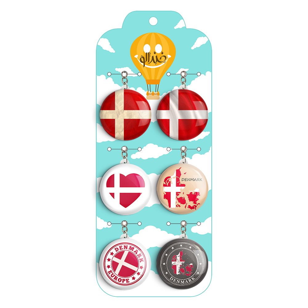 پک 6 عددی جاکلیدی خندالو طرح دانمارک (Denmark) با استفاده از روکش سلفون حرارتی مات ضدخش تولید شده که خاصیت ضدخش بودن آن عمر مفید استفاده از جاکلیدی ها را افزایش میدهد. چاپ جاکلیدی ها با دستگاه های استاندارد و با بهترین سطح کیفیت صورت گرفته و طرح با شفافیتی مثال زدنی و با سلفون چسبی تولید شده است که باعث شده محصول نهایی بدون شکست نور دیده شود.