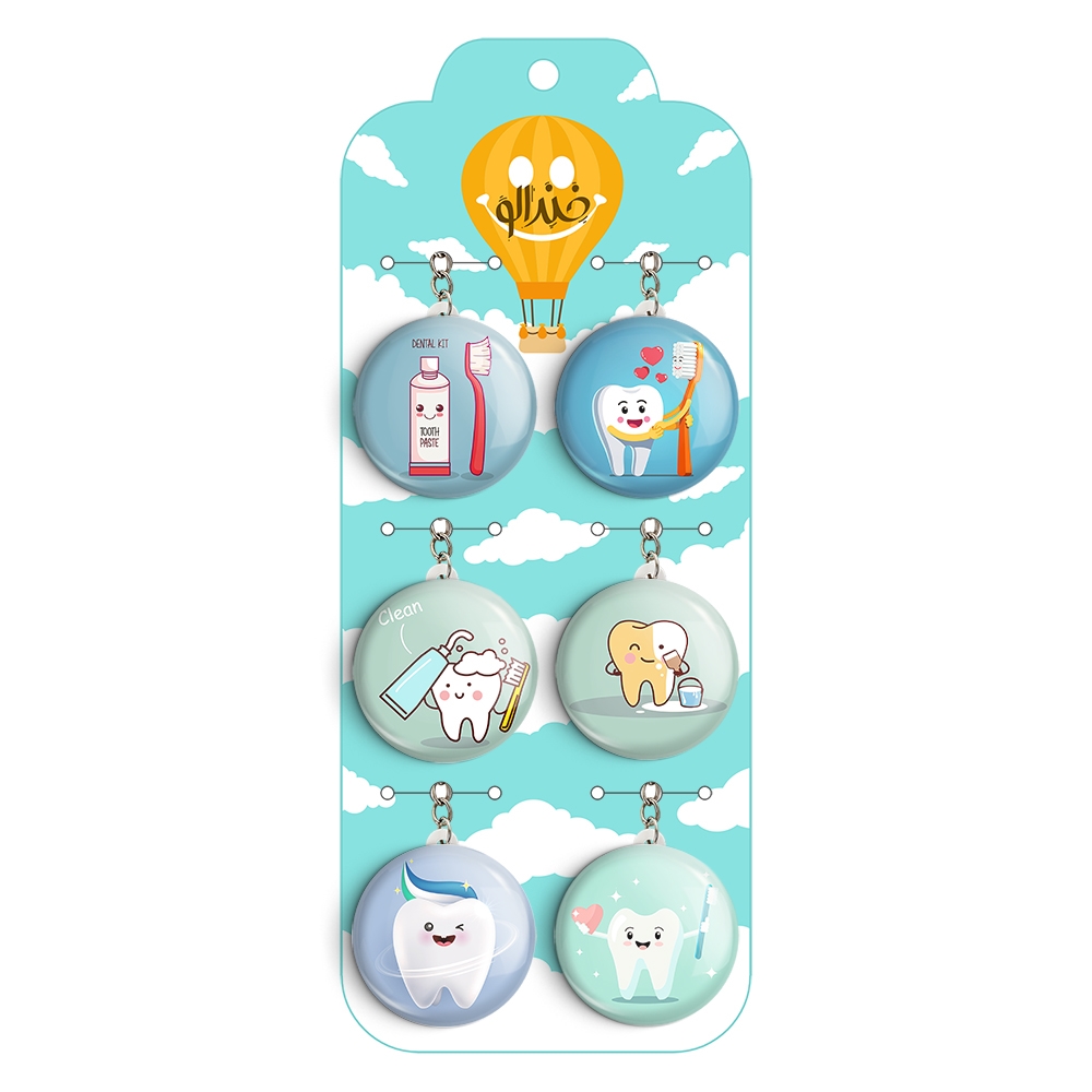 پک 6 عددی جاکلیدی خندالو طرح دندان و دندان پزشکی کودکانه با استفاده از روکش سلفون حرارتی مات ضدخش تولید شده که خاصیت ضدخش بودن آن عمر مفید استفاده از جاکلیدی ها را افزایش میدهد. چاپ جاکلیدی ها با دستگاه های استاندارد و با بهترین سطح کیفیت صورت گرفته و طرح با شفافیتی مثال زدنی و با سلفون چسبی تولید شده است که باعث شده محصول نهایی بدون شکست نور دیده شود.