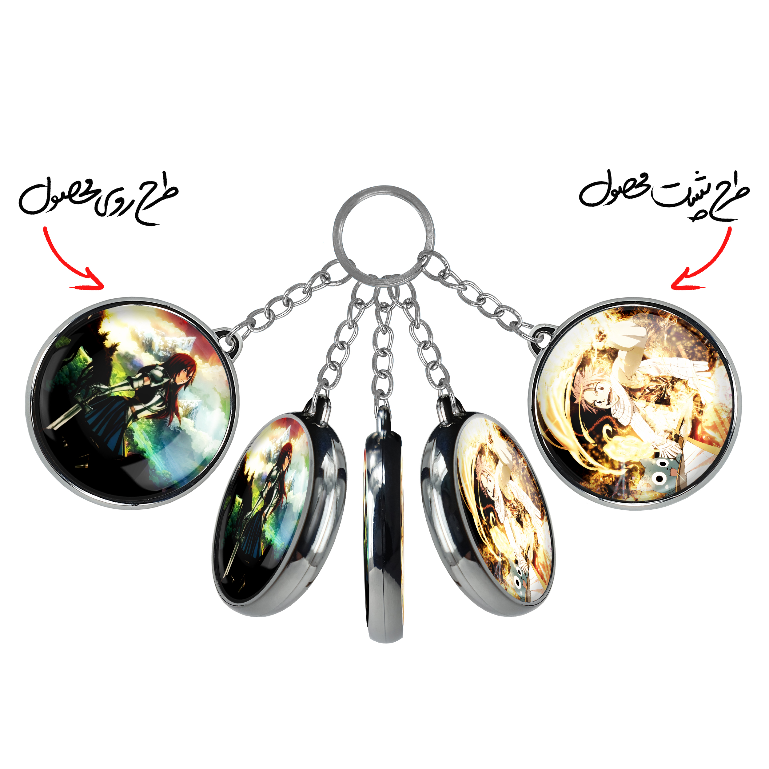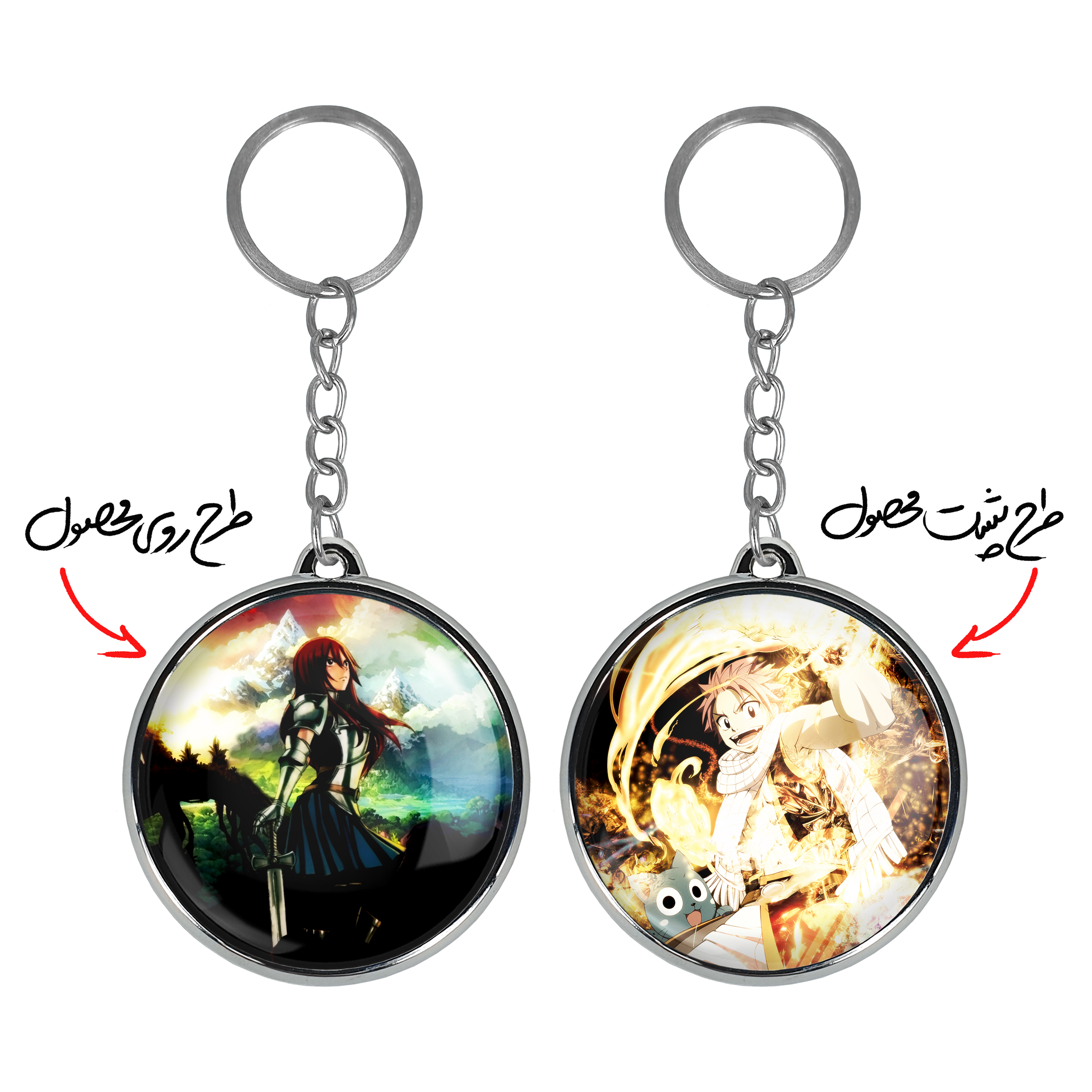 جاکلیدی دوطرفه ارزا انیمه فری تیل Fairy Tail خندالو محصولی کاربردی و جدید است که در هر دو سمت محصول، تصویری متفاوت اما از یک موضوع چاپ شده و تفاوت اصلی آن با جاکلیدی های یک طرفه در همین است که هر دو سمت پشت و روی جاکلیدی، طرحی دیدنی و جذاب دارد. همچنین رینگ بکار برده شده برای دور طرح ها آبکاری کروم درجه یک و رنگ ثابت است و برخلاف سایر محصولات مشابه، از رنگ های متفرقه و یا سفید استفاده نشده، که این مهم، زیبایی محصول نهایی را چند برابر کرده است. جاکلیدی های دوطرفه ارزا انیمه فری تیل Fairy Tail با استفاده از روکش سلفون براق ضدخش تولید شده که خاصیت ضدخش بودن آن عمر مفید استفاده از جاکلیدی ها را افزایش میدهد. چاپ جاکلیدی ها با دستگاه های استاندارد و با بهترین سطح کیفیت صورت گرفته و طرح با شفافیتی مثال زدنی و با سلفون چسبی تولید شده است که باعث شده محصول نهایی بدون شکست نور دیده شود. همچنین بسته بندی جذاب و مینیمال جاکلیدی دوطرفه ارزا انیمه فری تیل Fairy Tail ، آنها را محصولی مناسب هدیه کرده است. زنجیر و حلقه بکار برده شده در جاکلیدی خندالو از نوع حلقه ضخیم و محکم بوده و حین استفاده آسیب نمی بیند.