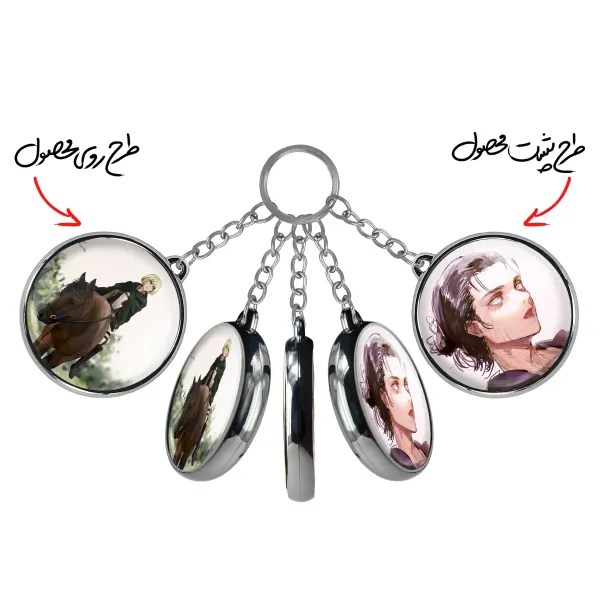 جاکلیدی دوطرفه ارمین انیمه اتک آن تایتان Attack on Titan خندالو محصولی کاربردی و جدید است که در هر دو سمت محصول، تصویری متفاوت اما از یک موضوع چاپ شده و تفاوت اصلی آن با جاکلیدی های یک طرفه در همین است که هر دو سمت پشت و روی جاکلیدی، طرحی دیدنی و جذاب دارد. همچنین رینگ بکار برده شده برای دور طرح ها آبکاری کروم درجه یک و رنگ ثابت است و برخلاف سایر محصولات مشابه، از رنگ های متفرقه و یا سفید استفاده نشده، که این مهم، زیبایی محصول نهایی را چند برابر کرده است. جاکلیدی های دوطرفه ارمین انیمه اتک آن تایتان Attack on Titan با استفاده از روکش سلفون براق ضدخش تولید شده که خاصیت ضدخش بودن آن عمر مفید استفاده از جاکلیدی ها را افزایش میدهد. چاپ جاکلیدی ها با دستگاه های استاندارد و با بهترین سطح کیفیت صورت گرفته و طرح با شفافیتی مثال زدنی و با سلفون چسبی تولید شده است که باعث شده محصول نهایی بدون شکست نور دیده شود. همچنین بسته بندی جذاب و مینیمال جاکلیدی دوطرفه ارمین انیمه اتک آن تایتان Attack on Titan ، آنها را محصولی مناسب هدیه کرده است. زنجیر و حلقه بکار برده شده در جاکلیدی خندالو از نوع حلقه ضخیم و محکم بوده و حین استفاده آسیب نمی بیند.