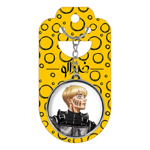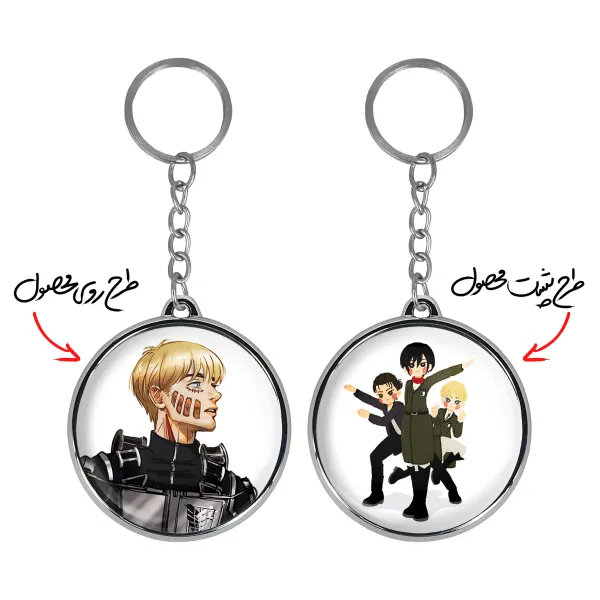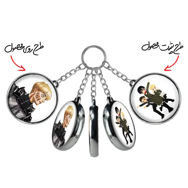 جاکلیدی دوطرفه ارمین انیمه اتک آن تایتان Attack on Titan خندالو محصولی کاربردی و جدید است که در هر دو سمت محصول، تصویری متفاوت اما از یک موضوع چاپ شده و تفاوت اصلی آن با جاکلیدی های یک طرفه در همین است که هر دو سمت پشت و روی جاکلیدی، طرحی دیدنی و جذاب دارد. همچنین رینگ بکار برده شده برای دور طرح ها آبکاری کروم درجه یک و رنگ ثابت است و برخلاف سایر محصولات مشابه، از رنگ های متفرقه و یا سفید استفاده نشده، که این مهم، زیبایی محصول نهایی را چند برابر کرده است. جاکلیدی های دوطرفه ارمین انیمه اتک آن تایتان Attack on Titan با استفاده از روکش سلفون براق ضدخش تولید شده که خاصیت ضدخش بودن آن عمر مفید استفاده از جاکلیدی ها را افزایش میدهد. چاپ جاکلیدی ها با دستگاه های استاندارد و با بهترین سطح کیفیت صورت گرفته و طرح با شفافیتی مثال زدنی و با سلفون چسبی تولید شده است که باعث شده محصول نهایی بدون شکست نور دیده شود. همچنین بسته بندی جذاب و مینیمال جاکلیدی دوطرفه ارمین انیمه اتک آن تایتان Attack on Titan ، آنها را محصولی مناسب هدیه کرده است. زنجیر و حلقه بکار برده شده در جاکلیدی خندالو از نوع حلقه ضخیم و محکم بوده و حین استفاده آسیب نمی بیند.