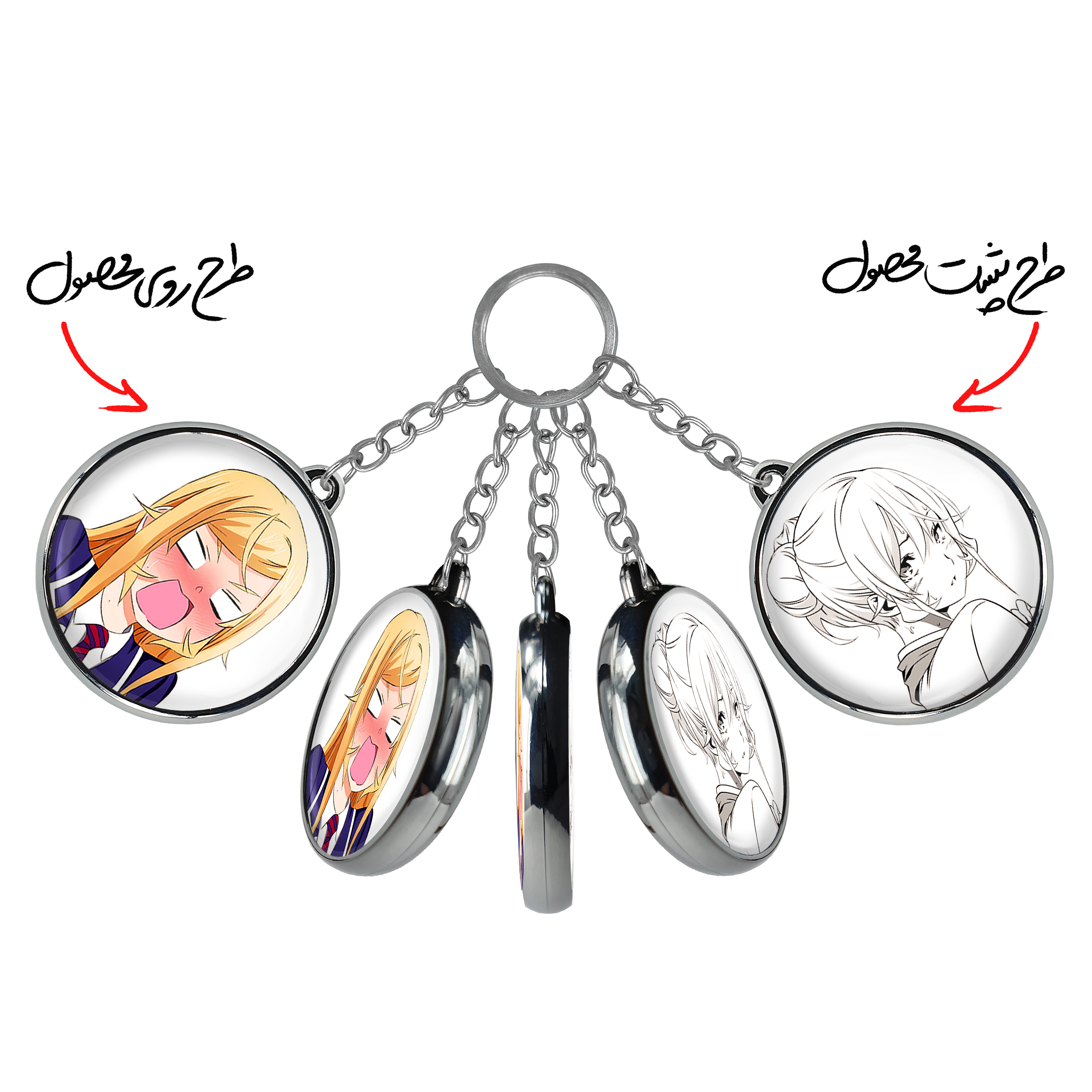 جاکلیدی دوطرفه ارینا انیمه جنگ غذاها Food Wars خندالو محصولی کاربردی و جدید است که در هر دو سمت محصول، تصویری متفاوت اما از یک موضوع چاپ شده و تفاوت اصلی آن با جاکلیدی های یک طرفه در همین است که هر دو سمت پشت و روی جاکلیدی، طرحی دیدنی و جذاب دارد. همچنین رینگ بکار برده شده برای دور طرح ها آبکاری کروم درجه یک و رنگ ثابت است و برخلاف سایر محصولات مشابه، از رنگ های متفرقه و یا سفید استفاده نشده، که این مهم، زیبایی محصول نهایی را چند برابر کرده است. جاکلیدی های دوطرفه ارینا انیمه جنگ غذاها Food Wars با استفاده از روکش سلفون براق ضدخش تولید شده که خاصیت ضدخش بودن آن عمر مفید استفاده از جاکلیدی ها را افزایش میدهد. چاپ جاکلیدی ها با دستگاه های استاندارد و با بهترین سطح کیفیت صورت گرفته و طرح با شفافیتی مثال زدنی و با سلفون چسبی تولید شده است که باعث شده محصول نهایی بدون شکست نور دیده شود. همچنین بسته بندی جذاب و مینیمال جاکلیدی دوطرفه ارینا انیمه جنگ غذاها Food Wars ، آنها را محصولی مناسب هدیه کرده است. زنجیر و حلقه بکار برده شده در جاکلیدی خندالو از نوع حلقه ضخیم و محکم بوده و حین استفاده آسیب نمی بیند.