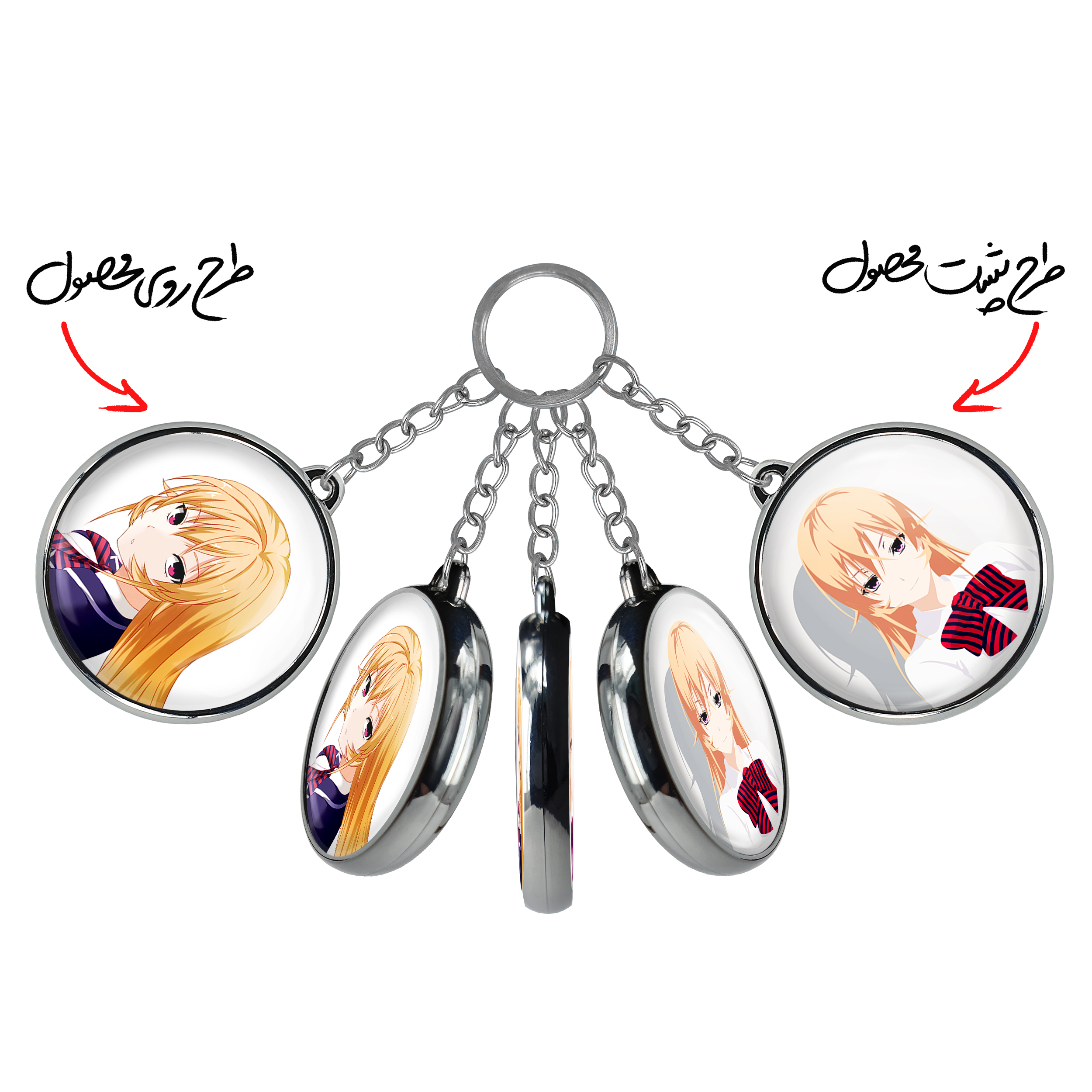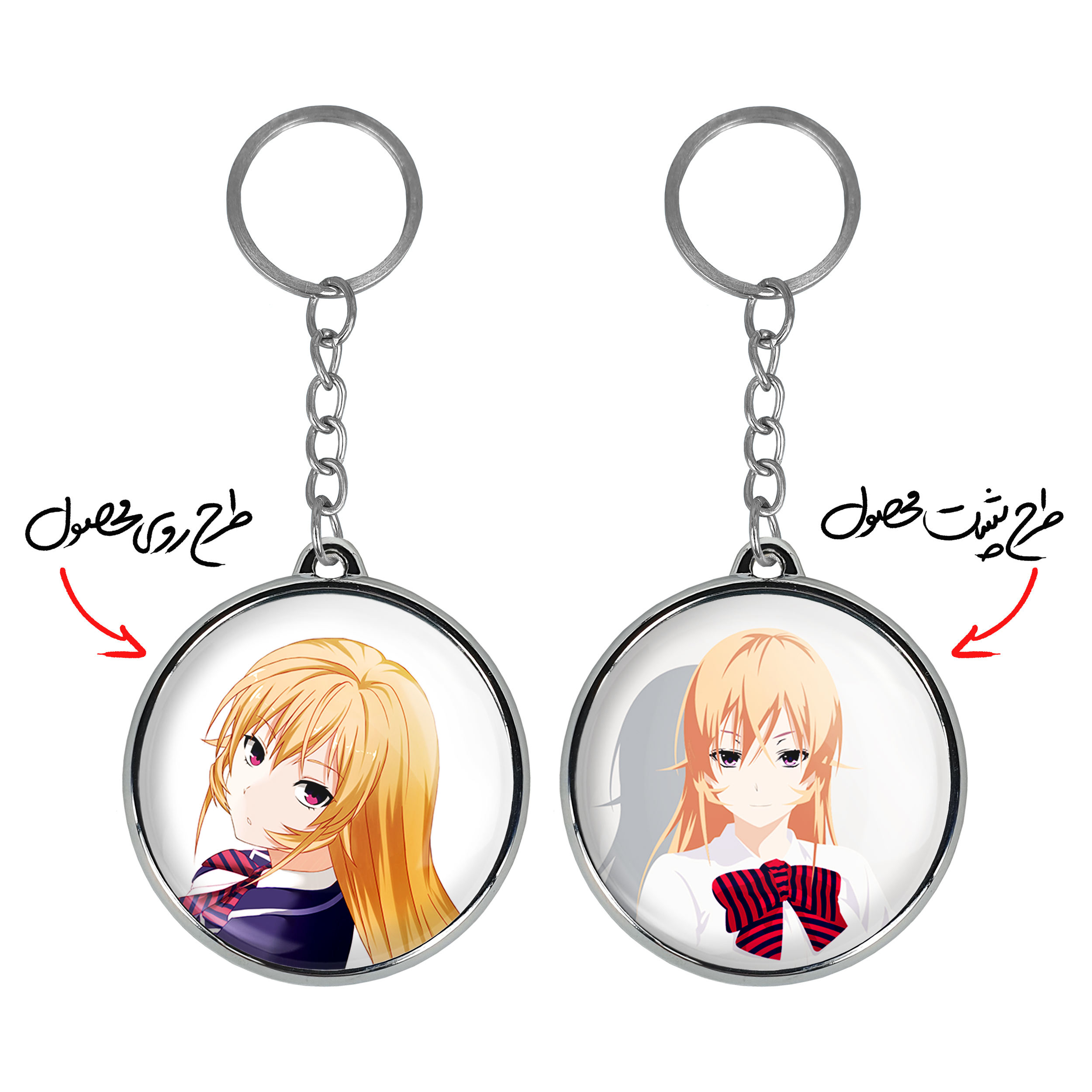 جاکلیدی دوطرفه ارینا انیمه جنگ غذاها Food Wars خندالو محصولی کاربردی و جدید است که در هر دو سمت محصول، تصویری متفاوت اما از یک موضوع چاپ شده و تفاوت اصلی آن با جاکلیدی های یک طرفه در همین است که هر دو سمت پشت و روی جاکلیدی، طرحی دیدنی و جذاب دارد. همچنین رینگ بکار برده شده برای دور طرح ها آبکاری کروم درجه یک و رنگ ثابت است و برخلاف سایر محصولات مشابه، از رنگ های متفرقه و یا سفید استفاده نشده، که این مهم، زیبایی محصول نهایی را چند برابر کرده است. جاکلیدی های دوطرفه ارینا انیمه جنگ غذاها Food Wars با استفاده از روکش سلفون براق ضدخش تولید شده که خاصیت ضدخش بودن آن عمر مفید استفاده از جاکلیدی ها را افزایش میدهد. چاپ جاکلیدی ها با دستگاه های استاندارد و با بهترین سطح کیفیت صورت گرفته و طرح با شفافیتی مثال زدنی و با سلفون چسبی تولید شده است که باعث شده محصول نهایی بدون شکست نور دیده شود. همچنین بسته بندی جذاب و مینیمال جاکلیدی دوطرفه ارینا انیمه جنگ غذاها Food Wars ، آنها را محصولی مناسب هدیه کرده است. زنجیر و حلقه بکار برده شده در جاکلیدی خندالو از نوع حلقه ضخیم و محکم بوده و حین استفاده آسیب نمی بیند.