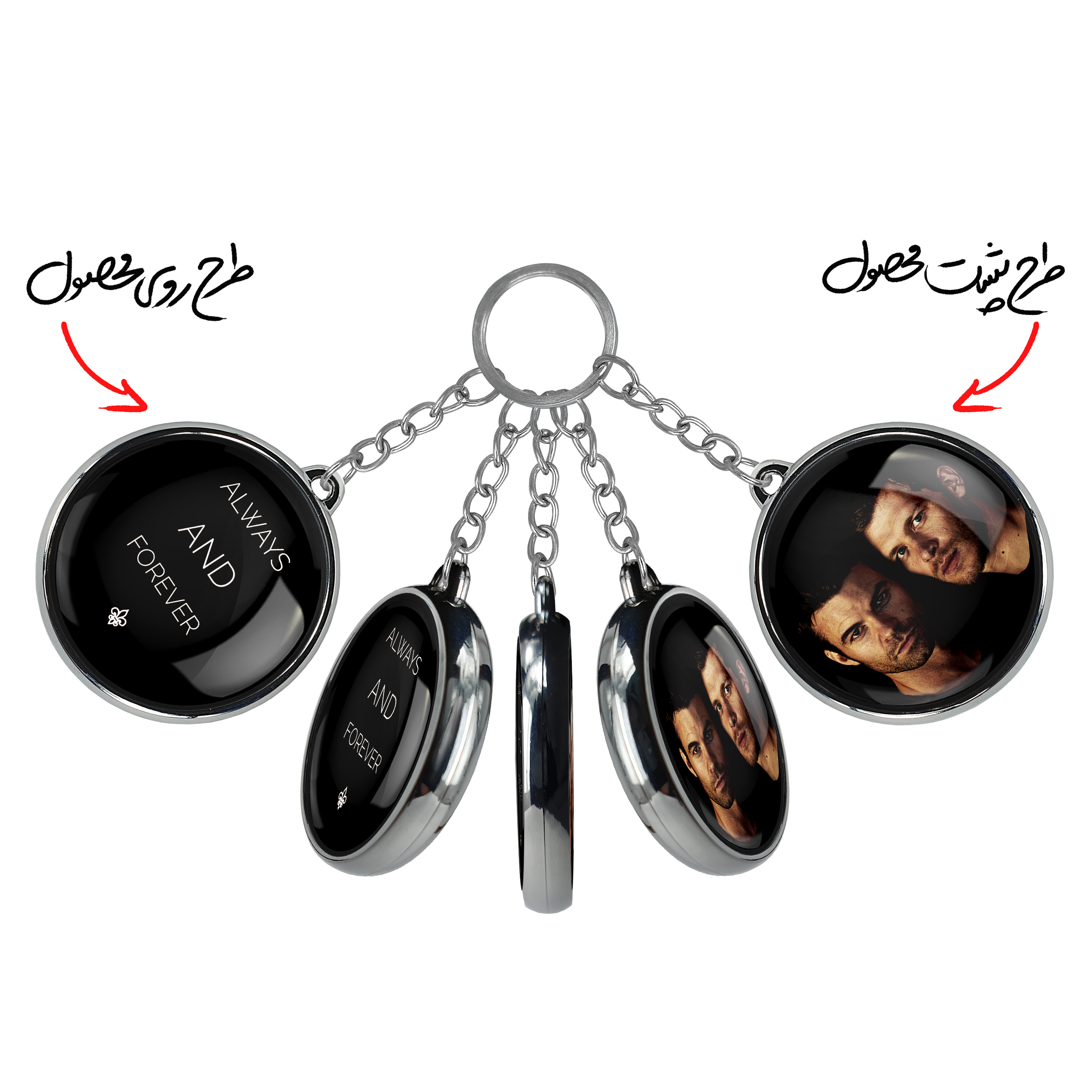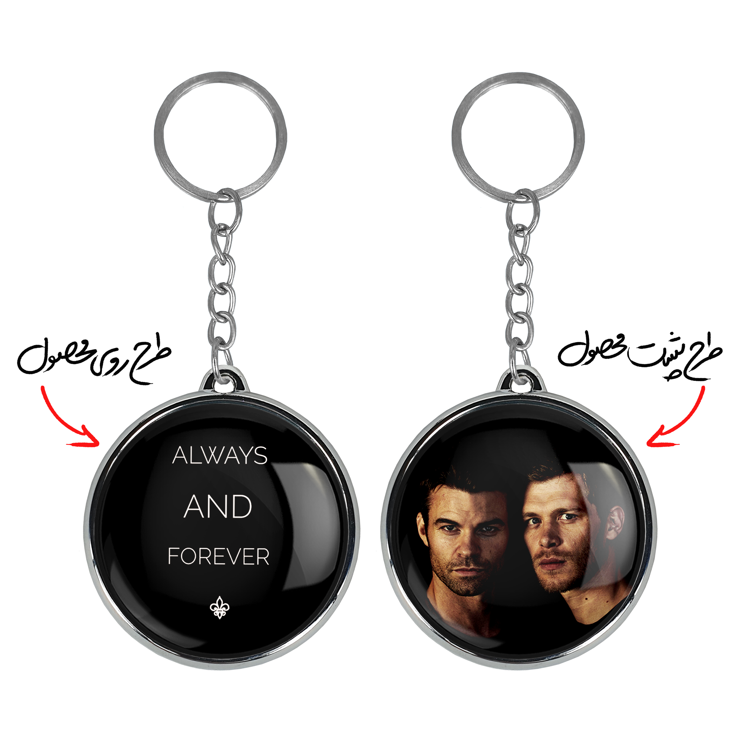 جاکلیدی دوطرفه اصیل ها The Originals خندالو محصولی کاربردی و جدید است که در هر دو سمت محصول، تصویری متفاوت اما از یک موضوع چاپ شده و تفاوت اصلی آن با جاکلیدی های یک طرفه در همین است که هر دو سمت پشت و روی جاکلیدی، طرحی دیدنی و جذاب دارد. همچنین رینگ بکار برده شده برای دور طرح ها آبکاری کروم درجه یک و رنگ ثابت است و برخلاف سایر محصولات مشابه، از رنگ های متفرقه و یا سفید استفاده نشده، که این مهم، زیبایی محصول نهایی را چند برابر کرده است. جاکلیدی های دوطرفه اصیل ها The Originals با استفاده از روکش سلفون براق ضدخش تولید شده که خاصیت ضدخش بودن آن عمر مفید استفاده از جاکلیدی ها را افزایش میدهد. چاپ جاکلیدی ها با دستگاه های استاندارد و با بهترین سطح کیفیت صورت گرفته و طرح با شفافیتی مثال زدنی و با سلفون چسبی تولید شده است که باعث شده محصول نهایی بدون شکست نور دیده شود. همچنین بسته بندی جذاب و مینیمال جاکلیدی دوطرفه اصیل ها The Originals ، آنها را محصولی مناسب هدیه کرده است. زنجیر و حلقه بکار برده شده در جاکلیدی خندالو از نوع حلقه ضخیم و محکم بوده و حین استفاده آسیب نمی بیند.