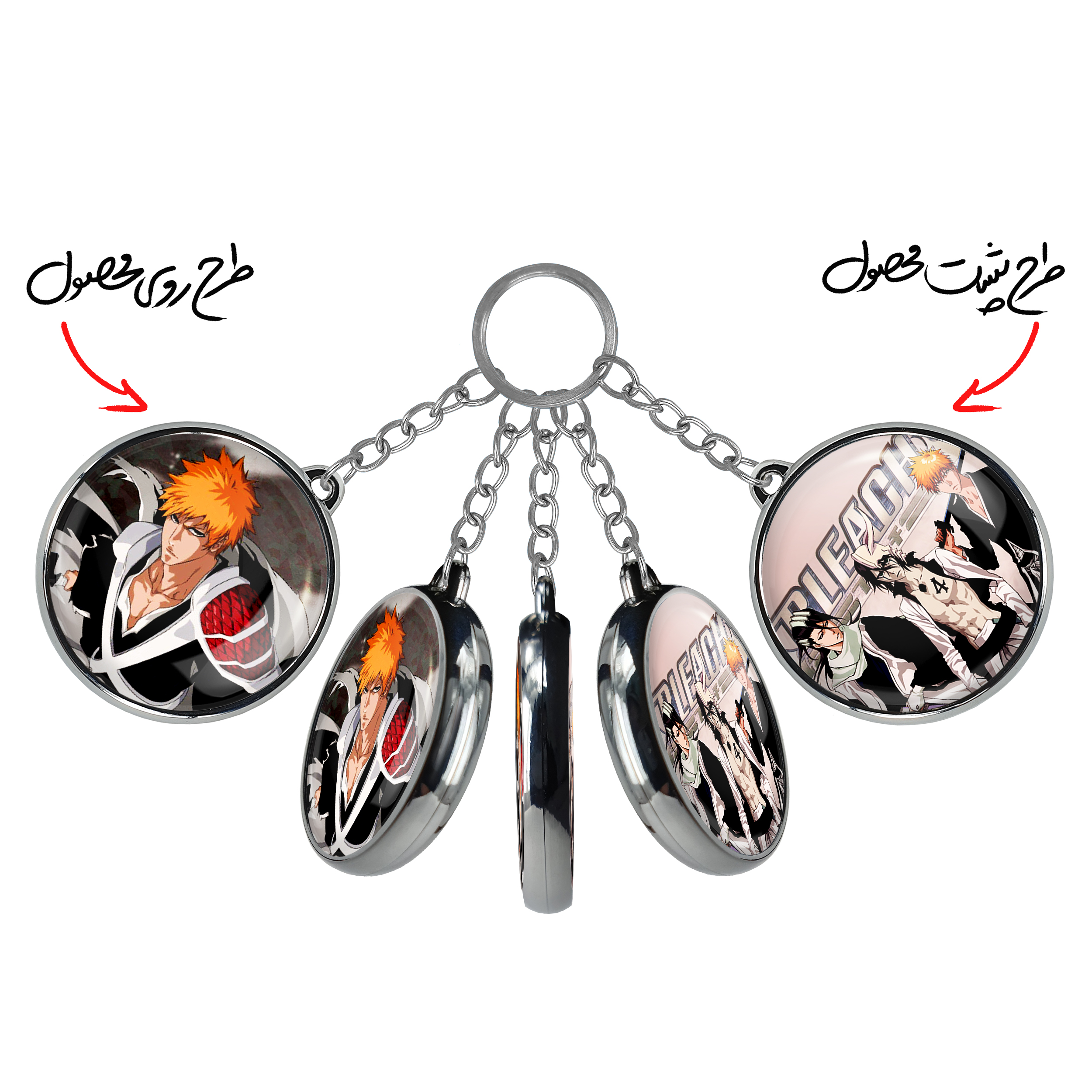 جاکلیدی دوطرفه ایچیگو کوروساکی انیمه بلیچ Bleach خندالو محصولی کاربردی و جدید است که در هر دو سمت محصول، تصویری متفاوت اما از یک موضوع چاپ شده و تفاوت اصلی آن با جاکلیدی های یک طرفه در همین است که هر دو سمت پشت و روی جاکلیدی، طرحی دیدنی و جذاب دارد. همچنین رینگ بکار برده شده برای دور طرح ها آبکاری کروم درجه یک و رنگ ثابت است و برخلاف سایر محصولات مشابه، از رنگ های متفرقه و یا سفید استفاده نشده، که این مهم، زیبایی محصول نهایی را چند برابر کرده است. جاکلیدی های دوطرفه ایچیگو کوروساکی انیمه بلیچ Bleach با استفاده از روکش سلفون براق ضدخش تولید شده که خاصیت ضدخش بودن آن عمر مفید استفاده از جاکلیدی ها را افزایش میدهد. چاپ جاکلیدی ها با دستگاه های استاندارد و با بهترین سطح کیفیت صورت گرفته و طرح با شفافیتی مثال زدنی و با سلفون چسبی تولید شده است که باعث شده محصول نهایی بدون شکست نور دیده شود. همچنین بسته بندی جذاب و مینیمال جاکلیدی دوطرفه ایچیگو کوروساکی انیمه بلیچ Bleach ، آنها را محصولی مناسب هدیه کرده است. زنجیر و حلقه بکار برده شده در جاکلیدی خندالو از نوع حلقه ضخیم و محکم بوده و حین استفاده آسیب نمی بیند.