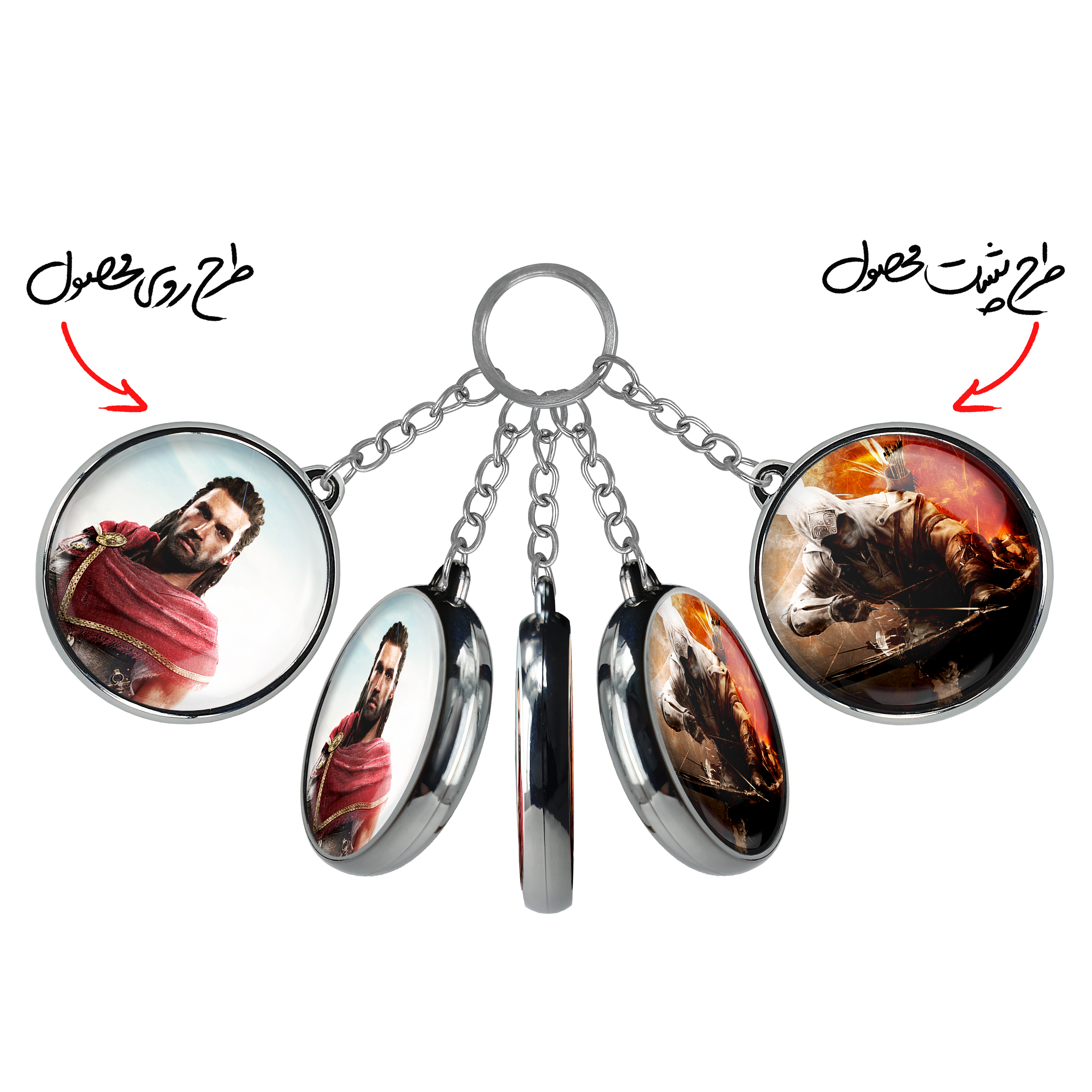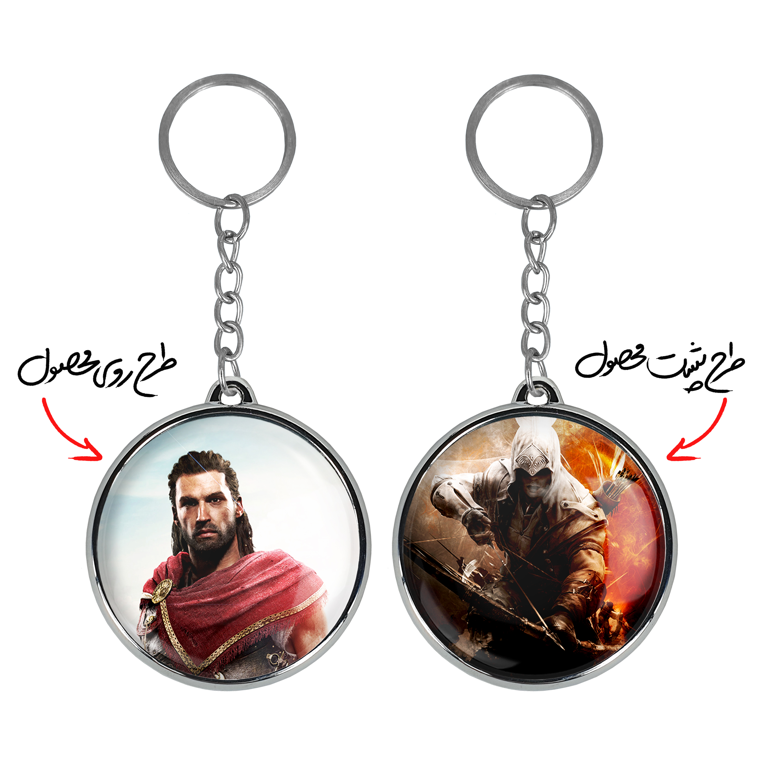 جاکلیدی دوطرفه بازی اساسینز کرید Assassin’s Creedخندالو محصولی کاربردی و جدید است که در هر دو سمت محصول، تصویری متفاوت اما از یک موضوع چاپ شده و تفاوت اصلی آن با جاکلیدی های یک طرفه در همین است که هر دو سمت پشت و روی جاکلیدی، طرحی دیدنی و جذاب دارد. همچنین رینگ بکار برده شده برای دور طرح ها آبکاری کروم درجه یک و رنگ ثابت است و برخلاف سایر محصولات مشابه، از رنگ های متفرقه و یا سفید استفاده نشده، که این مهم، زیبایی محصول نهایی را چند برابر کرده است. جاکلیدی های دوطرفه بازی اساسینز کرید Assassin’s Creedبا استفاده از روکش سلفون براق ضدخش تولید شده که خاصیت ضدخش بودن آن عمر مفید استفاده از جاکلیدی ها را افزایش میدهد. چاپ جاکلیدی ها با دستگاه های استاندارد و با بهترین سطح کیفیت صورت گرفته و طرح با شفافیتی مثال زدنی و با سلفون چسبی تولید شده است که باعث شده محصول نهایی بدون شکست نور دیده شود. همچنین بسته بندی جذاب و مینیمال جاکلیدی دوطرفه بازی اساسینز کرید Assassin’s Creed، آنها را محصولی مناسب هدیه کرده است. زنجیر و حلقه بکار برده شده در جاکلیدی خندالو از نوع حلقه ضخیم و محکم بوده و حین استفاده آسیب نمی بیند.