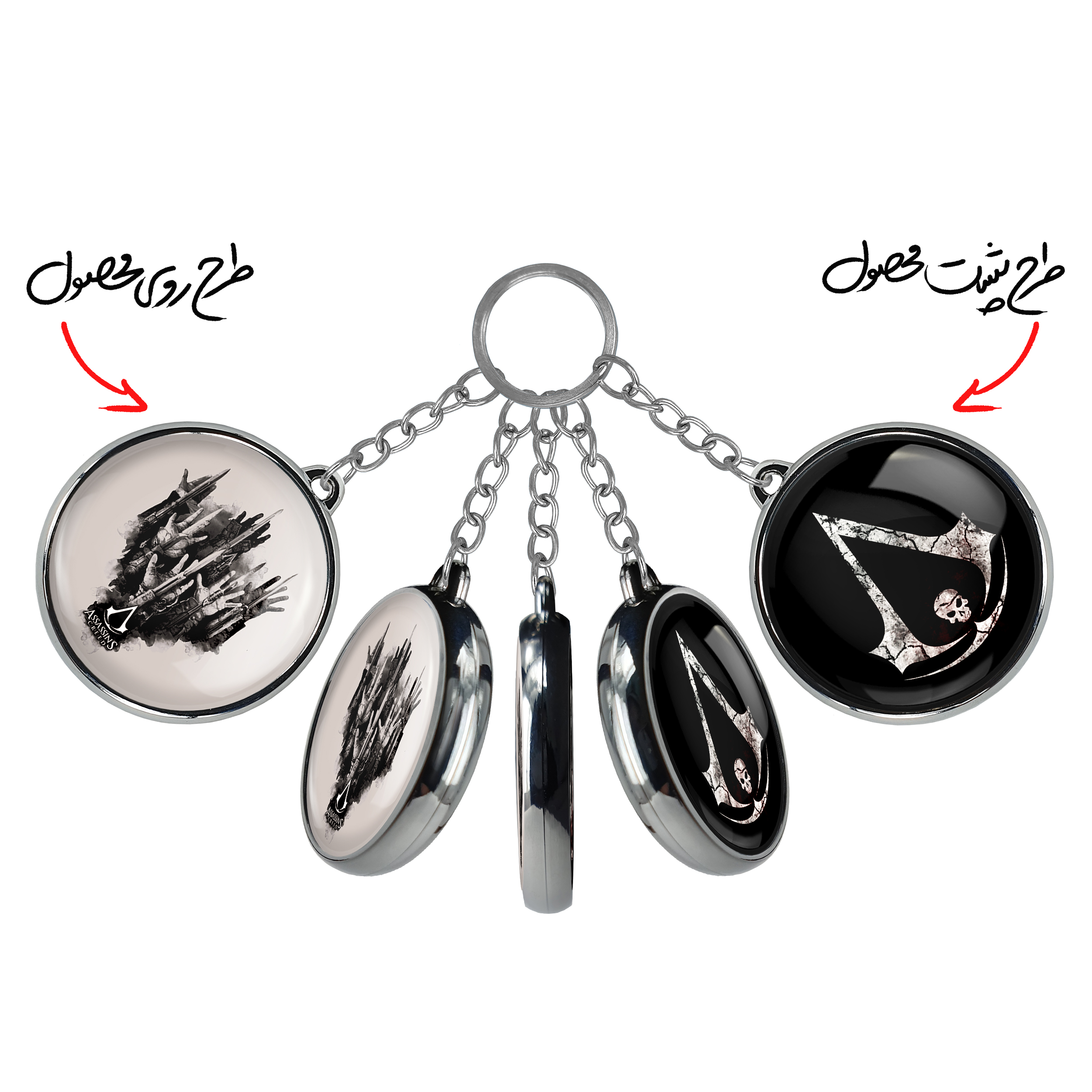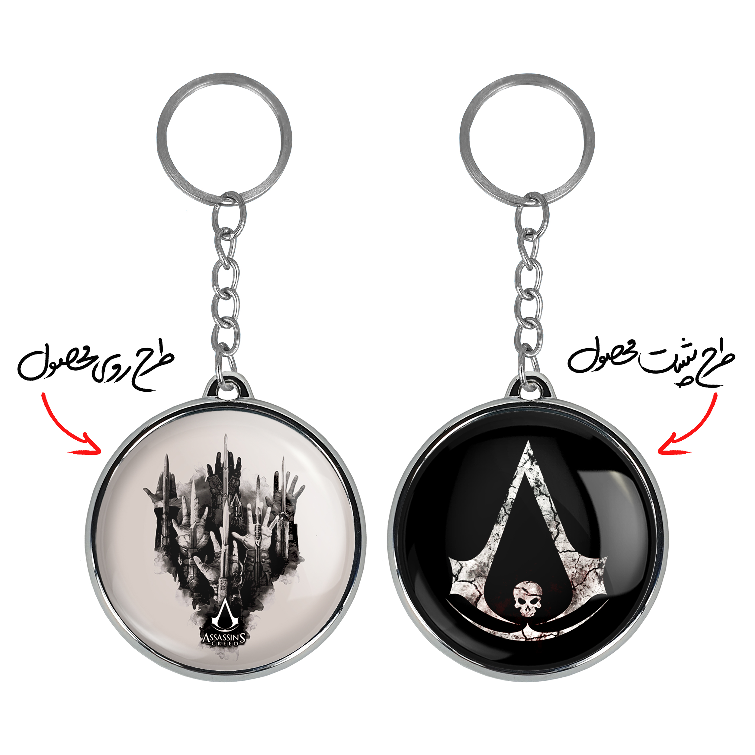 جاکلیدی دوطرفه بازی اساسینز کرید Assassin’s Creedخندالو محصولی کاربردی و جدید است که در هر دو سمت محصول، تصویری متفاوت اما از یک موضوع چاپ شده و تفاوت اصلی آن با جاکلیدی های یک طرفه در همین است که هر دو سمت پشت و روی جاکلیدی، طرحی دیدنی و جذاب دارد. همچنین رینگ بکار برده شده برای دور طرح ها آبکاری کروم درجه یک و رنگ ثابت است و برخلاف سایر محصولات مشابه، از رنگ های متفرقه و یا سفید استفاده نشده، که این مهم، زیبایی محصول نهایی را چند برابر کرده است. جاکلیدی های دوطرفه بازی اساسینز کرید Assassin’s Creedبا استفاده از روکش سلفون براق ضدخش تولید شده که خاصیت ضدخش بودن آن عمر مفید استفاده از جاکلیدی ها را افزایش میدهد. چاپ جاکلیدی ها با دستگاه های استاندارد و با بهترین سطح کیفیت صورت گرفته و طرح با شفافیتی مثال زدنی و با سلفون چسبی تولید شده است که باعث شده محصول نهایی بدون شکست نور دیده شود. همچنین بسته بندی جذاب و مینیمال جاکلیدی دوطرفه بازی اساسینز کرید Assassin’s Creed، آنها را محصولی مناسب هدیه کرده است. زنجیر و حلقه بکار برده شده در جاکلیدی خندالو از نوع حلقه ضخیم و محکم بوده و حین استفاده آسیب نمی بیند.