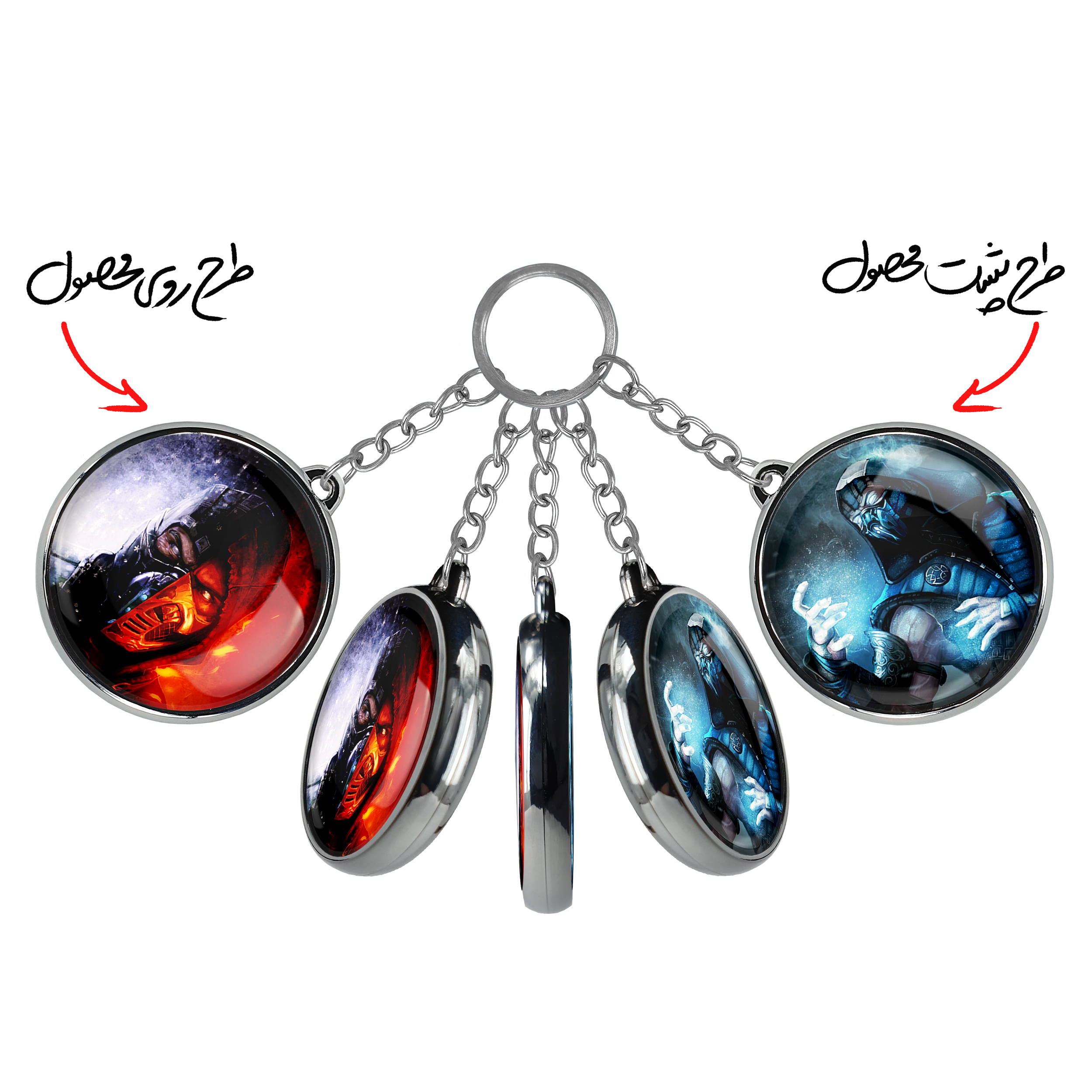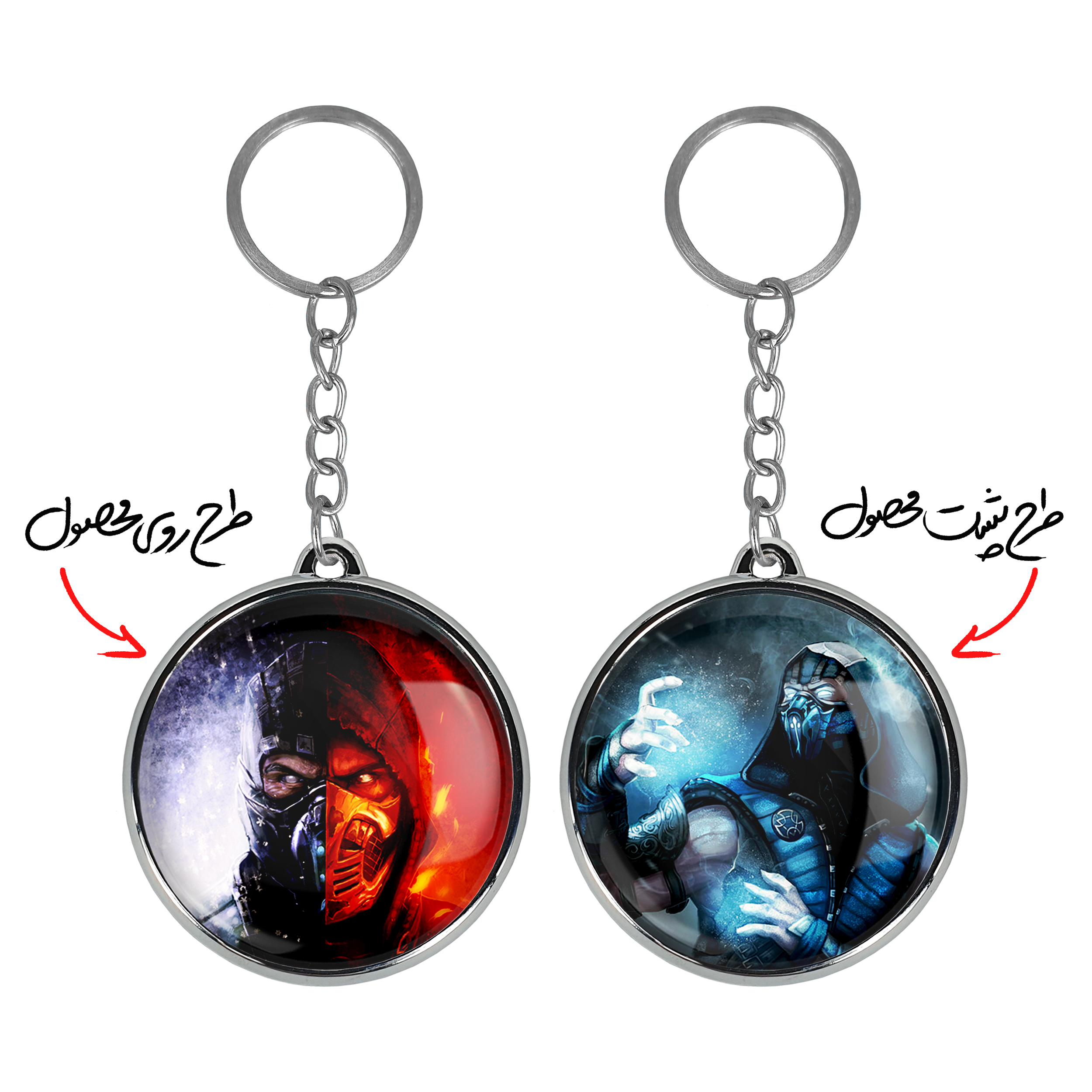 جاکلیدی دوطرفه بازی مورتال کمبت Mortal Kombatخندالو محصولی کاربردی و جدید است که در هر دو سمت محصول، تصویری متفاوت اما از یک موضوع چاپ شده و تفاوت اصلی آن با جاکلیدی های یک طرفه در همین است که هر دو سمت پشت و روی جاکلیدی، طرحی دیدنی و جذاب دارد. همچنین رینگ بکار برده شده برای دور طرح ها آبکاری کروم درجه یک و رنگ ثابت است و برخلاف سایر محصولات مشابه، از رنگ های متفرقه و یا سفید استفاده نشده، که این مهم، زیبایی محصول نهایی را چند برابر کرده است. جاکلیدی های دوطرفه بازی مورتال کمبت Mortal Kombatبا استفاده از روکش سلفون براق ضدخش تولید شده که خاصیت ضدخش بودن آن عمر مفید استفاده از جاکلیدی ها را افزایش میدهد. چاپ جاکلیدی ها با دستگاه های استاندارد و با بهترین سطح کیفیت صورت گرفته و طرح با شفافیتی مثال زدنی و با سلفون چسبی تولید شده است که باعث شده محصول نهایی بدون شکست نور دیده شود. همچنین بسته بندی جذاب و مینیمال جاکلیدی دوطرفه بازی مورتال کمبت Mortal Kombat، آنها را محصولی مناسب هدیه کرده است. زنجیر و حلقه بکار برده شده در جاکلیدی خندالو از نوع حلقه ضخیم و محکم بوده و حین استفاده آسیب نمی بیند.