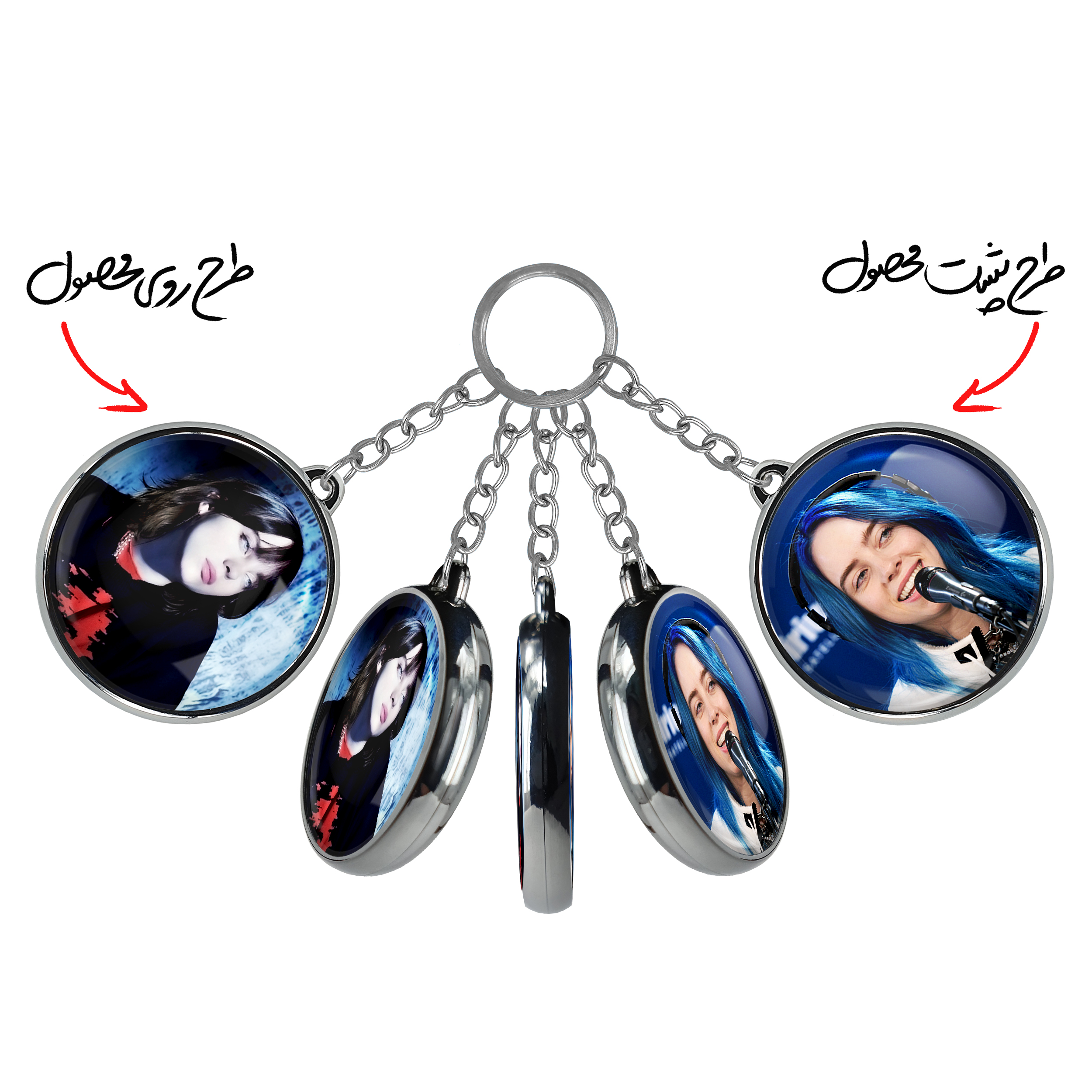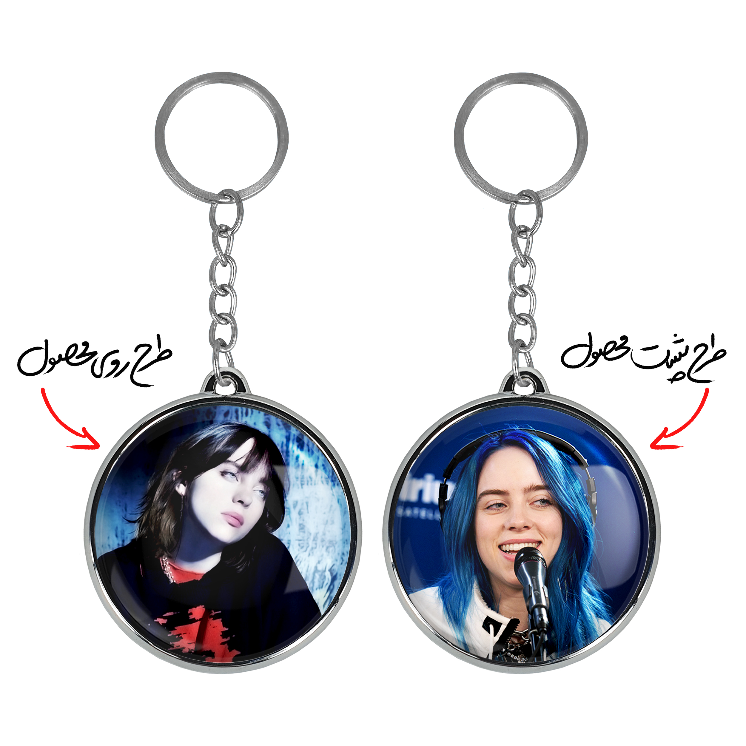 جاکلیدی دوطرفه بیلی آیلیش Billie Eilish خندالو محصولی کاربردی و جدید است که در هر دو سمت محصول، تصویری متفاوت اما از یک موضوع چاپ شده و تفاوت اصلی آن با جاکلیدی های یک طرفه در همین است که هر دو سمت پشت و روی جاکلیدی، طرحی دیدنی و جذاب دارد.
