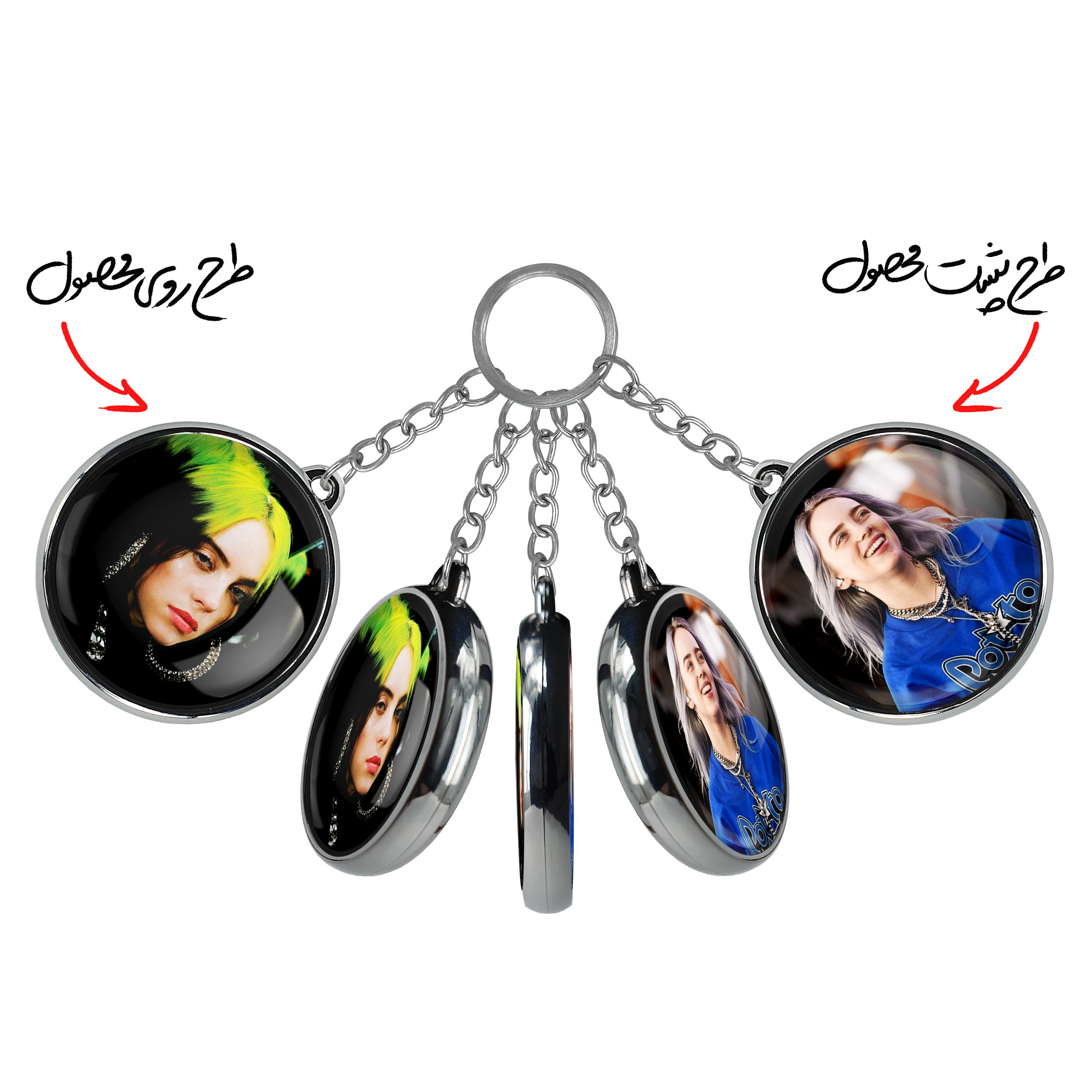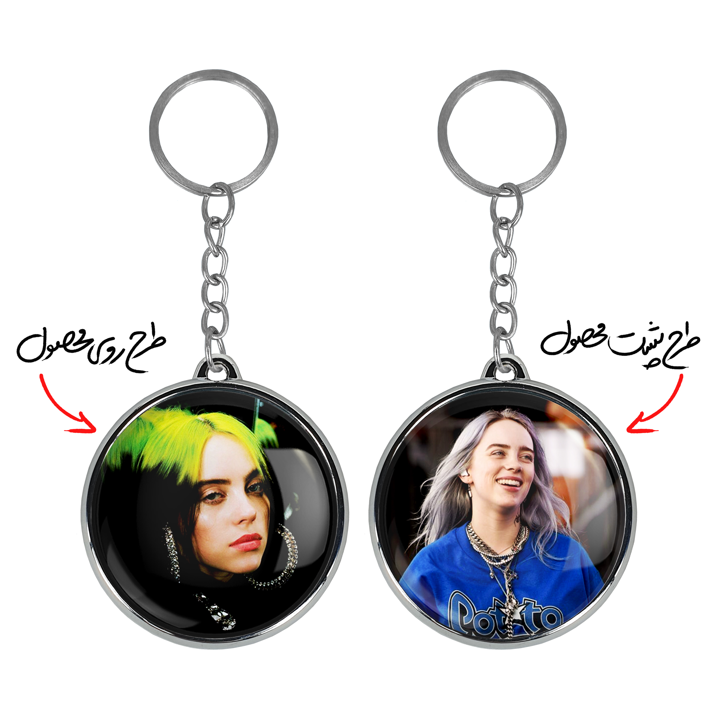 جاکلیدی دوطرفه بیلی آیلیش Billie Eilish خندالو محصولی کاربردی و جدید است که در هر دو سمت محصول، تصویری متفاوت اما از یک موضوع چاپ شده و تفاوت اصلی آن با جاکلیدی های یک طرفه در همین است که هر دو سمت پشت و روی جاکلیدی، طرحی دیدنی و جذاب دارد.