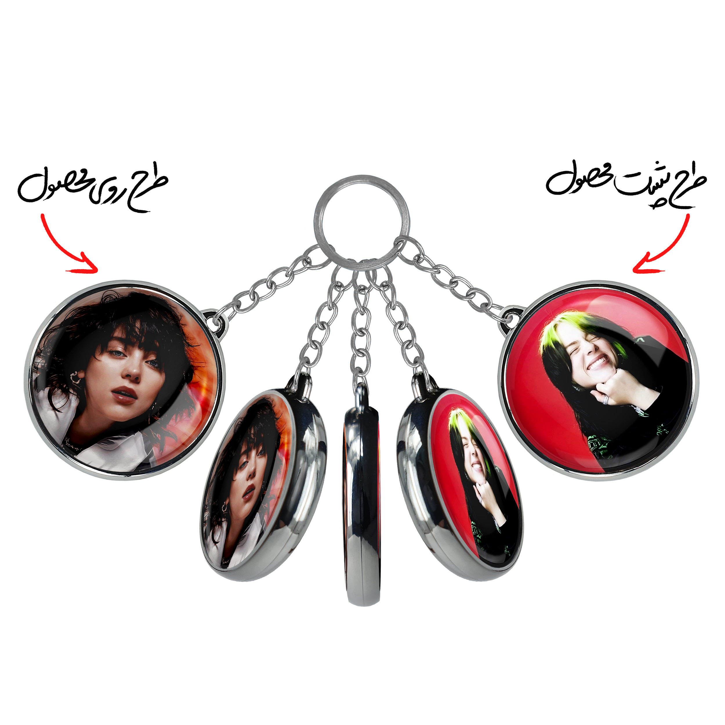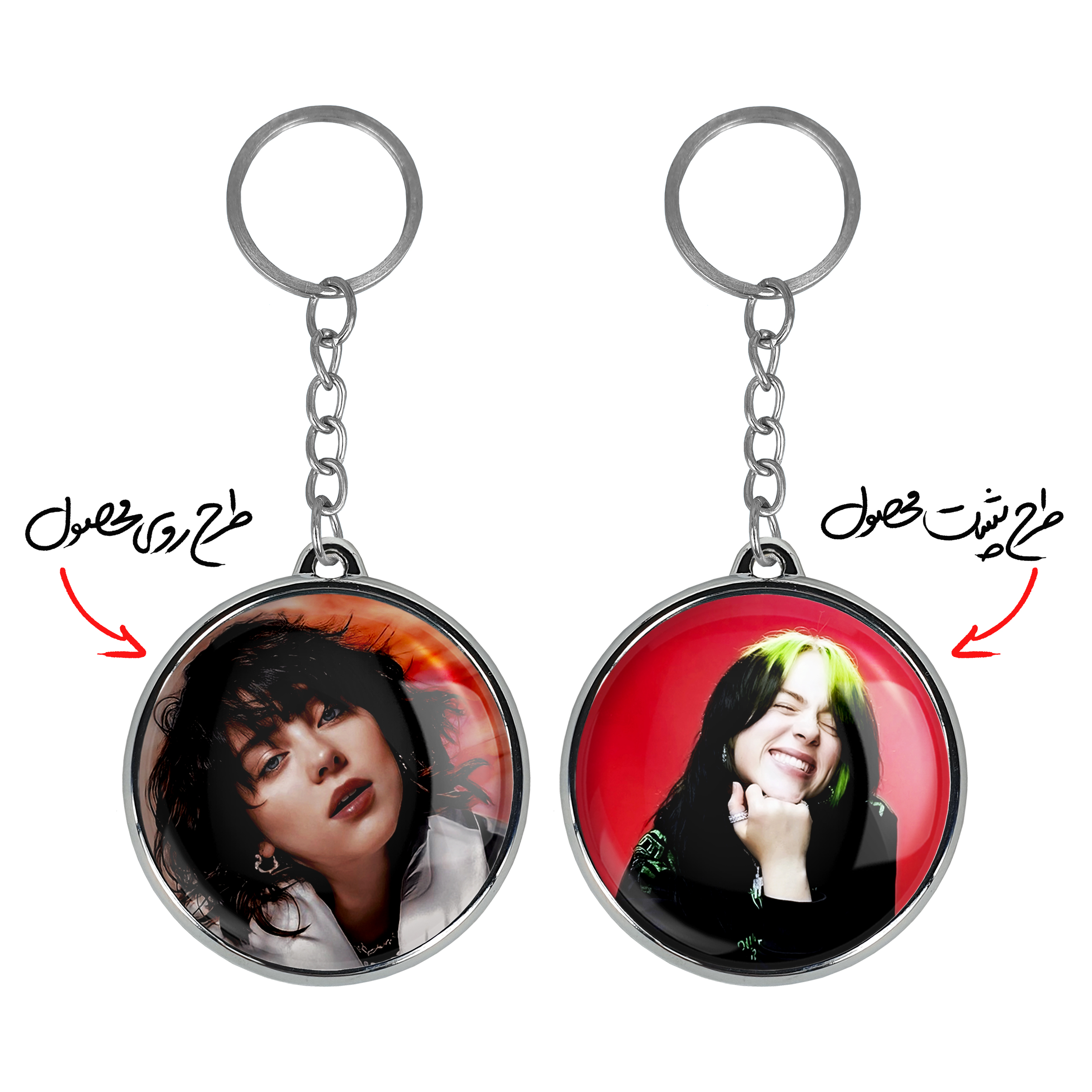 جاکلیدی دوطرفه بیلی آیلیش Billie Eilish خندالو محصولی کاربردی و جدید است که در هر دو سمت محصول، تصویری متفاوت اما از یک موضوع چاپ شده و تفاوت اصلی آن با جاکلیدی های یک طرفه در همین است که هر دو سمت پشت و روی جاکلیدی، طرحی دیدنی و جذاب دارد.