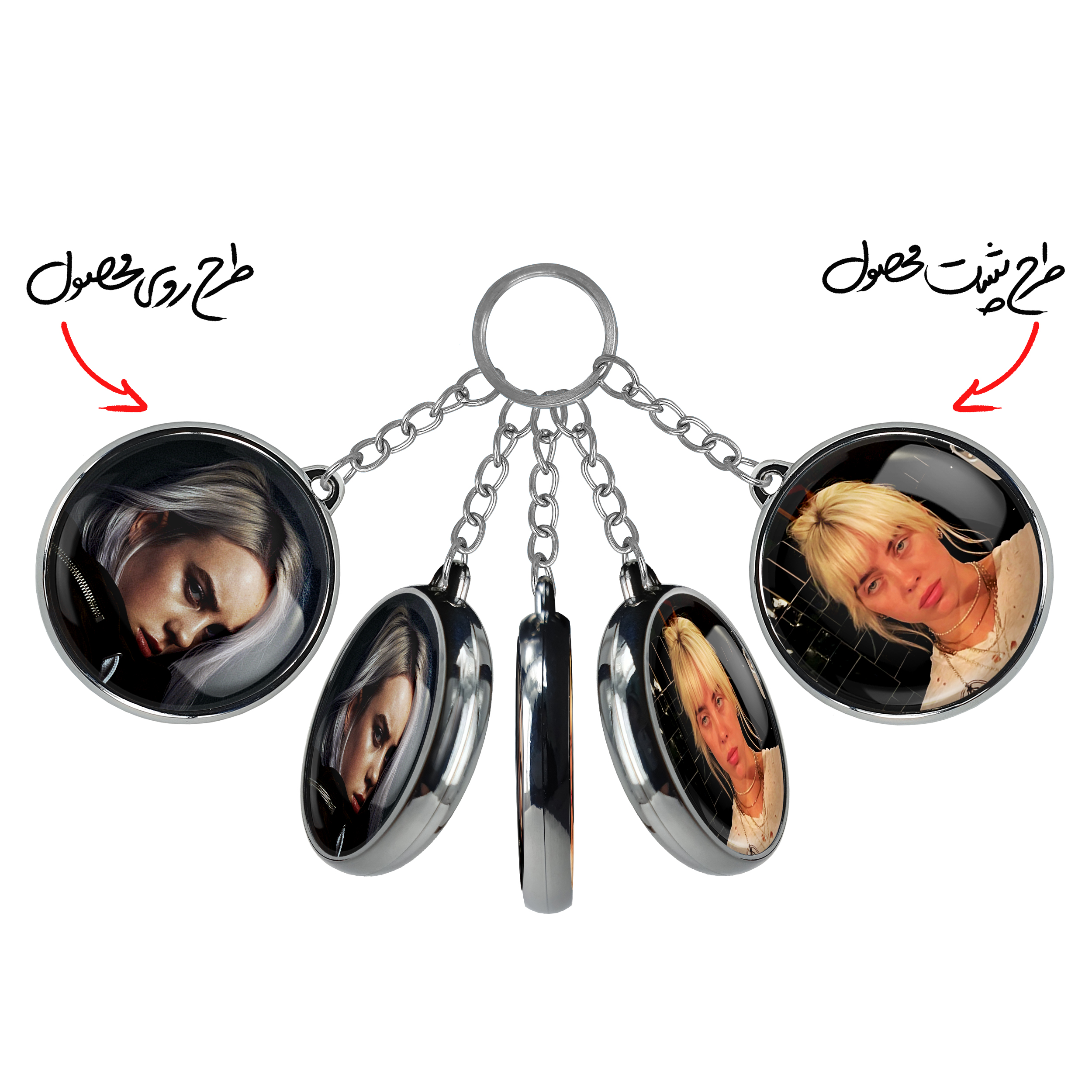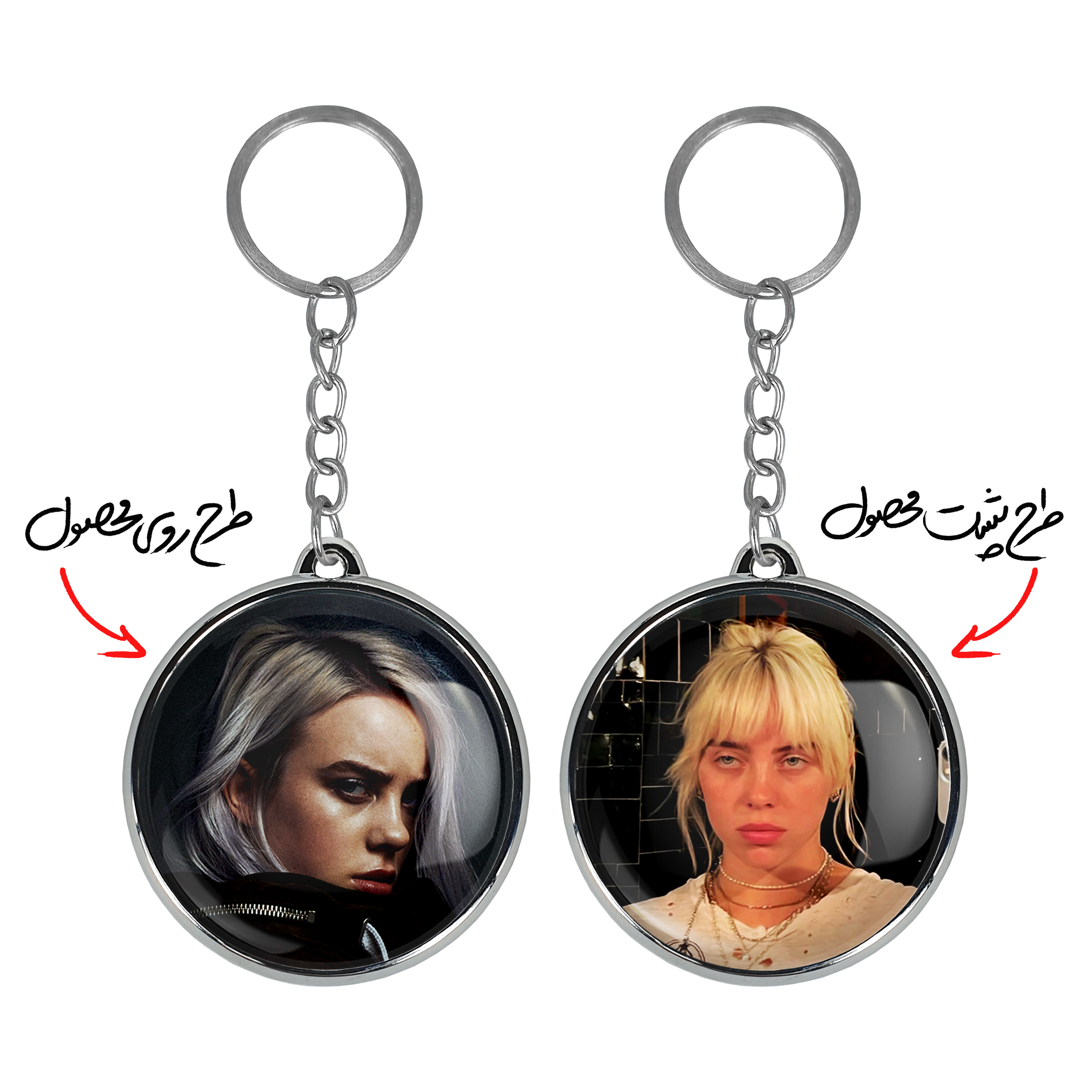 جاکلیدی دوطرفه بیلی آیلیش Billie Eilish خندالو محصولی کاربردی و جدید است که در هر دو سمت محصول، تصویری متفاوت اما از یک موضوع چاپ شده و تفاوت اصلی آن با جاکلیدی های یک طرفه در همین است که هر دو سمت پشت و روی جاکلیدی، طرحی دیدنی و جذاب دارد.