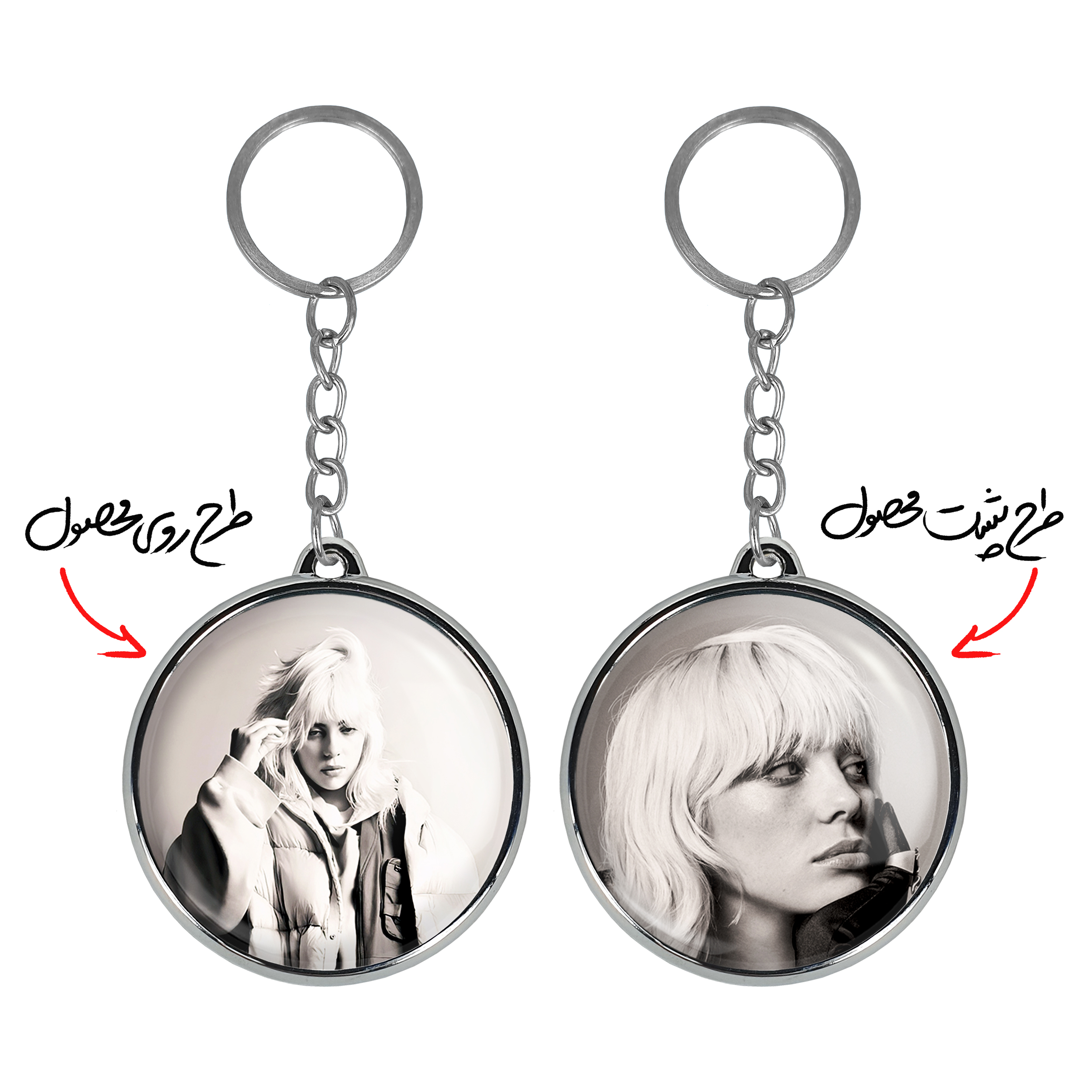 جاکلیدی دوطرفه بیلی آیلیش Billie Eilish خندالو محصولی کاربردی و جدید است که در هر دو سمت محصول، تصویری متفاوت اما از یک موضوع چاپ شده و تفاوت اصلی آن با جاکلیدی های یک طرفه در همین است که هر دو سمت پشت و روی جاکلیدی، طرحی دیدنی و جذاب دارد.