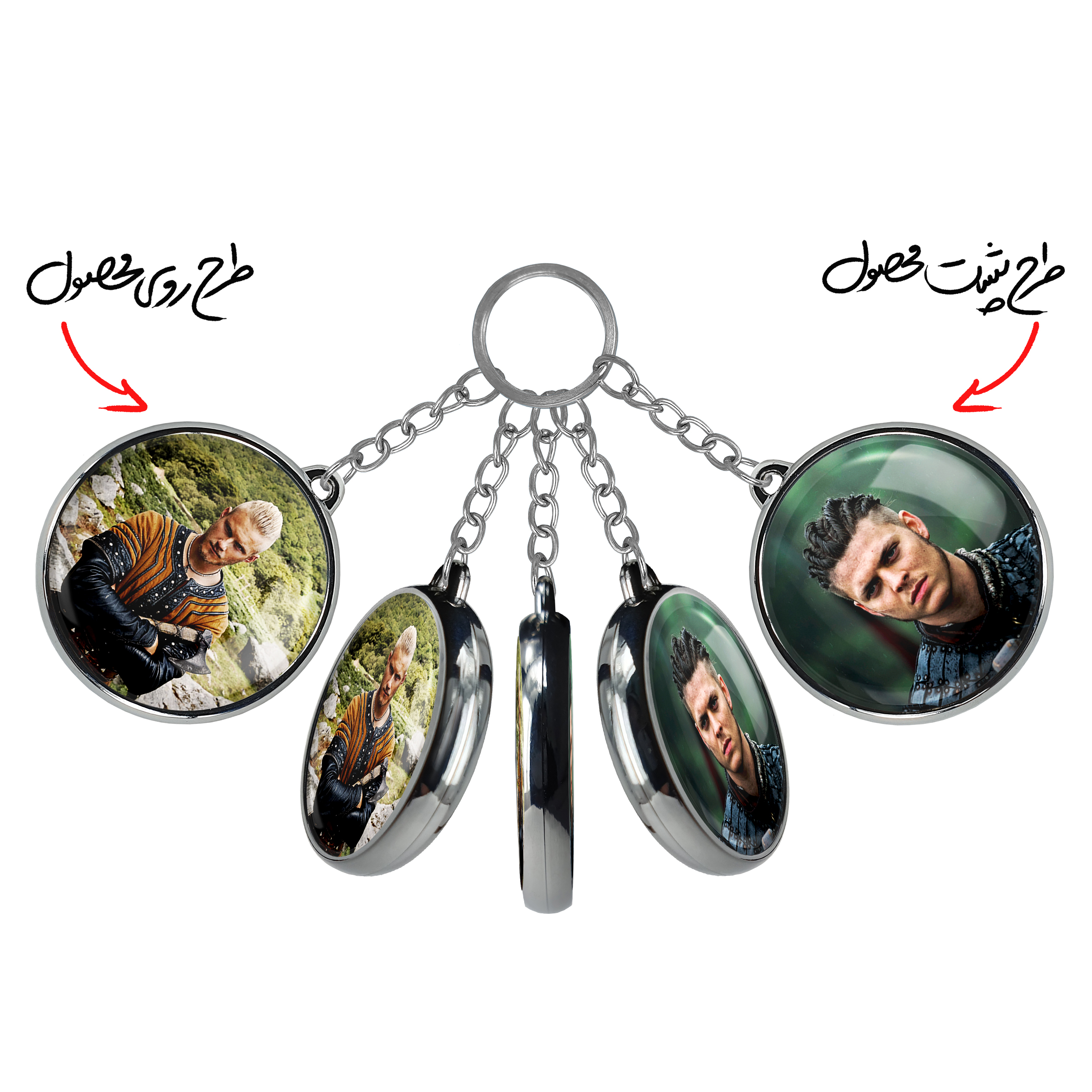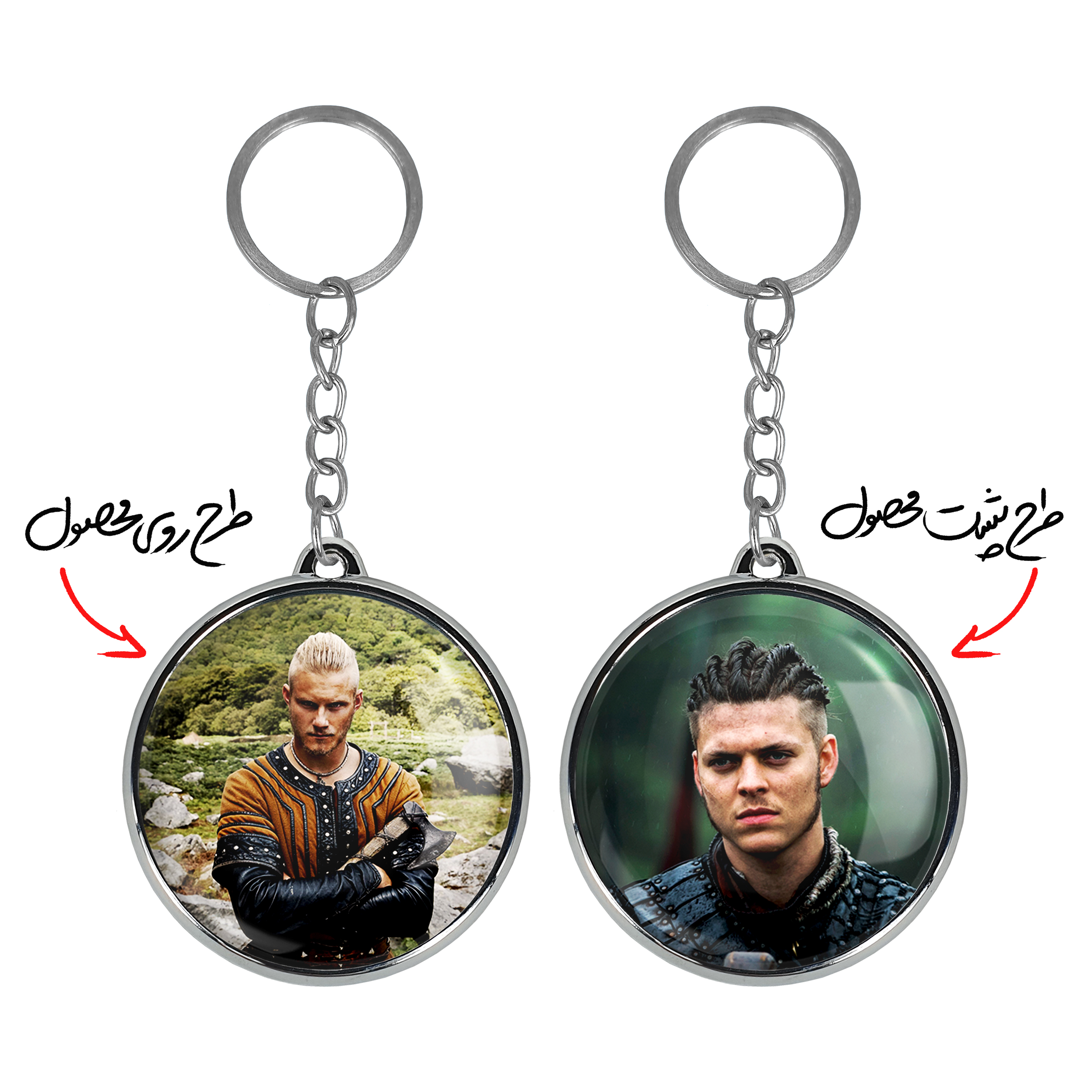 جاکلیدی دوطرفه بیورن سریال وایکینگ ها Vikingsخندالو محصولی کاربردی و جدید است که در هر دو سمت محصول، تصویری متفاوت اما از یک موضوع چاپ شده و تفاوت اصلی آن با جاکلیدی های یک طرفه در همین است که هر دو سمت پشت و روی جاکلیدی، طرحی دیدنی و جذاب دارد. همچنین رینگ بکار برده شده برای دور طرح ها آبکاری کروم درجه یک و رنگ ثابت است و برخلاف سایر محصولات مشابه، از رنگ های متفرقه و یا سفید استفاده نشده، که این مهم، زیبایی محصول نهایی را چند برابر کرده است. جاکلیدی های دوطرفه بیورن سریال وایکینگ ها Vikingsبا استفاده از روکش سلفون براق ضدخش تولید شده که خاصیت ضدخش بودن آن عمر مفید استفاده از جاکلیدی ها را افزایش میدهد. چاپ جاکلیدی ها با دستگاه های استاندارد و با بهترین سطح کیفیت صورت گرفته و طرح با شفافیتی مثال زدنی و با سلفون چسبی تولید شده است که باعث شده محصول نهایی بدون شکست نور دیده شود. همچنین بسته بندی جذاب و مینیمال جاکلیدی دوطرفه بیورن سریال وایکینگ ها Vikings، آنها را محصولی مناسب هدیه کرده است. زنجیر و حلقه بکار برده شده در جاکلیدی خندالو از نوع حلقه ضخیم و محکم بوده و حین استفاده آسیب نمی بیند.