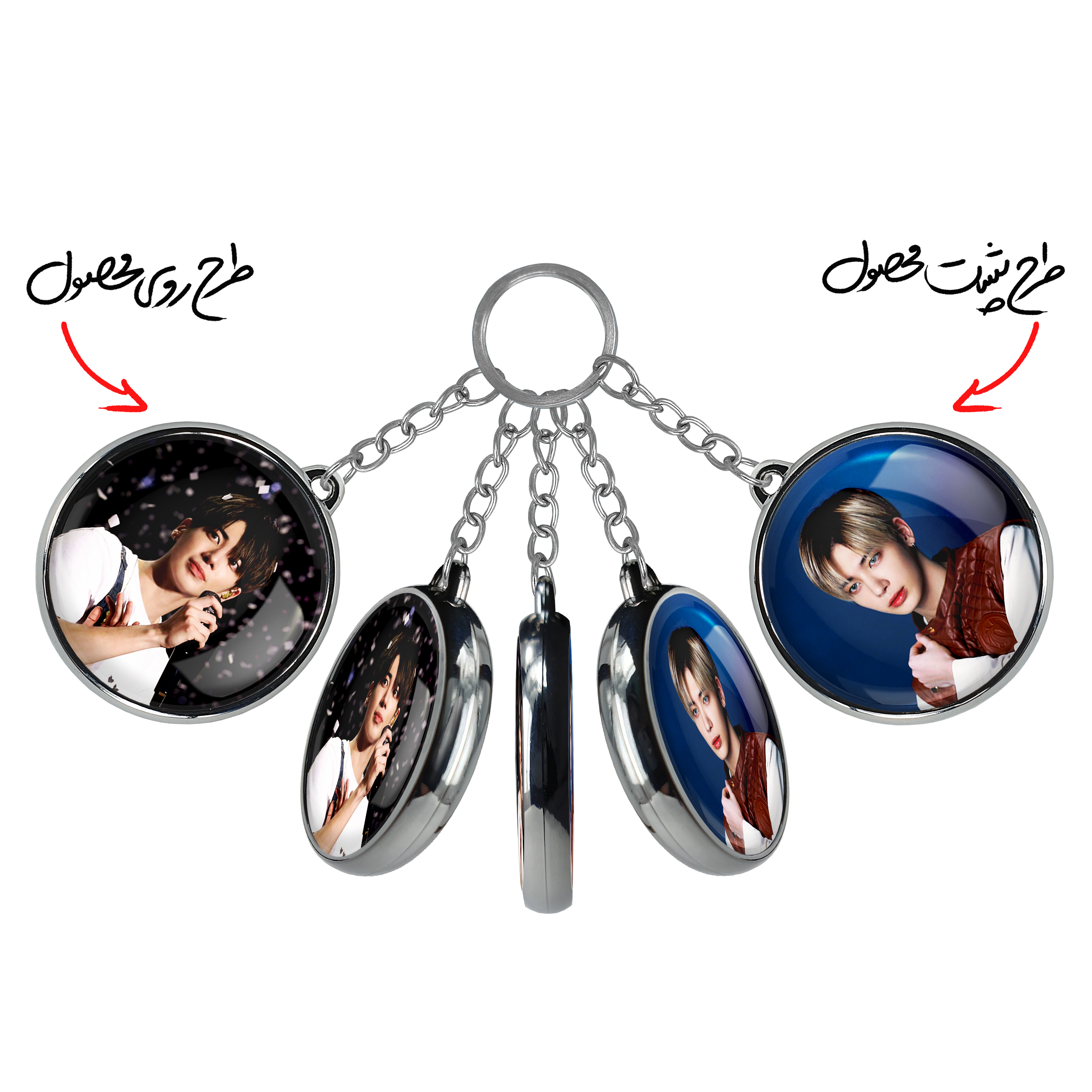 جاکلیدی دوطرفه تهیون گروه تی اکس تی TXT خندالو محصولی کاربردی و جدید است که در هر دو سمت محصول، تصویری متفاوت اما از یک موضوع چاپ شده و تفاوت اصلی آن با جاکلیدی های یک طرفه در همین است که هر دو سمت پشت و روی جاکلیدی، طرحی دیدنی و جذاب دارد. همچنین رینگ بکار برده شده برای دور طرح ها آبکاری کروم درجه یک و رنگ ثابت است و برخلاف سایر محصولات مشابه، از رنگ های متفرقه و یا سفید استفاده نشده، که این مهم، زیبایی محصول نهایی را چند برابر کرده است. جاکلیدی های دوطرفه تهیون گروه تی اکس تی TXT با استفاده از روکش سلفون براق ضدخش تولید شده که خاصیت ضدخش بودن آن عمر مفید استفاده از جاکلیدی ها را افزایش میدهد. چاپ جاکلیدی ها با دستگاه های استاندارد و با بهترین سطح کیفیت صورت گرفته و طرح با شفافیتی مثال زدنی و با سلفون چسبی تولید شده است که باعث شده محصول نهایی بدون شکست نور دیده شود. همچنین بسته بندی جذاب و مینیمال جاکلیدی دوطرفه تهیون گروه تی اکس تی TXT ، آنها را محصولی مناسب هدیه کرده است. زنجیر و حلقه بکار برده شده در جاکلیدی خندالو از نوع حلقه ضخیم و محکم بوده و حین استفاده آسیب نمی بیند.