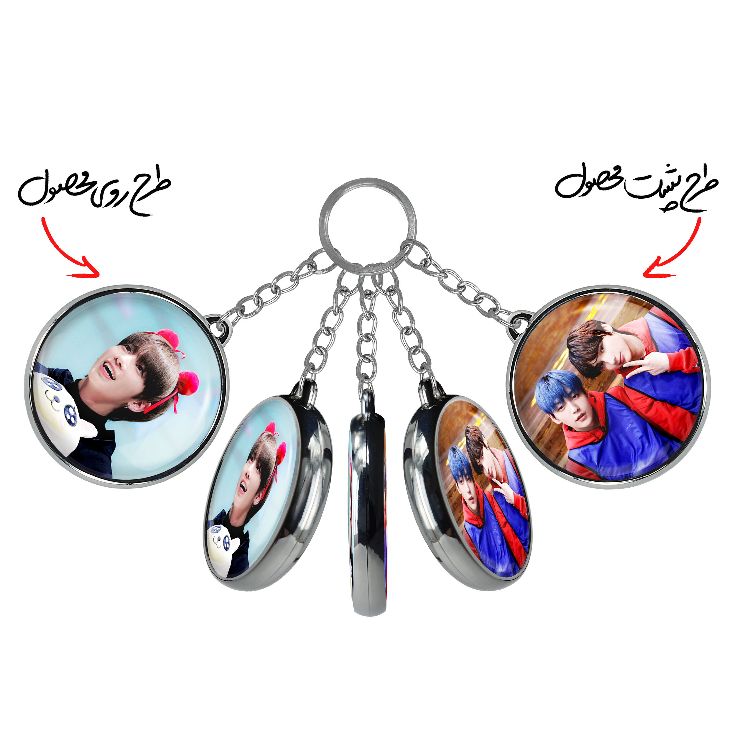 جاکلیدی دوطرفه تهیون گروه تی اکس تی TXT خندالو محصولی کاربردی و جدید است که در هر دو سمت محصول، تصویری متفاوت اما از یک موضوع چاپ شده و تفاوت اصلی آن با جاکلیدی های یک طرفه در همین است که هر دو سمت پشت و روی جاکلیدی، طرحی دیدنی و جذاب دارد. همچنین رینگ بکار برده شده برای دور طرح ها آبکاری کروم درجه یک و رنگ ثابت است و برخلاف سایر محصولات مشابه، از رنگ های متفرقه و یا سفید استفاده نشده، که این مهم، زیبایی محصول نهایی را چند برابر کرده است. جاکلیدی های دوطرفه تهیون گروه تی اکس تی TXT با استفاده از روکش سلفون براق ضدخش تولید شده که خاصیت ضدخش بودن آن عمر مفید استفاده از جاکلیدی ها را افزایش میدهد. چاپ جاکلیدی ها با دستگاه های استاندارد و با بهترین سطح کیفیت صورت گرفته و طرح با شفافیتی مثال زدنی و با سلفون چسبی تولید شده است که باعث شده محصول نهایی بدون شکست نور دیده شود. همچنین بسته بندی جذاب و مینیمال جاکلیدی دوطرفه تهیون گروه تی اکس تی TXT ، آنها را محصولی مناسب هدیه کرده است. زنجیر و حلقه بکار برده شده در جاکلیدی خندالو از نوع حلقه ضخیم و محکم بوده و حین استفاده آسیب نمی بیند.