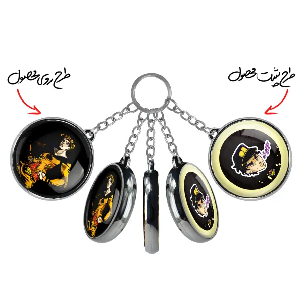 جاکلیدی دوطرفه جوجو انیمه Jojo خندالو محصولی کاربردی و جدید است که در هر دو سمت محصول، تصویری متفاوت اما از یک موضوع چاپ شده و تفاوت اصلی آن با جاکلیدی های یک طرفه در همین است که هر دو سمت پشت و روی جاکلیدی، طرحی دیدنی و جذاب دارد. همچنین رینگ بکار برده شده برای دور طرح ها آبکاری کروم درجه یک و رنگ ثابت است و برخلاف سایر محصولات مشابه، از رنگ های متفرقه و یا سفید استفاده نشده، که این مهم، زیبایی محصول نهایی را چند برابر کرده است. جاکلیدی های دوطرفه جوجو انیمه Jojo با استفاده از روکش سلفون براق ضدخش تولید شده که خاصیت ضدخش بودن آن عمر مفید استفاده از جاکلیدی ها را افزایش میدهد. چاپ جاکلیدی ها با دستگاه های استاندارد و با بهترین سطح کیفیت صورت گرفته و طرح با شفافیتی مثال زدنی و با سلفون چسبی تولید شده است که باعث شده محصول نهایی بدون شکست نور دیده شود. همچنین بسته بندی جذاب و مینیمال جاکلیدی دوطرفه جوجو انیمه Jojo ، آنها را محصولی مناسب هدیه کرده است. زنجیر و حلقه بکار برده شده در جاکلیدی خندالو از نوع حلقه ضخیم و محکم بوده و حین استفاده آسیب نمی بیند.