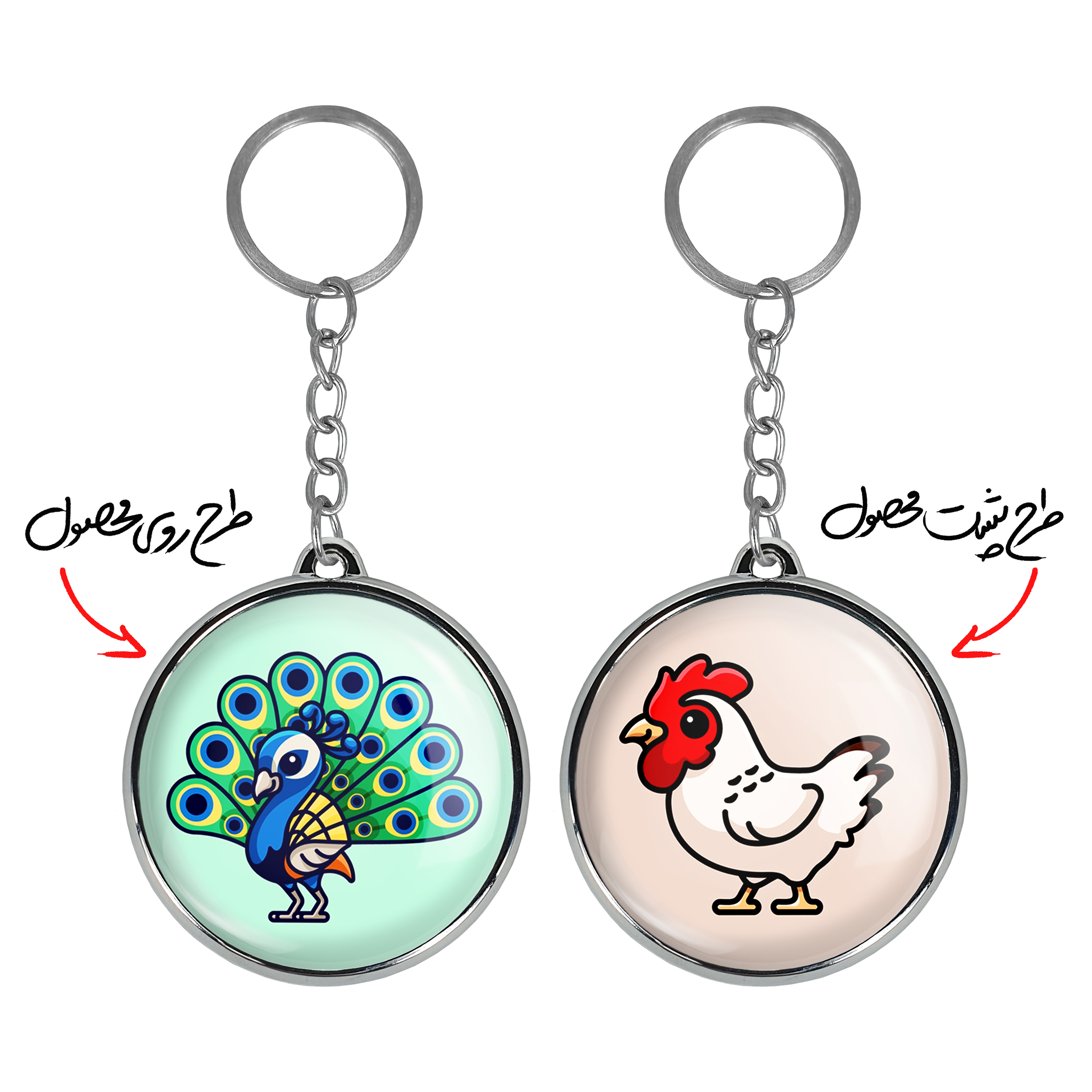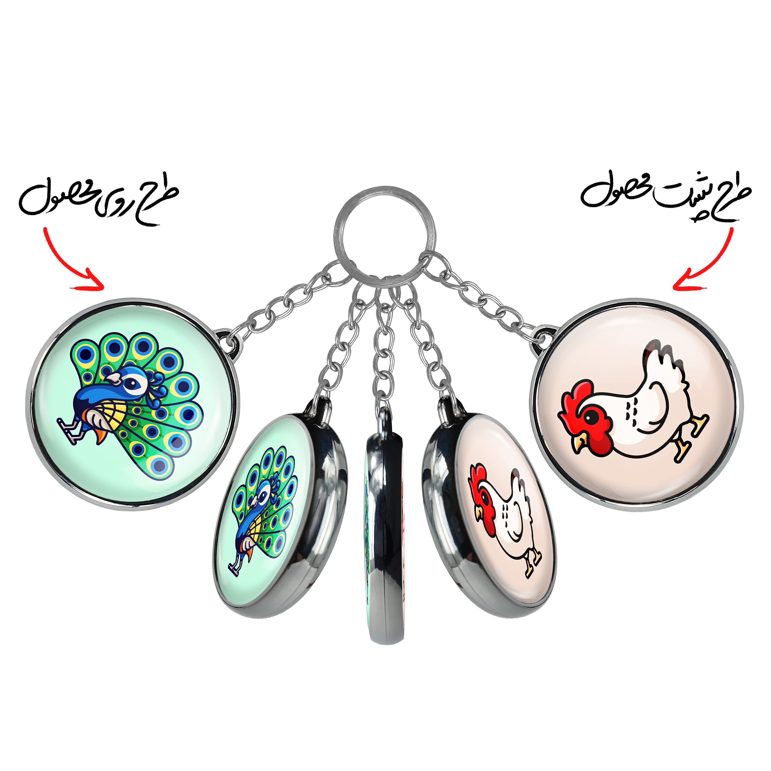 جاکلیدی دوطرفه حیوانات بامزه طاووسخندالو محصولی کاربردی و جدید است که در هر دو سمت محصول، تصویری متفاوت اما از یک موضوع چاپ شده و تفاوت اصلی آن با جاکلیدی های یک طرفه در همین است که هر دو سمت پشت و روی جاکلیدی، طرحی دیدنی و جذاب دارد. همچنین رینگ بکار برده شده برای دور طرح ها آبکاری کروم درجه یک و رنگ ثابت است و برخلاف سایر محصولات مشابه، از رنگ های متفرقه و یا سفید استفاده نشده، که این مهم، زیبایی محصول نهایی را چند برابر کرده است. جاکلیدی های دوطرفه حیوانات بامزه طاووسبا استفاده از روکش سلفون براق ضدخش تولید شده که خاصیت ضدخش بودن آن عمر مفید استفاده از جاکلیدی ها را افزایش میدهد. چاپ جاکلیدی ها با دستگاه های استاندارد و با بهترین سطح کیفیت صورت گرفته و طرح با شفافیتی مثال زدنی و با سلفون چسبی تولید شده است که باعث شده محصول نهایی بدون شکست نور دیده شود. همچنین بسته بندی جذاب و مینیمال جاکلیدی دوطرفه حیوانات بامزه طاووس، آنها را محصولی مناسب هدیه کرده است. زنجیر و حلقه بکار برده شده در جاکلیدی خندالو از نوع حلقه ضخیم و محکم بوده و حین استفاده آسیب نمی بیند.