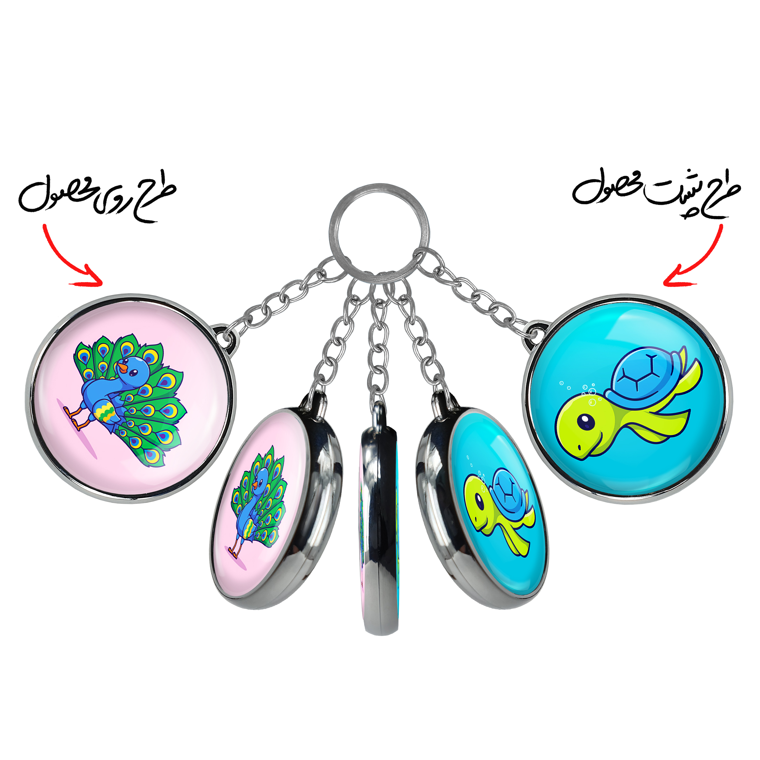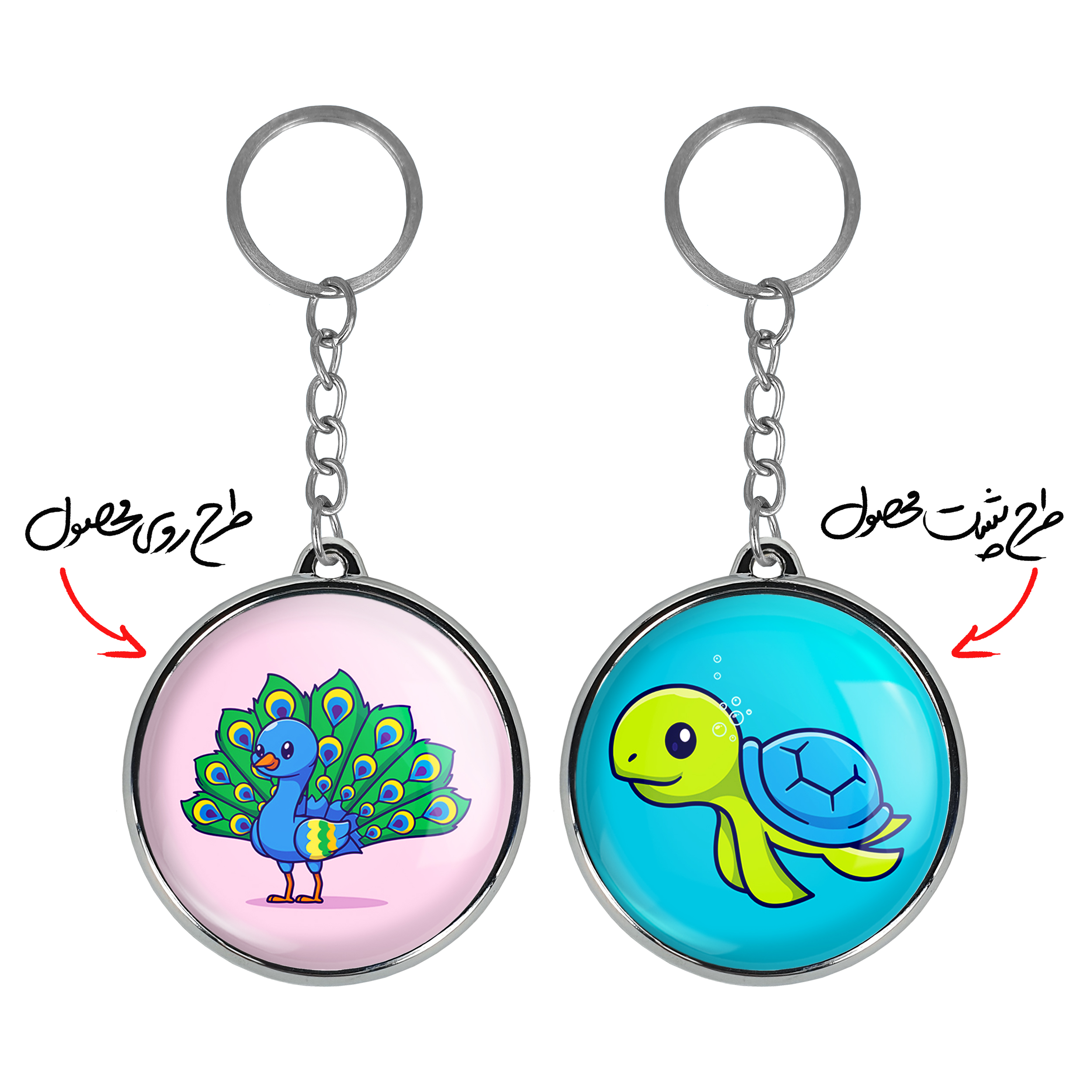 جاکلیدی دوطرفه حیوانات بامزه طاووسخندالو محصولی کاربردی و جدید است که در هر دو سمت محصول، تصویری متفاوت اما از یک موضوع چاپ شده و تفاوت اصلی آن با جاکلیدی های یک طرفه در همین است که هر دو سمت پشت و روی جاکلیدی، طرحی دیدنی و جذاب دارد. همچنین رینگ بکار برده شده برای دور طرح ها آبکاری کروم درجه یک و رنگ ثابت است و برخلاف سایر محصولات مشابه، از رنگ های متفرقه و یا سفید استفاده نشده، که این مهم، زیبایی محصول نهایی را چند برابر کرده است. جاکلیدی های دوطرفه حیوانات بامزه طاووسبا استفاده از روکش سلفون براق ضدخش تولید شده که خاصیت ضدخش بودن آن عمر مفید استفاده از جاکلیدی ها را افزایش میدهد. چاپ جاکلیدی ها با دستگاه های استاندارد و با بهترین سطح کیفیت صورت گرفته و طرح با شفافیتی مثال زدنی و با سلفون چسبی تولید شده است که باعث شده محصول نهایی بدون شکست نور دیده شود. همچنین بسته بندی جذاب و مینیمال جاکلیدی دوطرفه حیوانات بامزه طاووس، آنها را محصولی مناسب هدیه کرده است. زنجیر و حلقه بکار برده شده در جاکلیدی خندالو از نوع حلقه ضخیم و محکم بوده و حین استفاده آسیب نمی بیند.