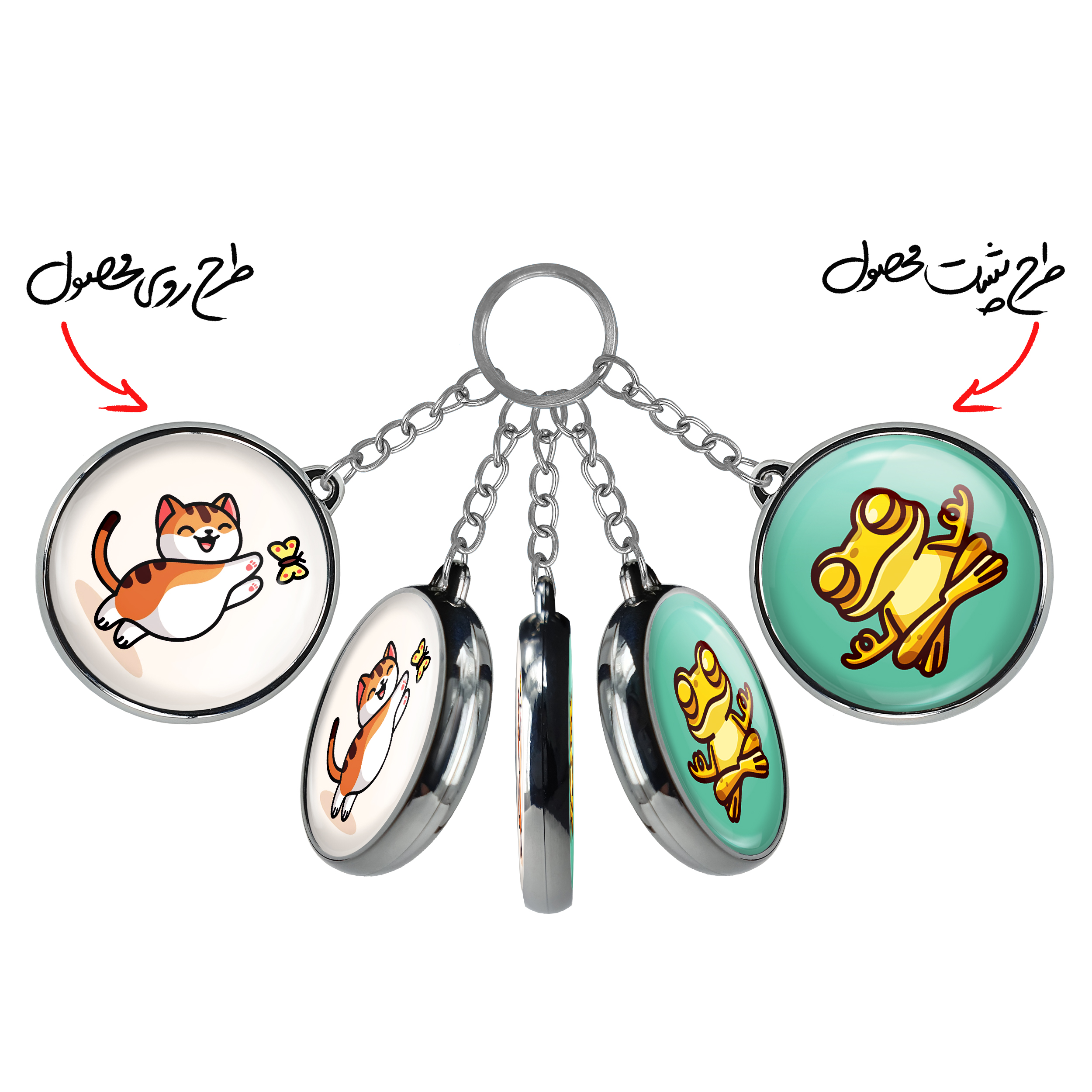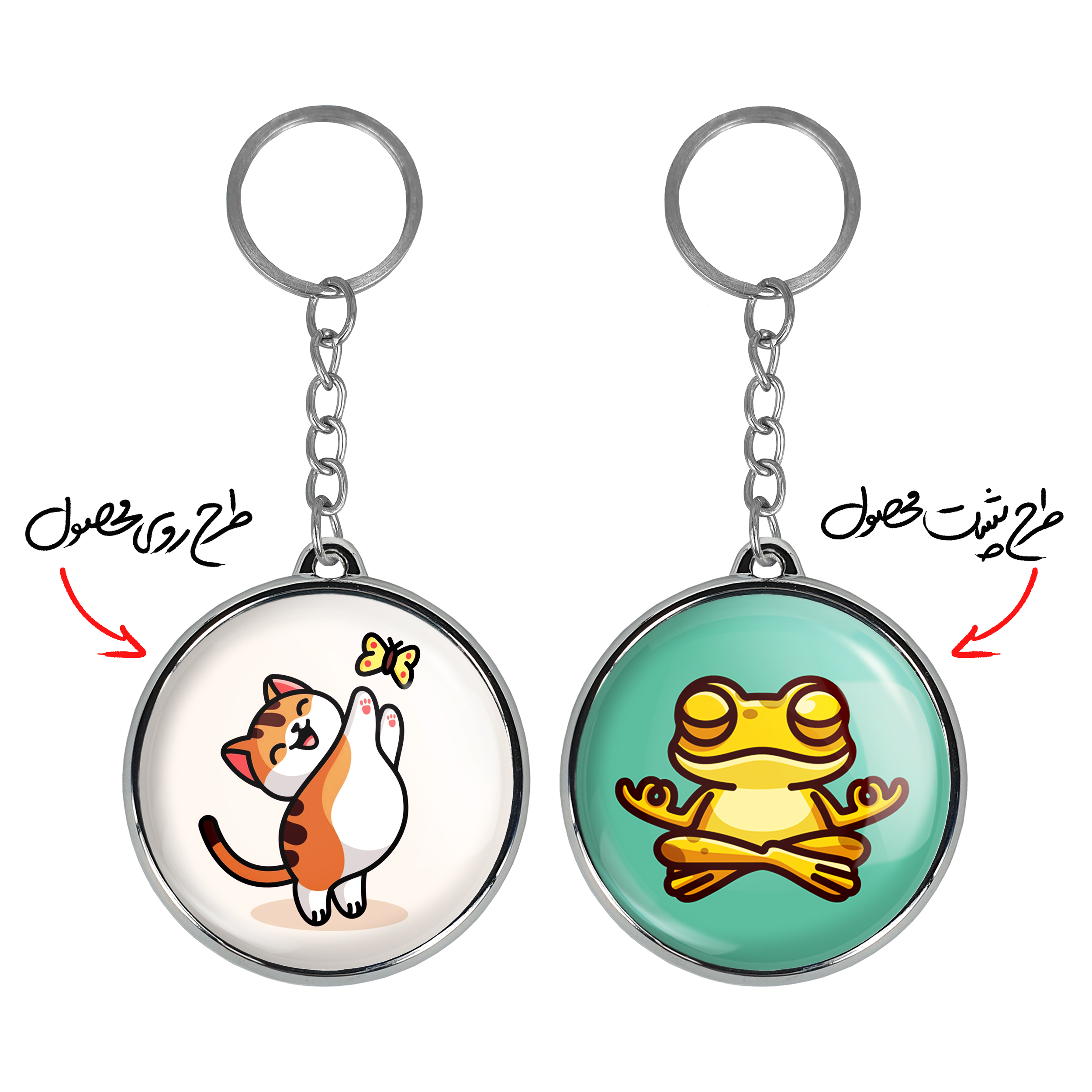 جاکلیدی دوطرفه حیوانات بامزه گربه و پروانهخندالو محصولی کاربردی و جدید است که در هر دو سمت محصول، تصویری متفاوت اما از یک موضوع چاپ شده و تفاوت اصلی آن با جاکلیدی های یک طرفه در همین است که هر دو سمت پشت و روی جاکلیدی، طرحی دیدنی و جذاب دارد. همچنین رینگ بکار برده شده برای دور طرح ها آبکاری کروم درجه یک و رنگ ثابت است و برخلاف سایر محصولات مشابه، از رنگ های متفرقه و یا سفید استفاده نشده، که این مهم، زیبایی محصول نهایی را چند برابر کرده است. جاکلیدی های دوطرفه حیوانات بامزه گربه و پروانهبا استفاده از روکش سلفون براق ضدخش تولید شده که خاصیت ضدخش بودن آن عمر مفید استفاده از جاکلیدی ها را افزایش میدهد. چاپ جاکلیدی ها با دستگاه های استاندارد و با بهترین سطح کیفیت صورت گرفته و طرح با شفافیتی مثال زدنی و با سلفون چسبی تولید شده است که باعث شده محصول نهایی بدون شکست نور دیده شود. همچنین بسته بندی جذاب و مینیمال جاکلیدی دوطرفه حیوانات بامزه گربه و پروانه، آنها را محصولی مناسب هدیه کرده است. زنجیر و حلقه بکار برده شده در جاکلیدی خندالو از نوع حلقه ضخیم و محکم بوده و حین استفاده آسیب نمی بیند.