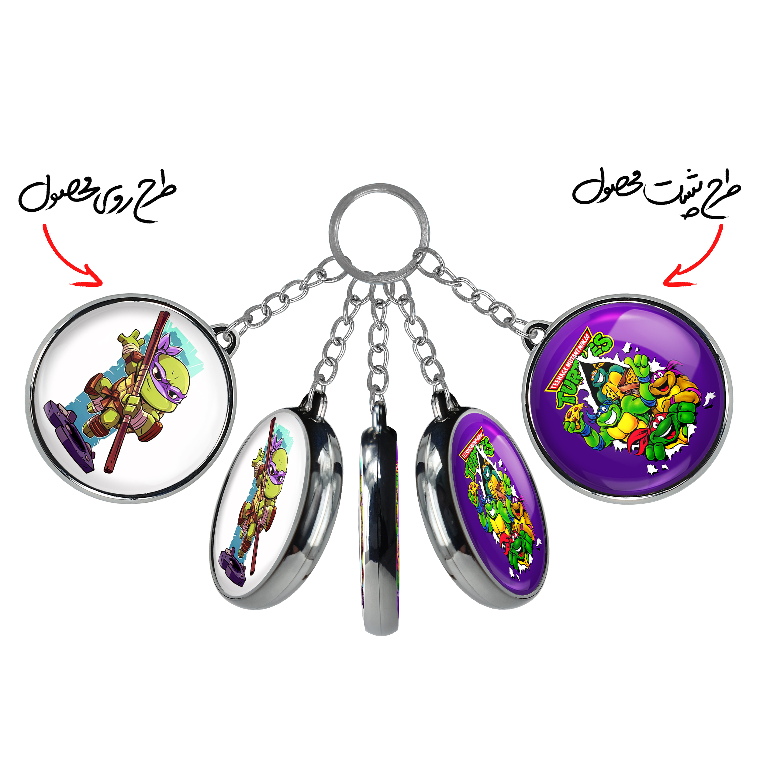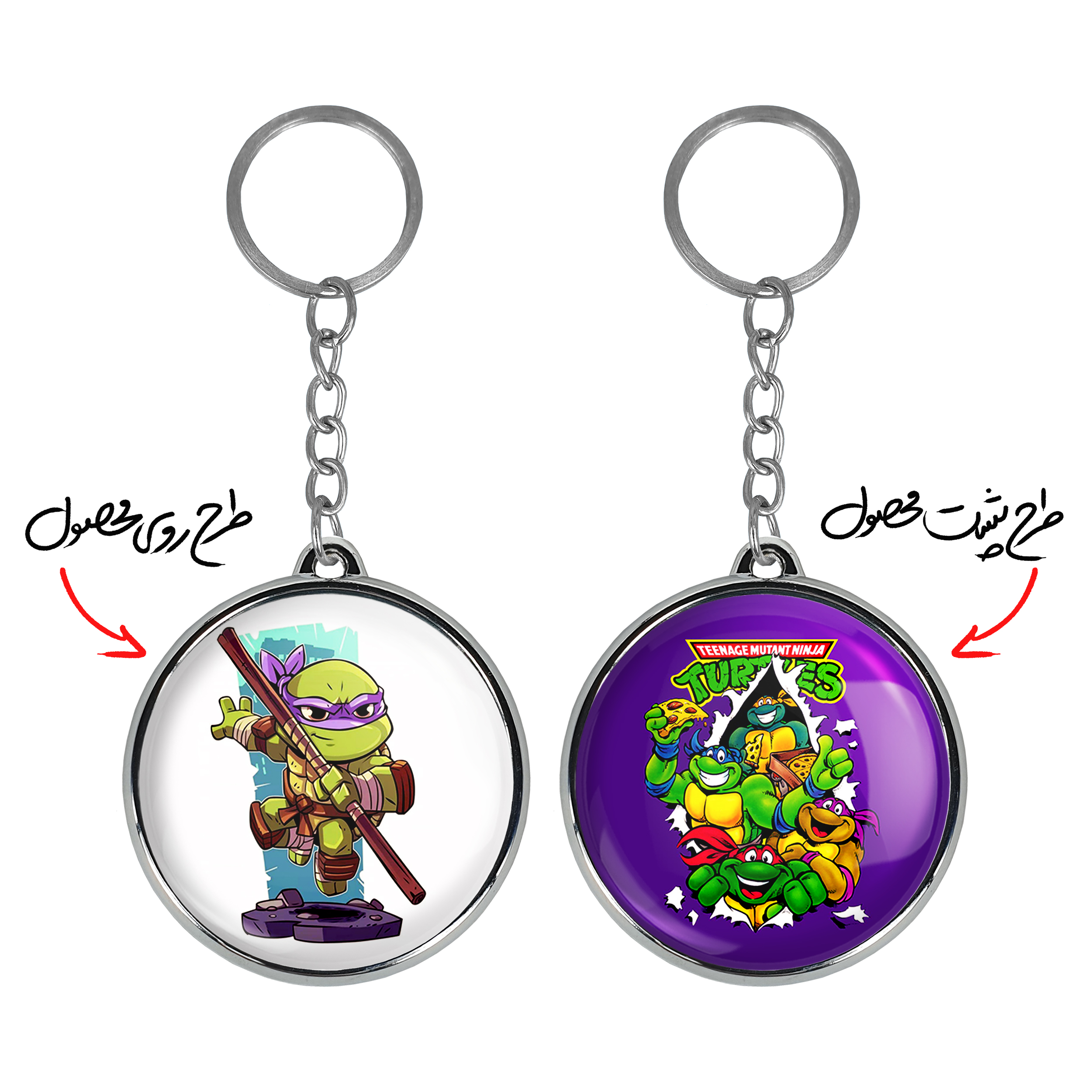 جاکلیدی دوطرفه داناتلو لاکپشت های نینجا خندالو محصولی کاربردی و جدید است که در هر دو سمت محصول، تصویری متفاوت اما از یک موضوع چاپ شده و تفاوت اصلی آن با جاکلیدی های یک طرفه در همین است که هر دو سمت پشت و روی جاکلیدی، طرحی دیدنی و جذاب دارد. همچنین رینگ بکار برده شده برای دور طرح ها آبکاری کروم درجه یک و رنگ ثابت است و برخلاف سایر محصولات مشابه، از رنگ های متفرقه و یا سفید استفاده نشده، که این مهم، زیبایی محصول نهایی را چند برابر کرده است. جاکلیدی های دوطرفه داناتلو لاکپشت های نینجا با استفاده از روکش سلفون براق ضدخش تولید شده که خاصیت ضدخش بودن آن عمر مفید استفاده از جاکلیدی ها را افزایش میدهد. چاپ جاکلیدی ها با دستگاه های استاندارد و با بهترین سطح کیفیت صورت گرفته و طرح با شفافیتی مثال زدنی و با سلفون چسبی تولید شده است که باعث شده محصول نهایی بدون شکست نور دیده شود. همچنین بسته بندی جذاب و مینیمال جاکلیدی دوطرفه داناتلو لاکپشت های نینجا ، آنها را محصولی مناسب هدیه کرده است. زنجیر و حلقه بکار برده شده در جاکلیدی خندالو از نوع حلقه ضخیم و محکم بوده و حین استفاده آسیب نمی بیند.