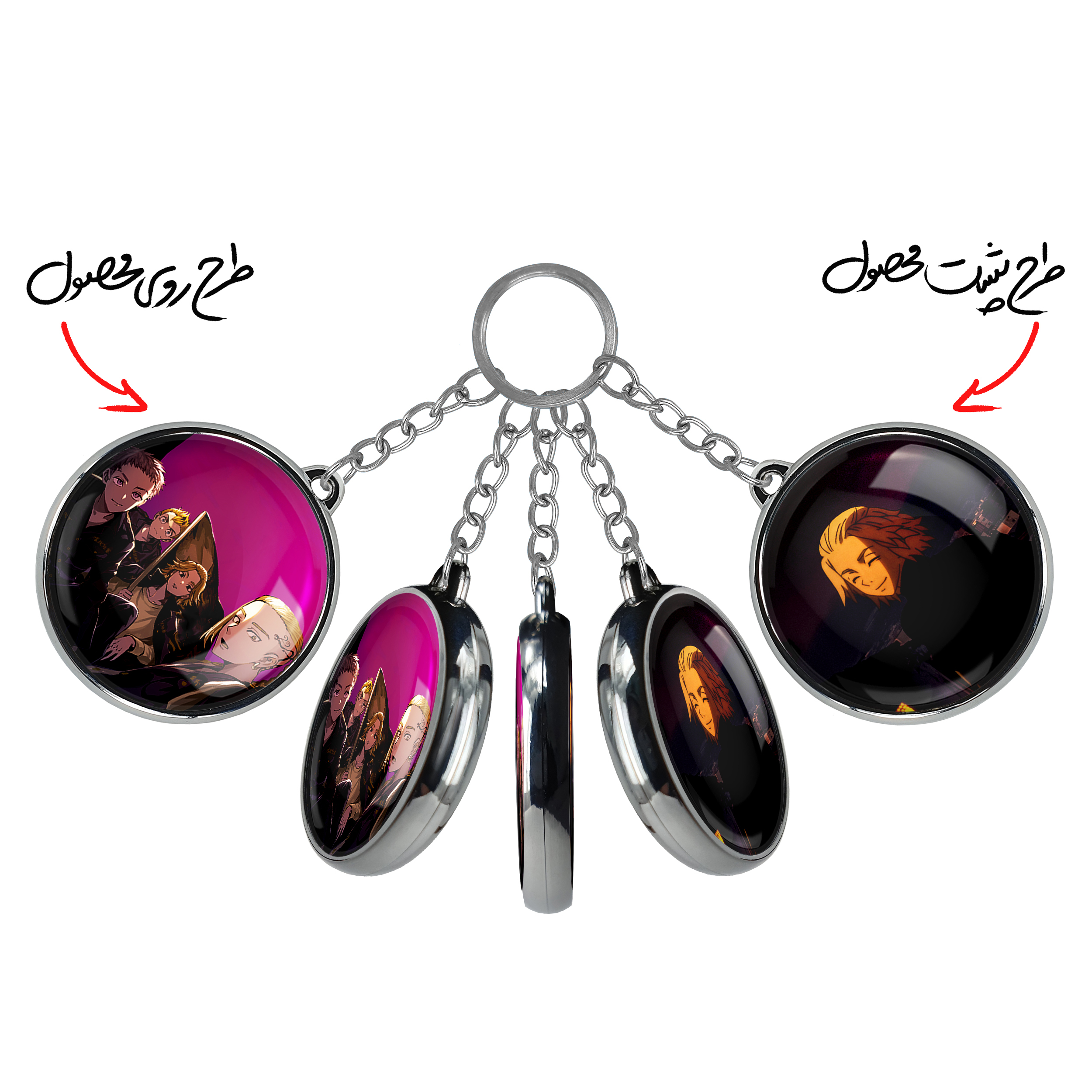 جاکلیدی دوطرفه دراکن و مایکی و تاکه متچی و میتسویا انیمه توکیو ریونجرز خندالو محصولی کاربردی و جدید است که در هر دو سمت محصول، تصویری متفاوت اما از یک موضوع چاپ شده و تفاوت اصلی آن با جاکلیدی های یک طرفه در همین است که هر دو سمت پشت و روی جاکلیدی، طرحی دیدنی و جذاب دارد. همچنین رینگ بکار برده شده برای دور طرح ها آبکاری کروم درجه یک و رنگ ثابت است و برخلاف سایر محصولات مشابه، از رنگ های متفرقه و یا سفید استفاده نشده، که این مهم، زیبایی محصول نهایی را چند برابر کرده است. جاکلیدی های دوطرفه دراکن و مایکی و تاکه متچی و میتسویا انیمه توکیو ریونجرز با استفاده از روکش سلفون براق ضدخش تولید شده که خاصیت ضدخش بودن آن عمر مفید استفاده از جاکلیدی ها را افزایش میدهد. چاپ جاکلیدی ها با دستگاه های استاندارد و با بهترین سطح کیفیت صورت گرفته و طرح با شفافیتی مثال زدنی و با سلفون چسبی تولید شده است که باعث شده محصول نهایی بدون شکست نور دیده شود. همچنین بسته بندی جذاب و مینیمال جاکلیدی دوطرفه دراکن و مایکی و تاکه متچی و میتسویا انیمه توکیو ریونجرز ، آنها را محصولی مناسب هدیه کرده است. زنجیر و حلقه بکار برده شده در جاکلیدی خندالو از نوع حلقه ضخیم و محکم بوده و حین استفاده آسیب نمی بیند.