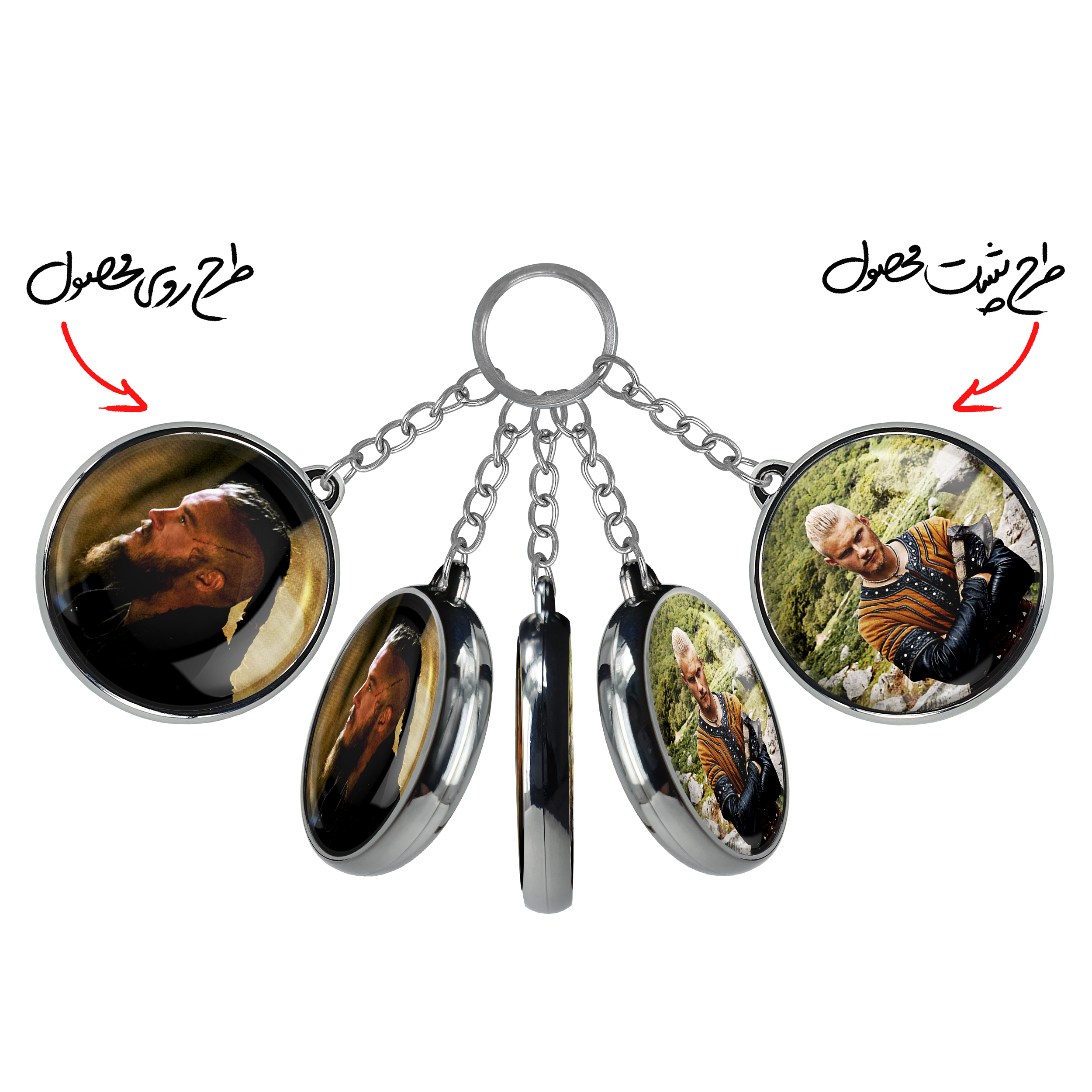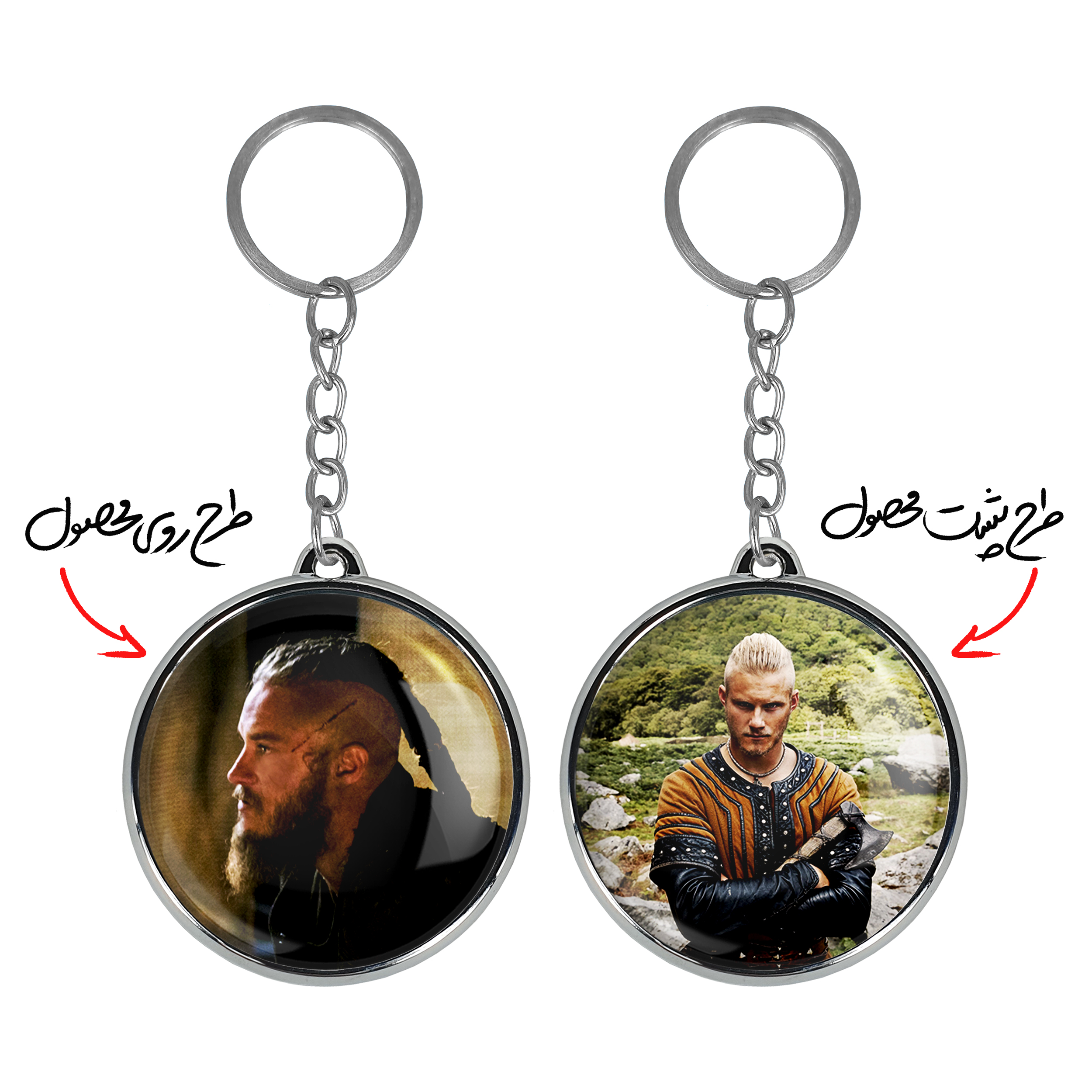 جاکلیدی دوطرفه رگنار سریال وایکینگ ها Vikingsخندالو محصولی کاربردی و جدید است که در هر دو سمت محصول، تصویری متفاوت اما از یک موضوع چاپ شده و تفاوت اصلی آن با جاکلیدی های یک طرفه در همین است که هر دو سمت پشت و روی جاکلیدی، طرحی دیدنی و جذاب دارد. همچنین رینگ بکار برده شده برای دور طرح ها آبکاری کروم درجه یک و رنگ ثابت است و برخلاف سایر محصولات مشابه، از رنگ های متفرقه و یا سفید استفاده نشده، که این مهم، زیبایی محصول نهایی را چند برابر کرده است. جاکلیدی های دوطرفه رگنار سریال وایکینگ ها Vikingsبا استفاده از روکش سلفون براق ضدخش تولید شده که خاصیت ضدخش بودن آن عمر مفید استفاده از جاکلیدی ها را افزایش میدهد. چاپ جاکلیدی ها با دستگاه های استاندارد و با بهترین سطح کیفیت صورت گرفته و طرح با شفافیتی مثال زدنی و با سلفون چسبی تولید شده است که باعث شده محصول نهایی بدون شکست نور دیده شود. همچنین بسته بندی جذاب و مینیمال جاکلیدی دوطرفه رگنار سریال وایکینگ ها Vikings، آنها را محصولی مناسب هدیه کرده است. زنجیر و حلقه بکار برده شده در جاکلیدی خندالو از نوع حلقه ضخیم و محکم بوده و حین استفاده آسیب نمی بیند.