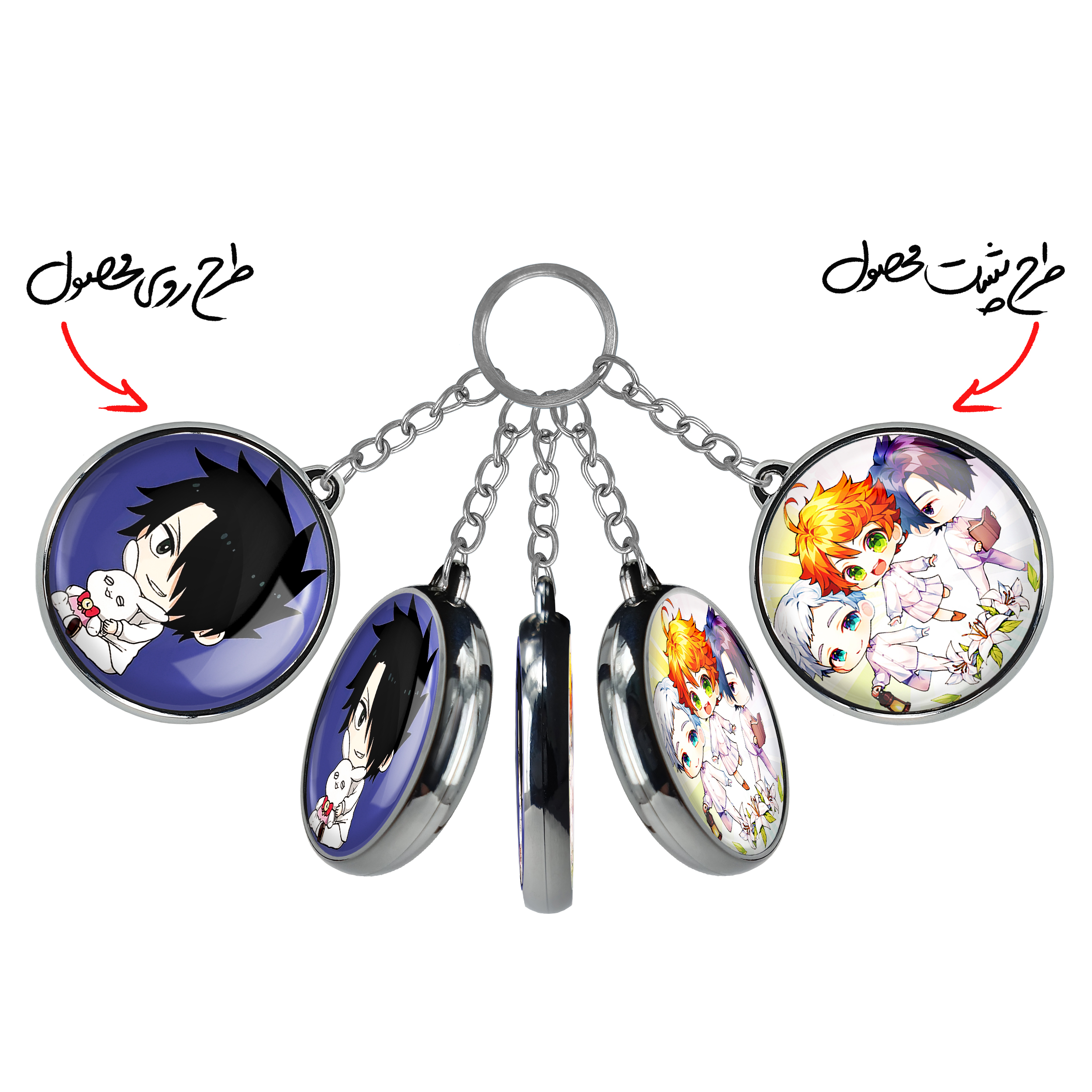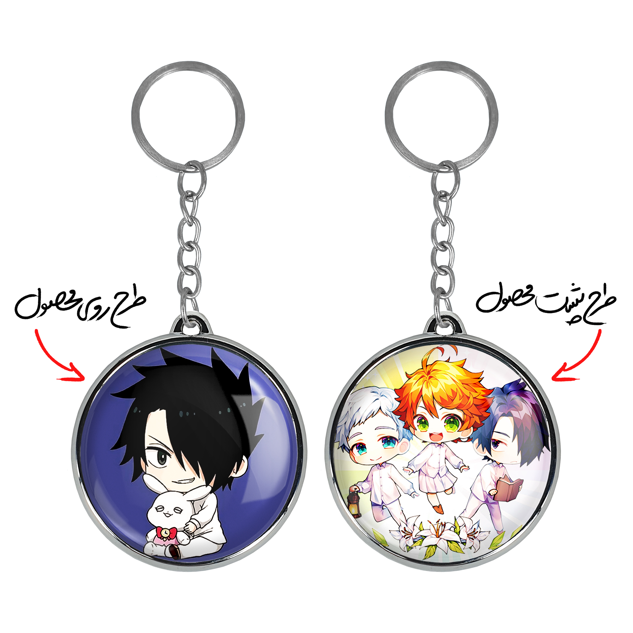 جاکلیدی دوطرفه ری انیمه ناکجا آباد موعود Promised Neverland خندالو محصولی کاربردی و جدید است که در هر دو سمت محصول، تصویری متفاوت اما از یک موضوع چاپ شده و تفاوت اصلی آن با جاکلیدی های یک طرفه در همین است که هر دو سمت پشت و روی جاکلیدی، طرحی دیدنی و جذاب دارد. همچنین رینگ بکار برده شده برای دور طرح ها آبکاری کروم درجه یک و رنگ ثابت است و برخلاف سایر محصولات مشابه، از رنگ های متفرقه و یا سفید استفاده نشده، که این مهم، زیبایی محصول نهایی را چند برابر کرده است. جاکلیدی های دوطرفه ری انیمه ناکجا آباد موعود Promised Neverland با استفاده از روکش سلفون براق ضدخش تولید شده که خاصیت ضدخش بودن آن عمر مفید استفاده از جاکلیدی ها را افزایش میدهد. چاپ جاکلیدی ها با دستگاه های استاندارد و با بهترین سطح کیفیت صورت گرفته و طرح با شفافیتی مثال زدنی و با سلفون چسبی تولید شده است که باعث شده محصول نهایی بدون شکست نور دیده شود. همچنین بسته بندی جذاب و مینیمال جاکلیدی دوطرفه ری انیمه ناکجا آباد موعود Promised Neverland ، آنها را محصولی مناسب هدیه کرده است. زنجیر و حلقه بکار برده شده در جاکلیدی خندالو از نوع حلقه ضخیم و محکم بوده و حین استفاده آسیب نمی بیند.