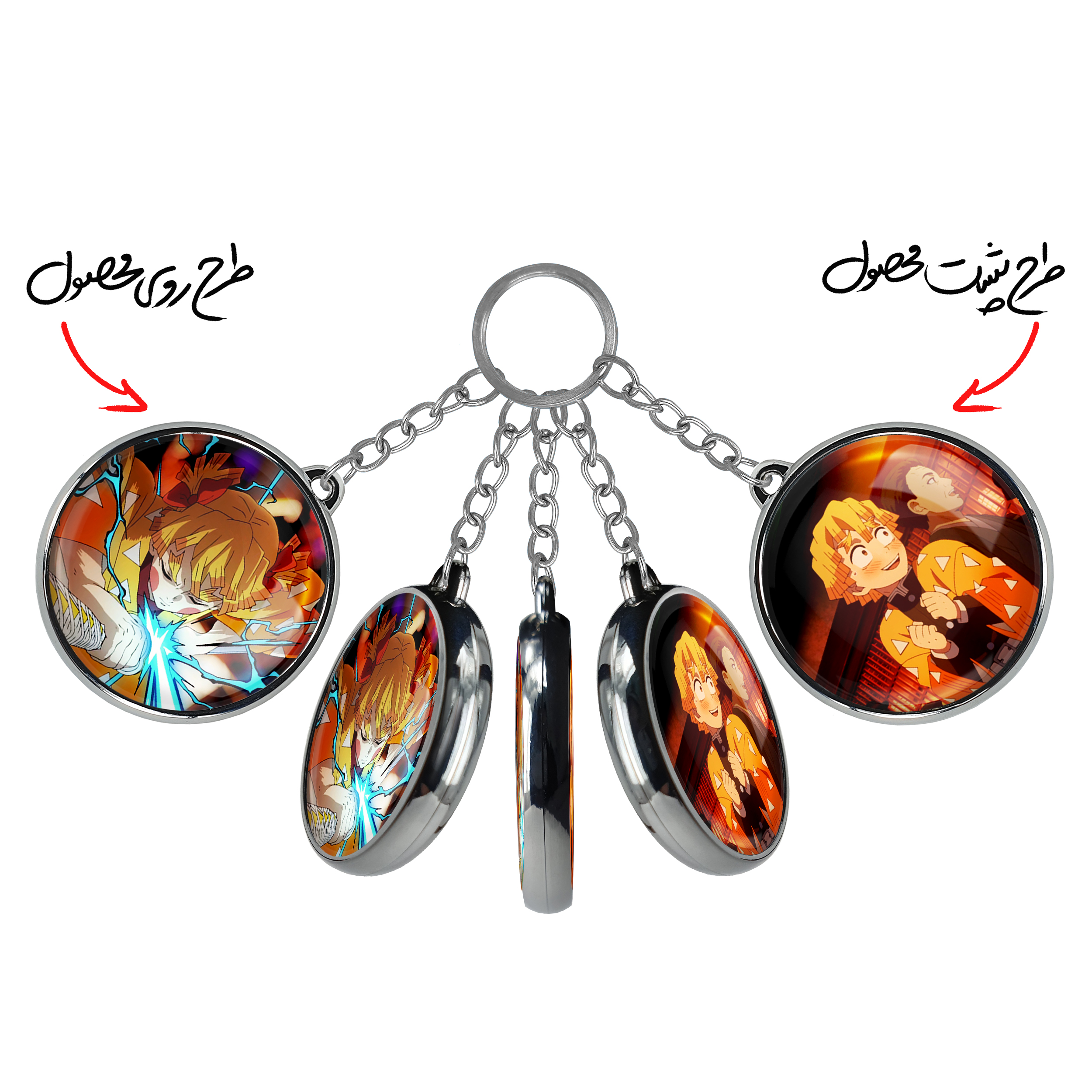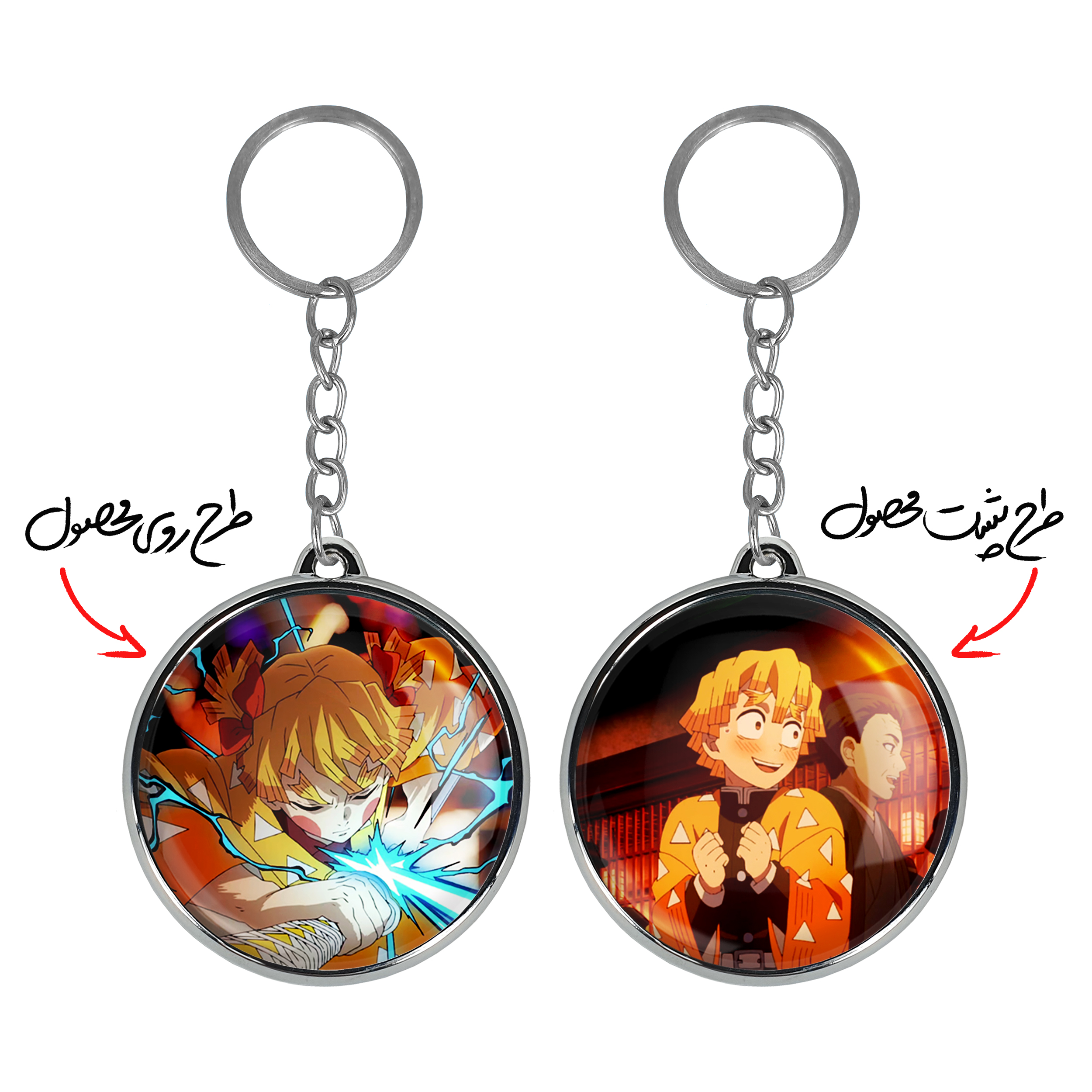 جاکلیدی دوطرفه زنیتسو انیمه شیطان کش خندالو محصولی کاربردی و جدید است که در هر دو سمت محصول، تصویری متفاوت اما از یک موضوع چاپ شده و تفاوت اصلی آن با جاکلیدی های یک طرفه در همین است که هر دو سمت پشت و روی جاکلیدی، طرحی دیدنی و جذاب دارد. همچنین رینگ بکار برده شده برای دور طرح ها آبکاری کروم درجه یک و رنگ ثابت است و برخلاف سایر محصولات مشابه، از رنگ های متفرقه و یا سفید استفاده نشده، که این مهم، زیبایی محصول نهایی را چند برابر کرده است. جاکلیدی های دوطرفه زنیتسو انیمه شیطان کش با استفاده از روکش سلفون براق ضدخش تولید شده که خاصیت ضدخش بودن آن عمر مفید استفاده از جاکلیدی ها را افزایش میدهد. چاپ جاکلیدی ها با دستگاه های استاندارد و با بهترین سطح کیفیت صورت گرفته و طرح با شفافیتی مثال زدنی و با سلفون چسبی تولید شده است که باعث شده محصول نهایی بدون شکست نور دیده شود. همچنین بسته بندی جذاب و مینیمال جاکلیدی دوطرفه زنیتسو انیمه شیطان کش ، آنها را محصولی مناسب هدیه کرده است. زنجیر و حلقه بکار برده شده در جاکلیدی خندالو از نوع حلقه ضخیم و محکم بوده و حین استفاده آسیب نمی بیند.