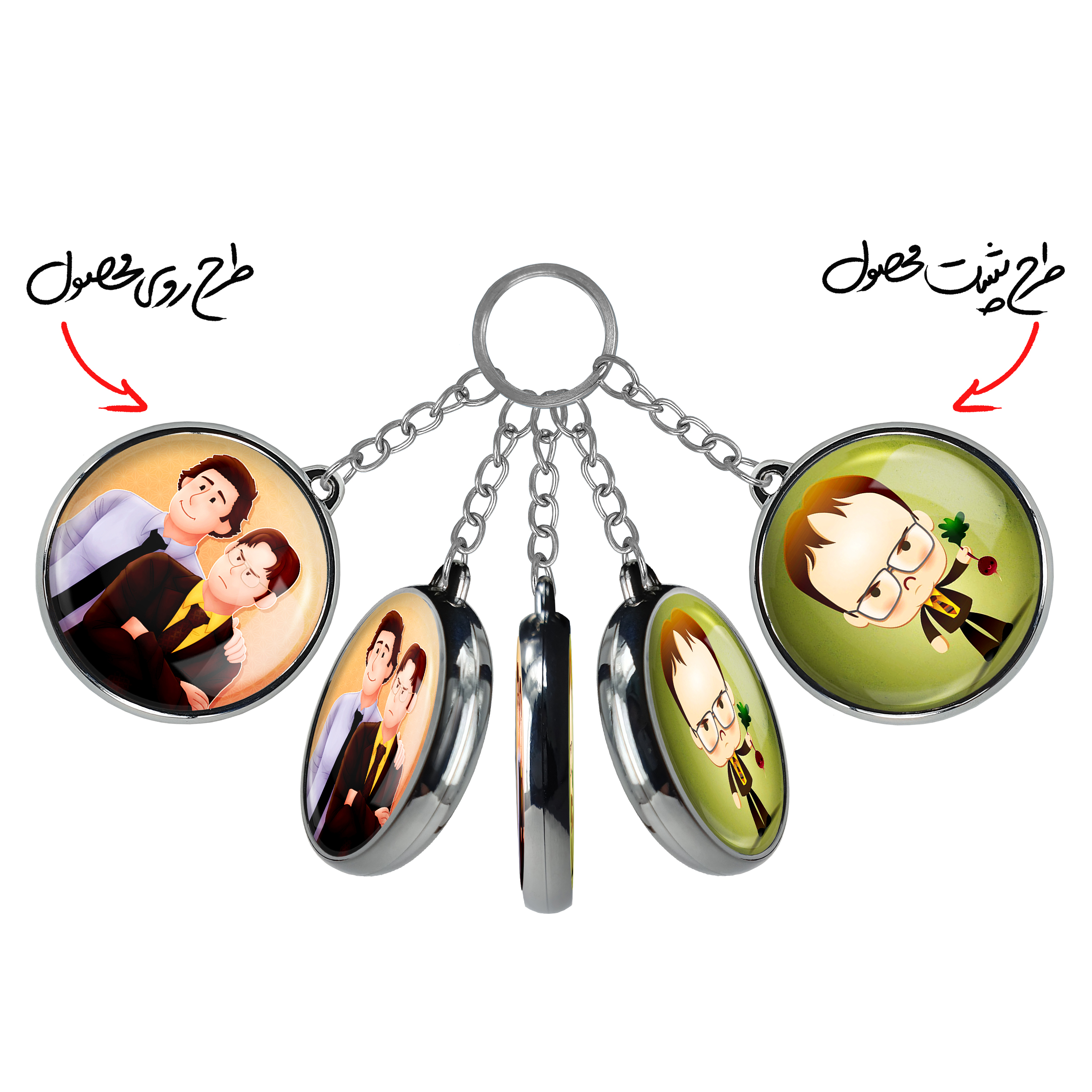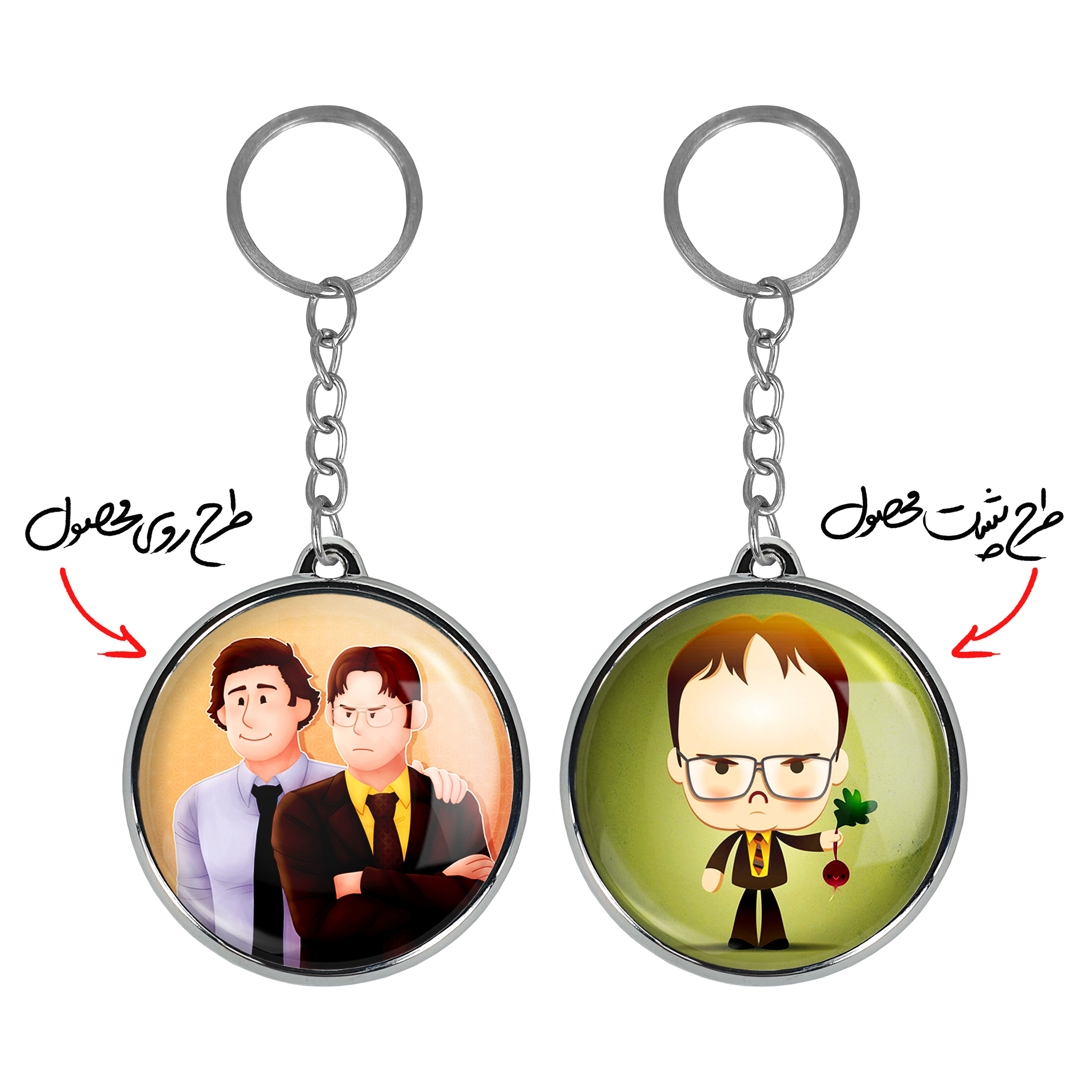 جاکلیدی دوطرفه سریال آفیس The Office خندالو محصولی کاربردی و جدید است که در هر دو سمت محصول، تصویری متفاوت اما از یک موضوع چاپ شده و تفاوت اصلی آن با جاکلیدی های یک طرفه در همین است که هر دو سمت پشت و روی جاکلیدی، طرحی دیدنی و جذاب دارد.
