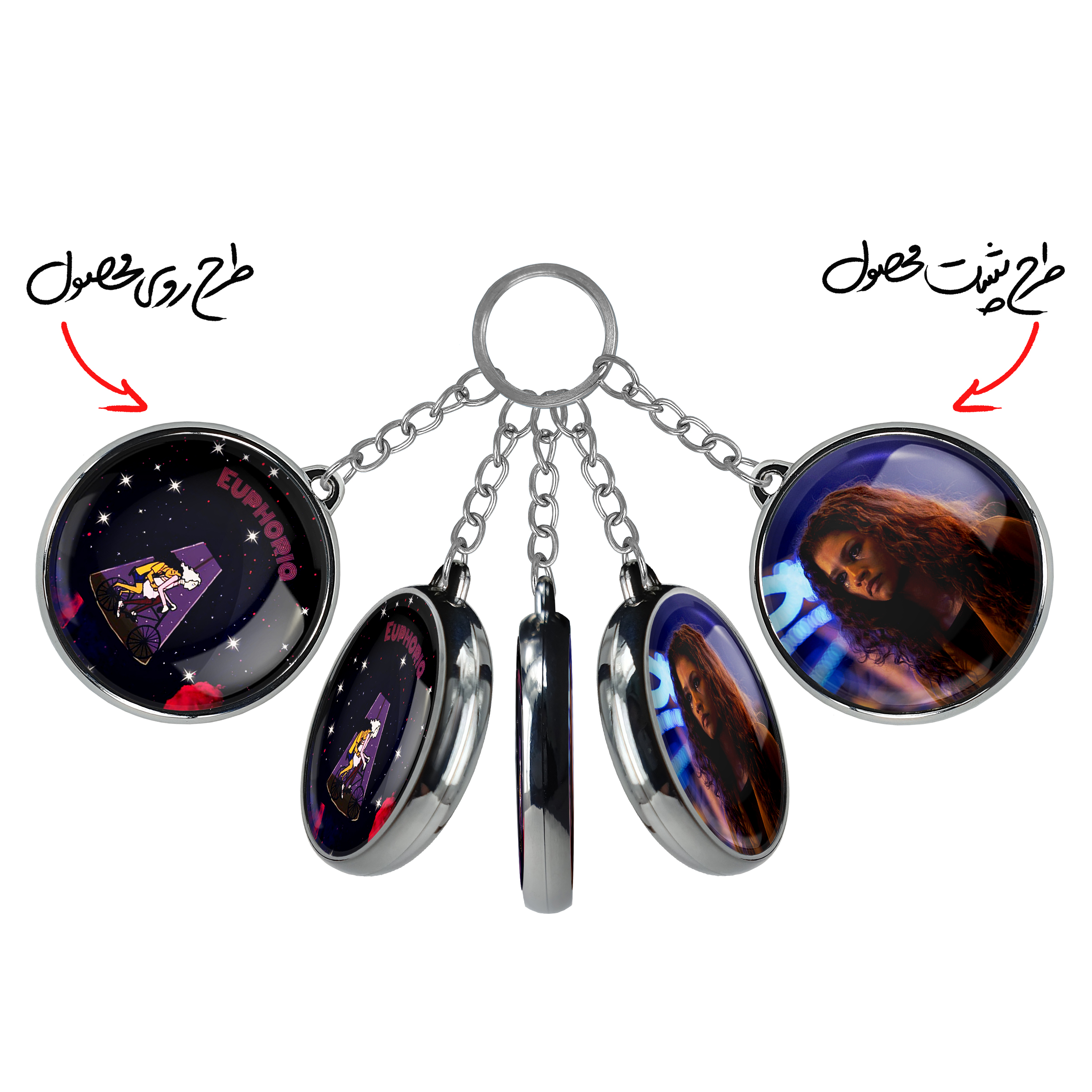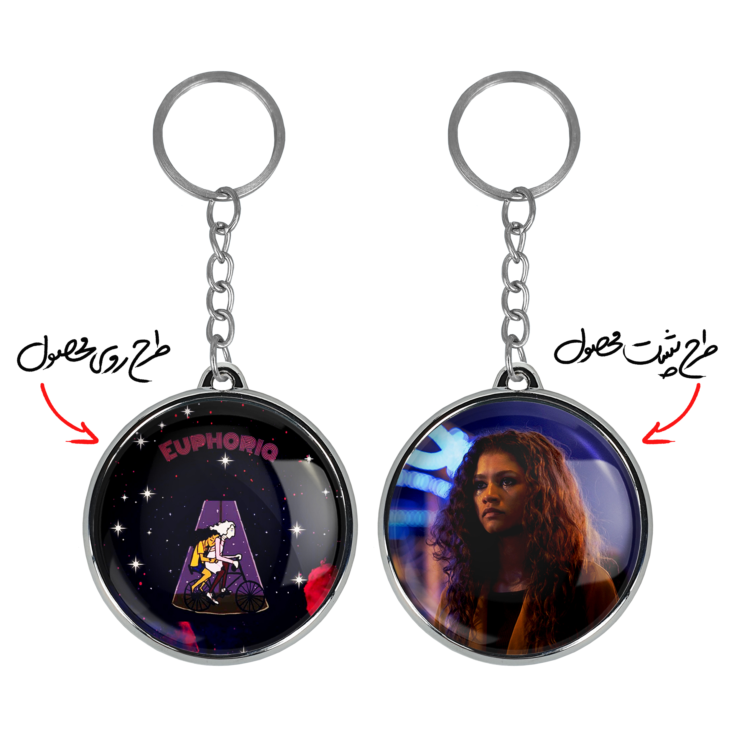 جاکلیدی دوطرفه سریال سرخوشی Euphoria خندالو محصولی کاربردی و جدید است که در هر دو سمت محصول، تصویری متفاوت اما از یک موضوع چاپ شده و تفاوت اصلی آن با جاکلیدی های یک طرفه در همین است که هر دو سمت پشت و روی جاکلیدی، طرحی دیدنی و جذاب دارد. همچنین رینگ بکار برده شده برای دور طرح ها آبکاری کروم درجه یک و رنگ ثابت است و برخلاف سایر محصولات مشابه، از رنگ های متفرقه و یا سفید استفاده نشده، که این مهم، زیبایی محصول نهایی را چند برابر کرده است. جاکلیدی های دوطرفه سریال سرخوشی Euphoria با استفاده از روکش سلفون براق ضدخش تولید شده که خاصیت ضدخش بودن آن عمر مفید استفاده از جاکلیدی ها را افزایش میدهد. چاپ جاکلیدی ها با دستگاه های استاندارد و با بهترین سطح کیفیت صورت گرفته و طرح با شفافیتی مثال زدنی و با سلفون چسبی تولید شده است که باعث شده محصول نهایی بدون شکست نور دیده شود. همچنین بسته بندی جذاب و مینیمال جاکلیدی دوطرفه سریال سرخوشی Euphoria ، آنها را محصولی مناسب هدیه کرده است. زنجیر و حلقه بکار برده شده در جاکلیدی خندالو از نوع حلقه ضخیم و محکم بوده و حین استفاده آسیب نمی بیند.