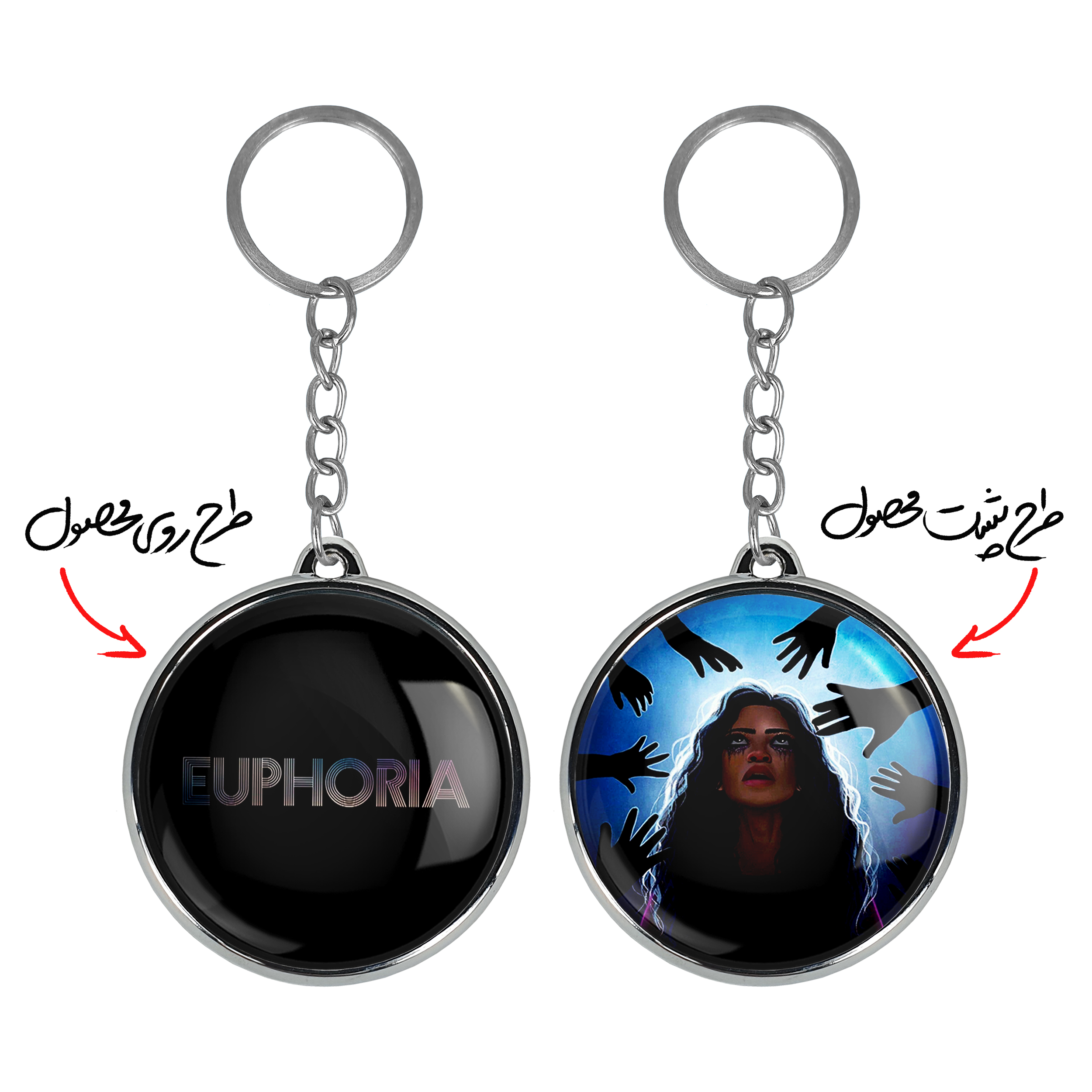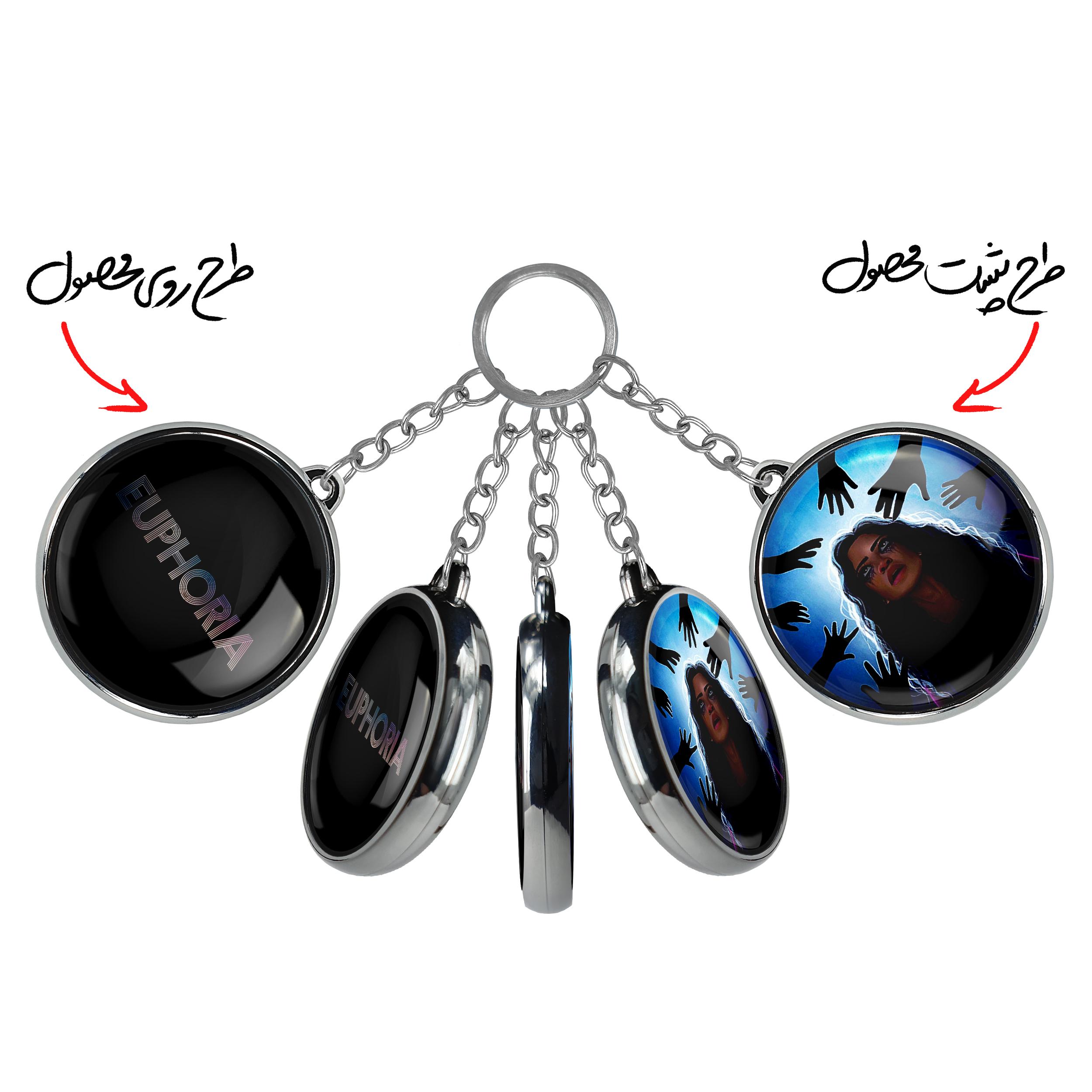 جاکلیدی دوطرفه سریال سرخوشی Euphoria خندالو محصولی کاربردی و جدید است که در هر دو سمت محصول، تصویری متفاوت اما از یک موضوع چاپ شده و تفاوت اصلی آن با جاکلیدی های یک طرفه در همین است که هر دو سمت پشت و روی جاکلیدی، طرحی دیدنی و جذاب دارد. همچنین رینگ بکار برده شده برای دور طرح ها آبکاری کروم درجه یک و رنگ ثابت است و برخلاف سایر محصولات مشابه، از رنگ های متفرقه و یا سفید استفاده نشده، که این مهم، زیبایی محصول نهایی را چند برابر کرده است. جاکلیدی های دوطرفه سریال سرخوشی Euphoria با استفاده از روکش سلفون براق ضدخش تولید شده که خاصیت ضدخش بودن آن عمر مفید استفاده از جاکلیدی ها را افزایش میدهد. چاپ جاکلیدی ها با دستگاه های استاندارد و با بهترین سطح کیفیت صورت گرفته و طرح با شفافیتی مثال زدنی و با سلفون چسبی تولید شده است که باعث شده محصول نهایی بدون شکست نور دیده شود. همچنین بسته بندی جذاب و مینیمال جاکلیدی دوطرفه سریال سرخوشی Euphoria ، آنها را محصولی مناسب هدیه کرده است. زنجیر و حلقه بکار برده شده در جاکلیدی خندالو از نوع حلقه ضخیم و محکم بوده و حین استفاده آسیب نمی بیند.