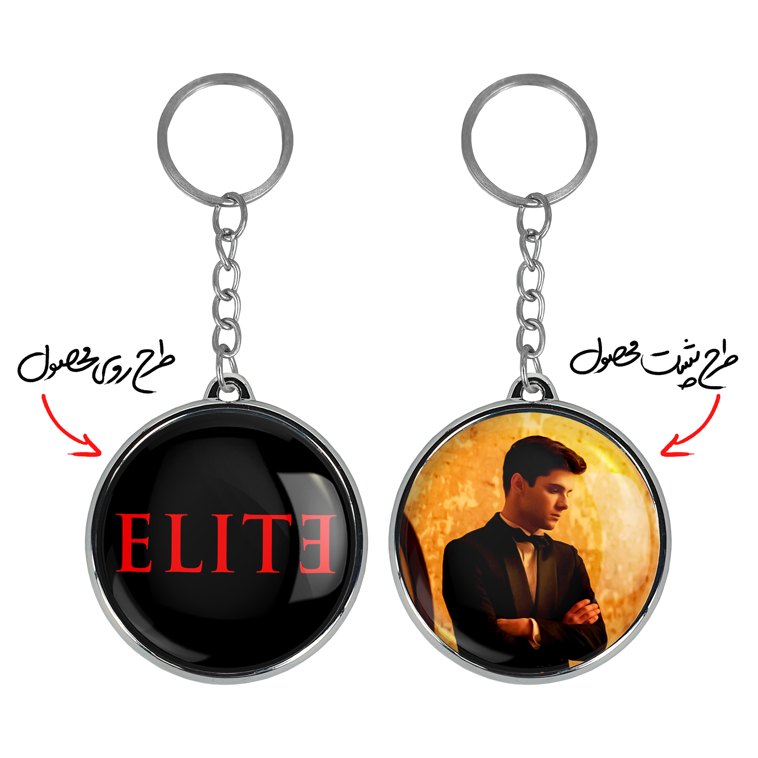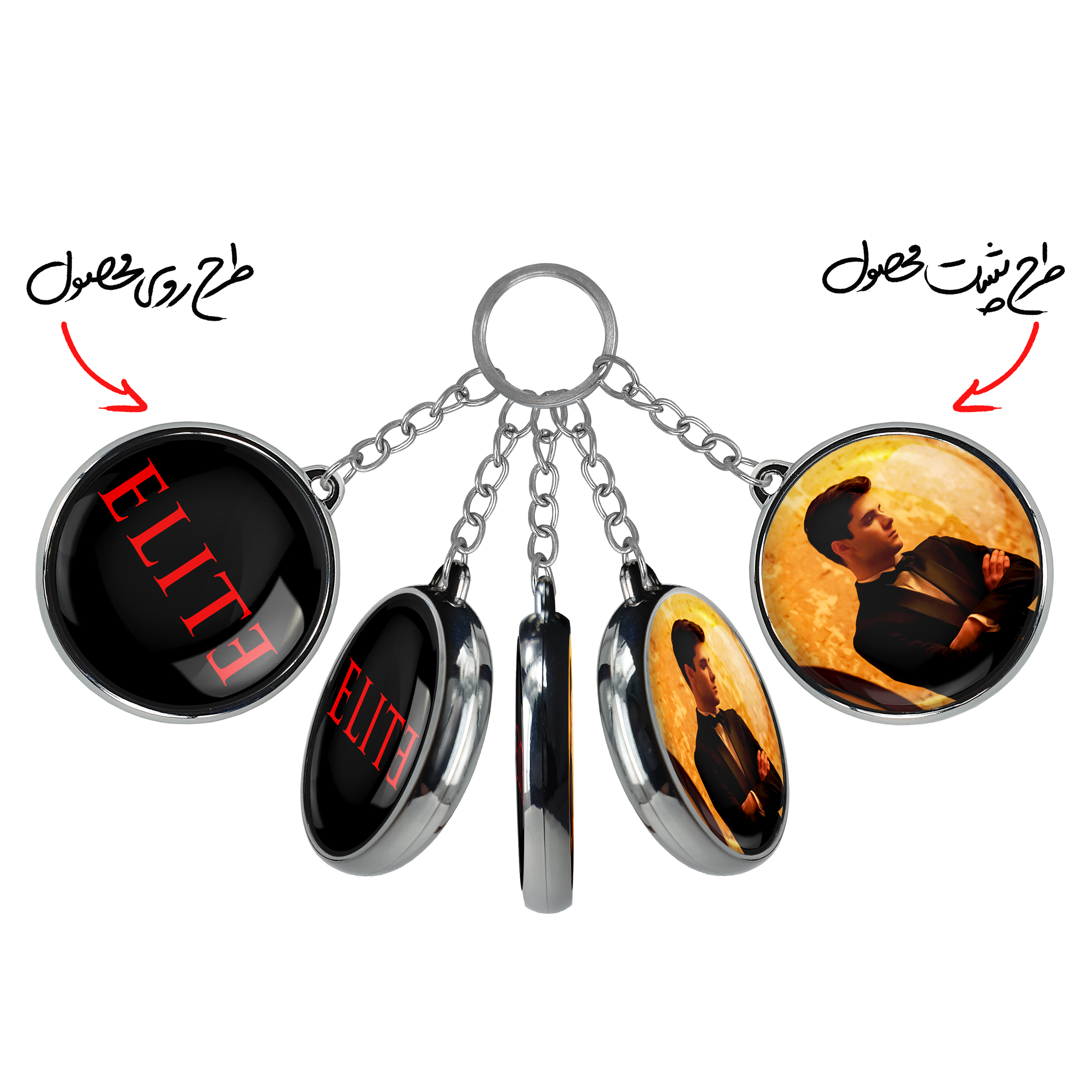 جاکلیدی دوطرفه سریال نخبه Eliteخندالو محصولی کاربردی و جدید است که در هر دو سمت محصول، تصویری متفاوت اما از یک موضوع چاپ شده و تفاوت اصلی آن با جاکلیدی های یک طرفه در همین است که هر دو سمت پشت و روی جاکلیدی، طرحی دیدنی و جذاب دارد. همچنین رینگ بکار برده شده برای دور طرح ها آبکاری کروم درجه یک و رنگ ثابت است و برخلاف سایر محصولات مشابه، از رنگ های متفرقه و یا سفید استفاده نشده، که این مهم، زیبایی محصول نهایی را چند برابر کرده است. جاکلیدی های دوطرفه سریال نخبه Eliteبا استفاده از روکش سلفون براق ضدخش تولید شده که خاصیت ضدخش بودن آن عمر مفید استفاده از جاکلیدی ها را افزایش میدهد. چاپ جاکلیدی ها با دستگاه های استاندارد و با بهترین سطح کیفیت صورت گرفته و طرح با شفافیتی مثال زدنی و با سلفون چسبی تولید شده است که باعث شده محصول نهایی بدون شکست نور دیده شود. همچنین بسته بندی جذاب و مینیمال جاکلیدی دوطرفه سریال نخبه Elite، آنها را محصولی مناسب هدیه کرده است. زنجیر و حلقه بکار برده شده در جاکلیدی خندالو از نوع حلقه ضخیم و محکم بوده و حین استفاده آسیب نمی بیند.
